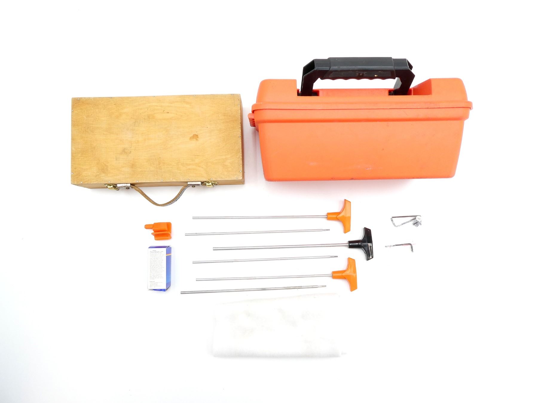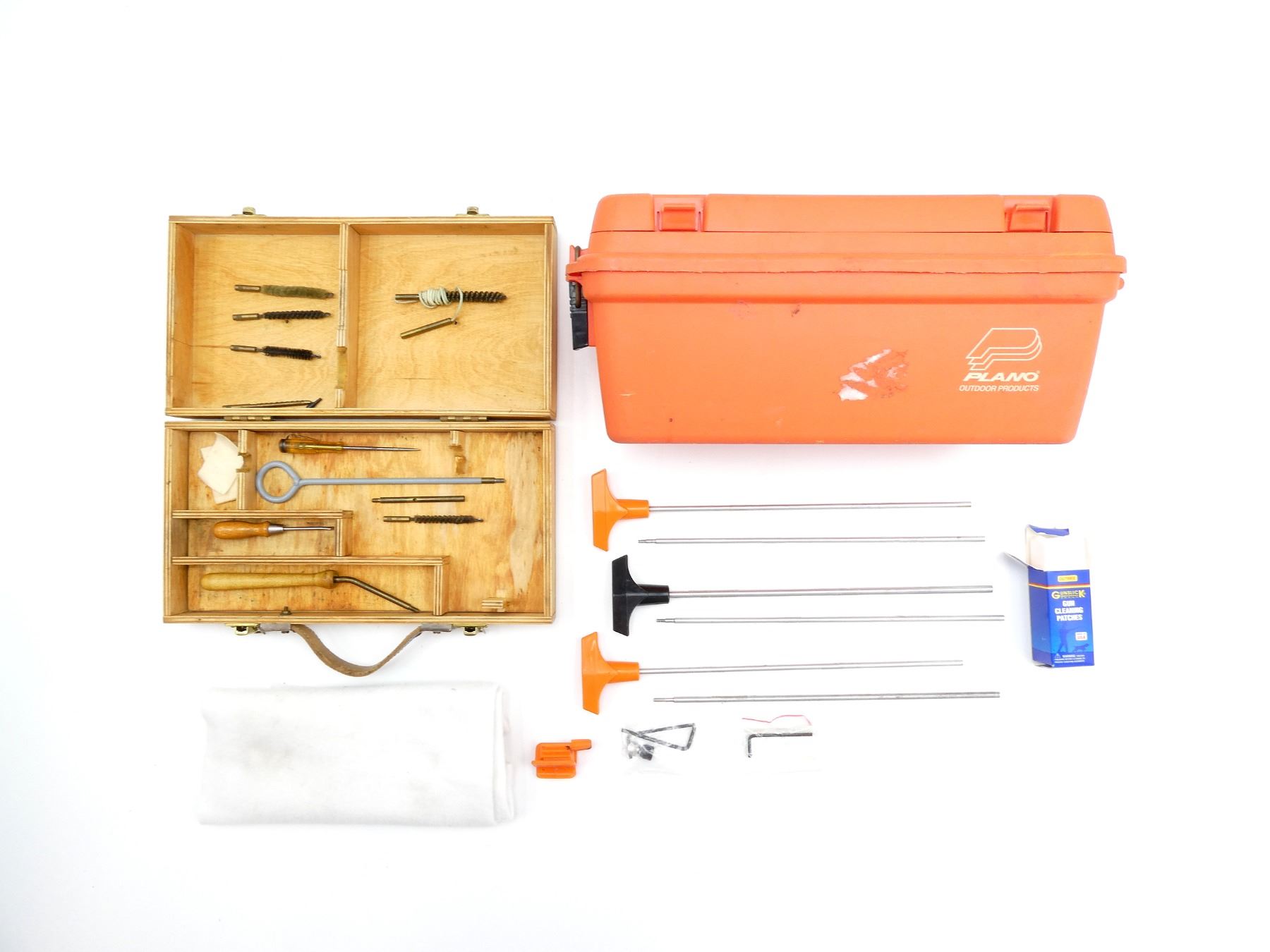 LOT INCLUDES; (1) WOODEN GUN HOBBYIST CASE, BRASS LATCH CLOSURE, LEATHER CARRY HANDLE, APPROX. 12.5" X 6.5" X 3", WITH METAL CLEANING ROD, OAL APPROX. 8", VARIOUS WIRE BRUSHES, PULL THRU, FLAD HEAD SCREW DRIVERS, JAG, ETC. & (1) ORANGE PLASTIC PLANO CLEANING KIT, APPROX. 15" X 8" X 6.75", WITH CLEANING PATCHES, VARIOUS ALLEN KEYS, VARIOUS HOPPE'S CLEANING RODS (ALL INCOMPLETE), OAL'S APPROX. 11 5/8" TO 23.75", ETC. SEE PHOTOS.