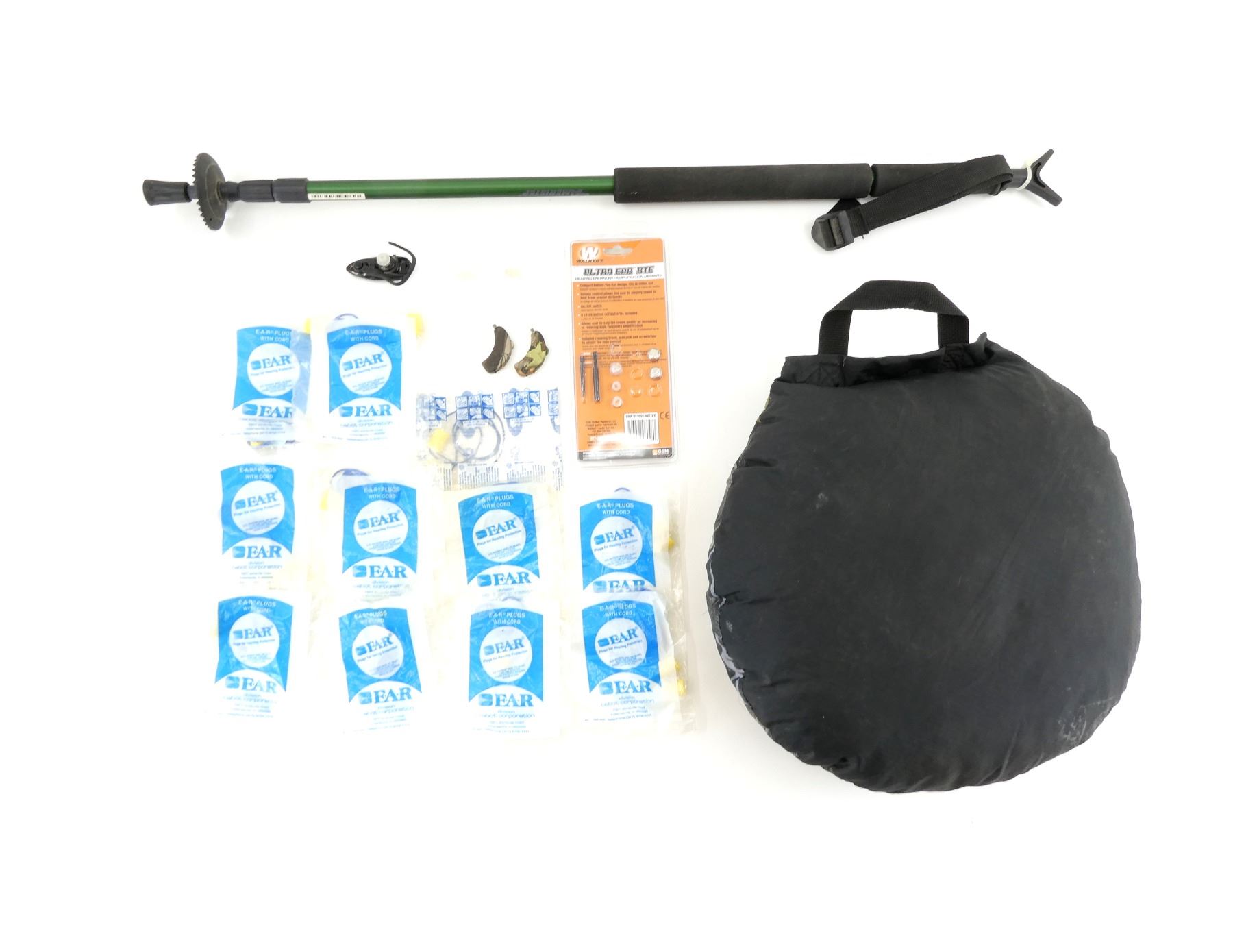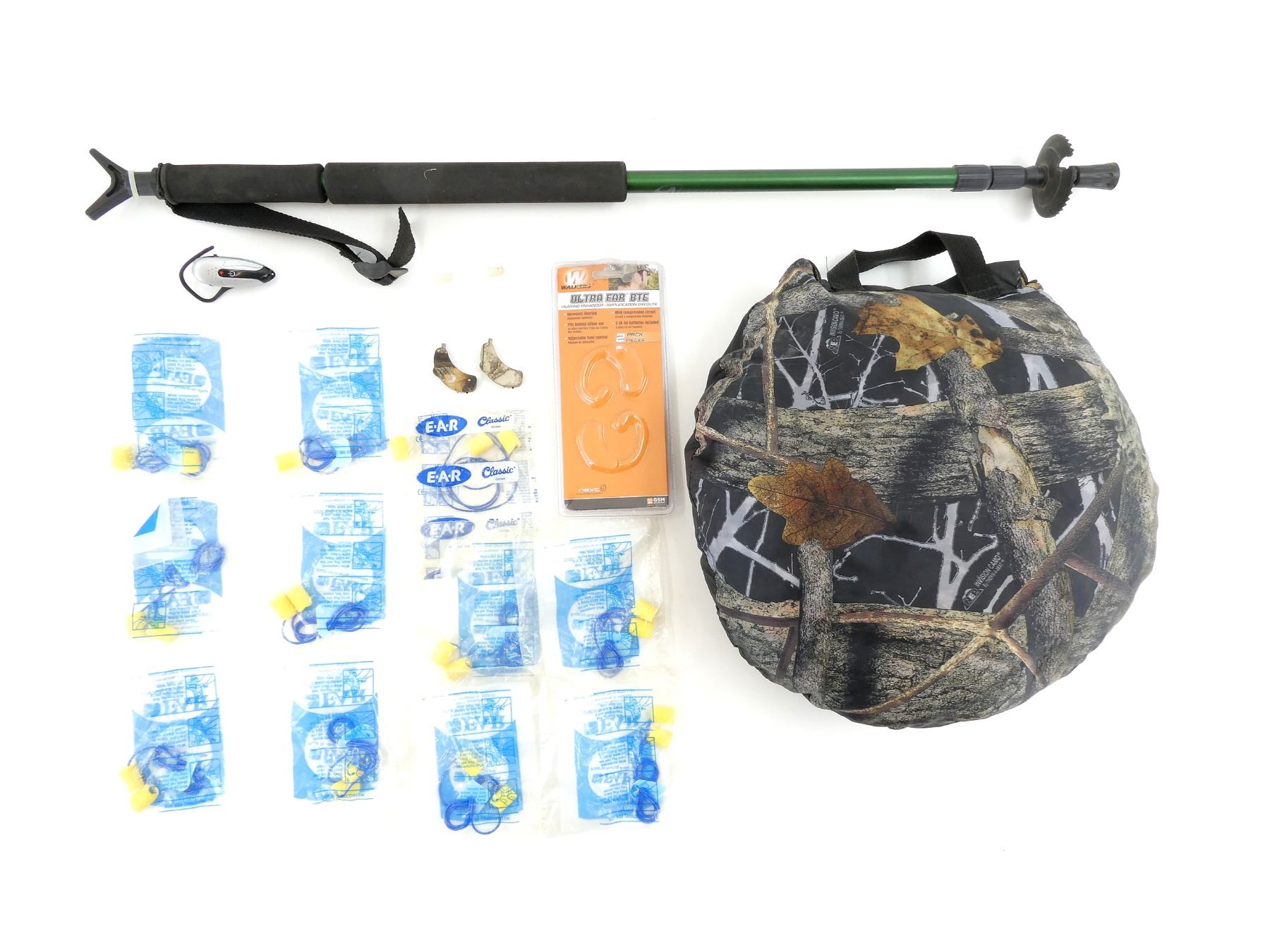 LOT INCLUDES; (1) AMERISTEP SHOOTING STICK, RUBBER FOOT, EXTENDABLE, TWISTS TO LOCK IN PLACE, NYLON STRAP, ADJUSTABLE, WHEN EXTENDED OAL APPROX. 55.25", (1) NEP THERM-A-SEAT CUSHION, INVISION CAMO PATTERN, NYLON CARRY HANDLE, (1) SET OF WALKERS ULTRA EAR BTE HEARING ENHANCER, NOT TESTED, WITH EXTRA RUBBER EAR PIECES, CLEANING PICKS, ADJUSTABLE VOLUME, WITH ORIGINAL PACKAGING, (1) BELL + HOWELL HEARING ENHANCER / AMPLIFIER, TURNS ON , NOT FULLY TESTED & APPROX. (11) CORDED FOAM EAR PLUGS, NOS, IN ORIGINAL PACKAGING. SEE PHOTOS.