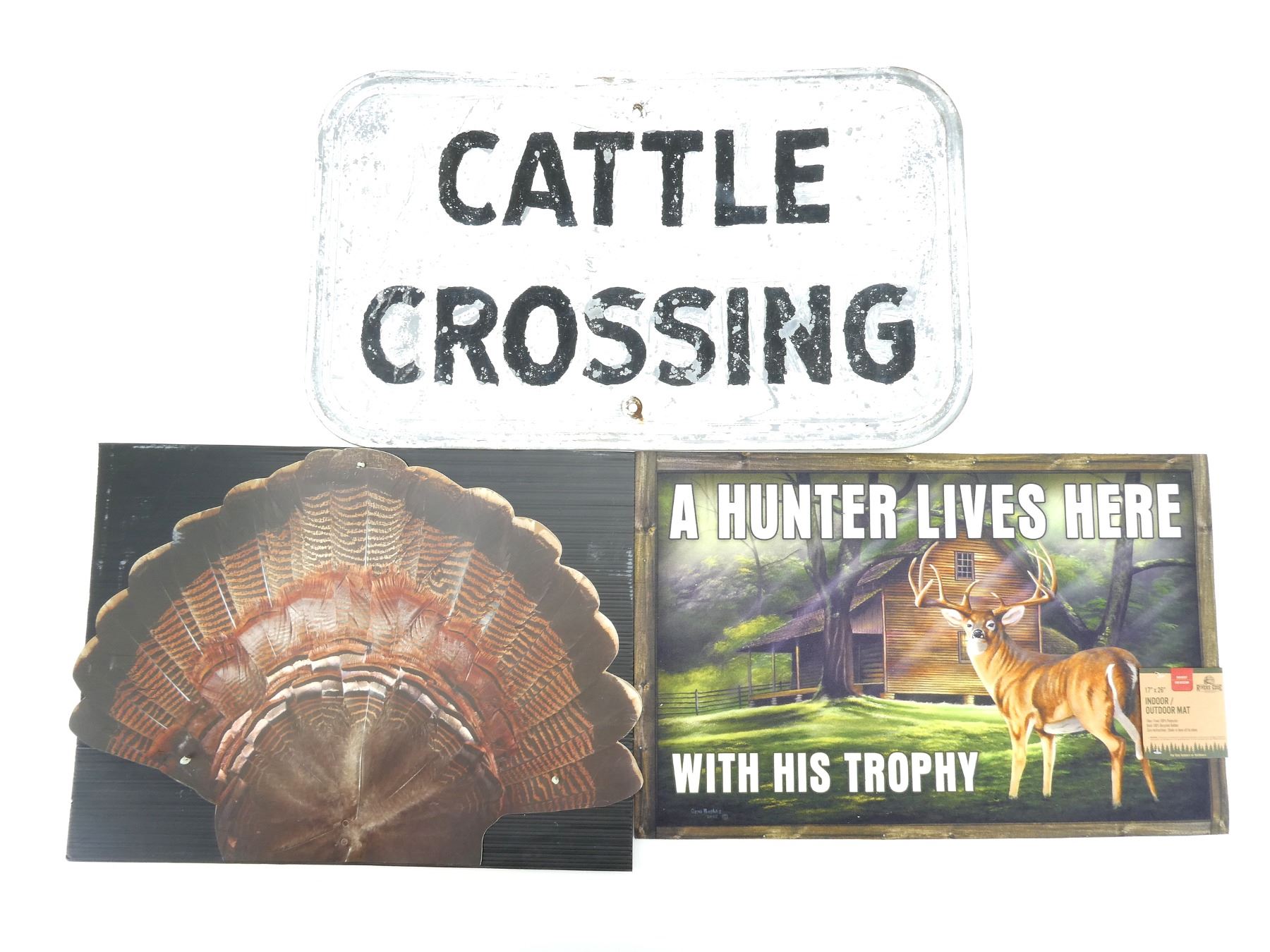 LOT INCLUDES; (1) METAL CATTLE CROSSING SIGN, BLACK / WHITE HAND PAINTED, TWO HOLES FOR HANGING, APPROX. 30" X 18", (1) RIVERS EDGE INDOOR / OUTDOOR FLOOR MAT, APPEARS NOS, TAGS STILL ATTACHED, APPROX. 26" X 17" & (1) CARDBOARD BOARD TURKEY FAN PICTURE, APPROX. 25 1/8" X 18 1/8". SEE PHOTOS.