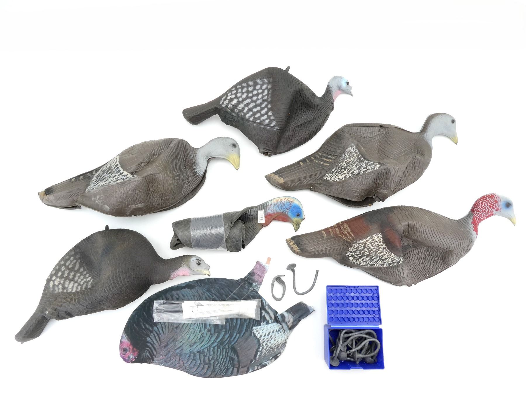 LOT INCLUDES; (7) FOAM / PLASTIC TURKEY DECOYS, VARIOUS SIZES / COLOURS, VARIOUS MARKINGS, SHOWS WEAR / TEAR & APPROX. (16) LEAD DECOY WEIGHTS IN PLASTIC CONTAINER, VARIOUS SIZES. SEE PHOTOS.