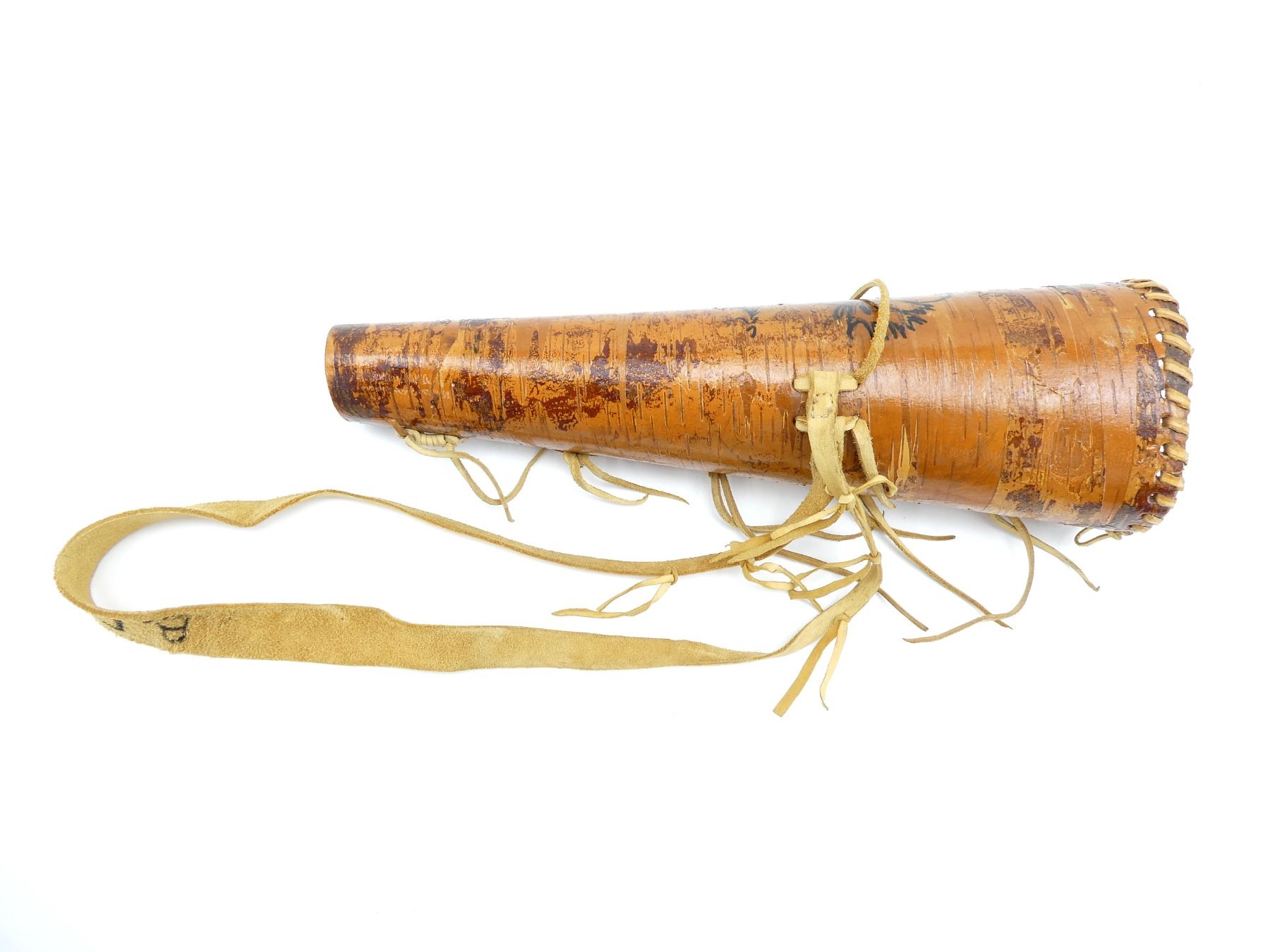 (1) BIRCH BARK MOOSE CALL, VARIOUS MARKINGS, TAN LEATHER / HIDE SHOULDER STRAP, GLOSSY FINISH, OAL APPROX. 18.5". SEE PHOTOS.