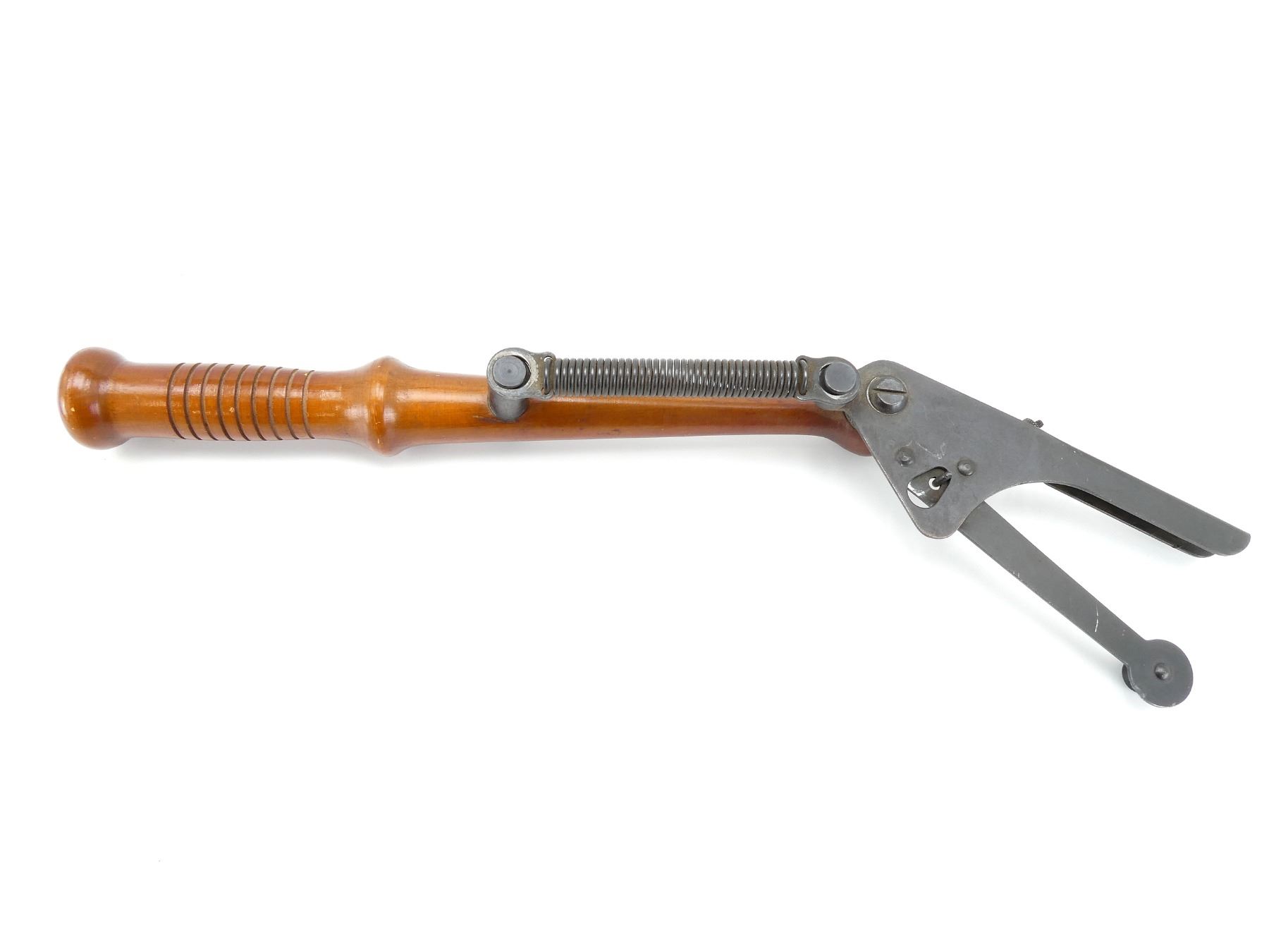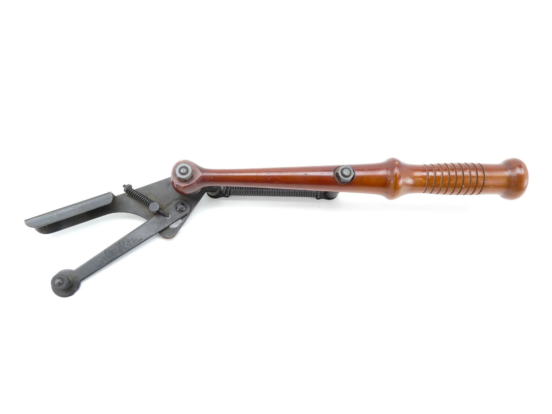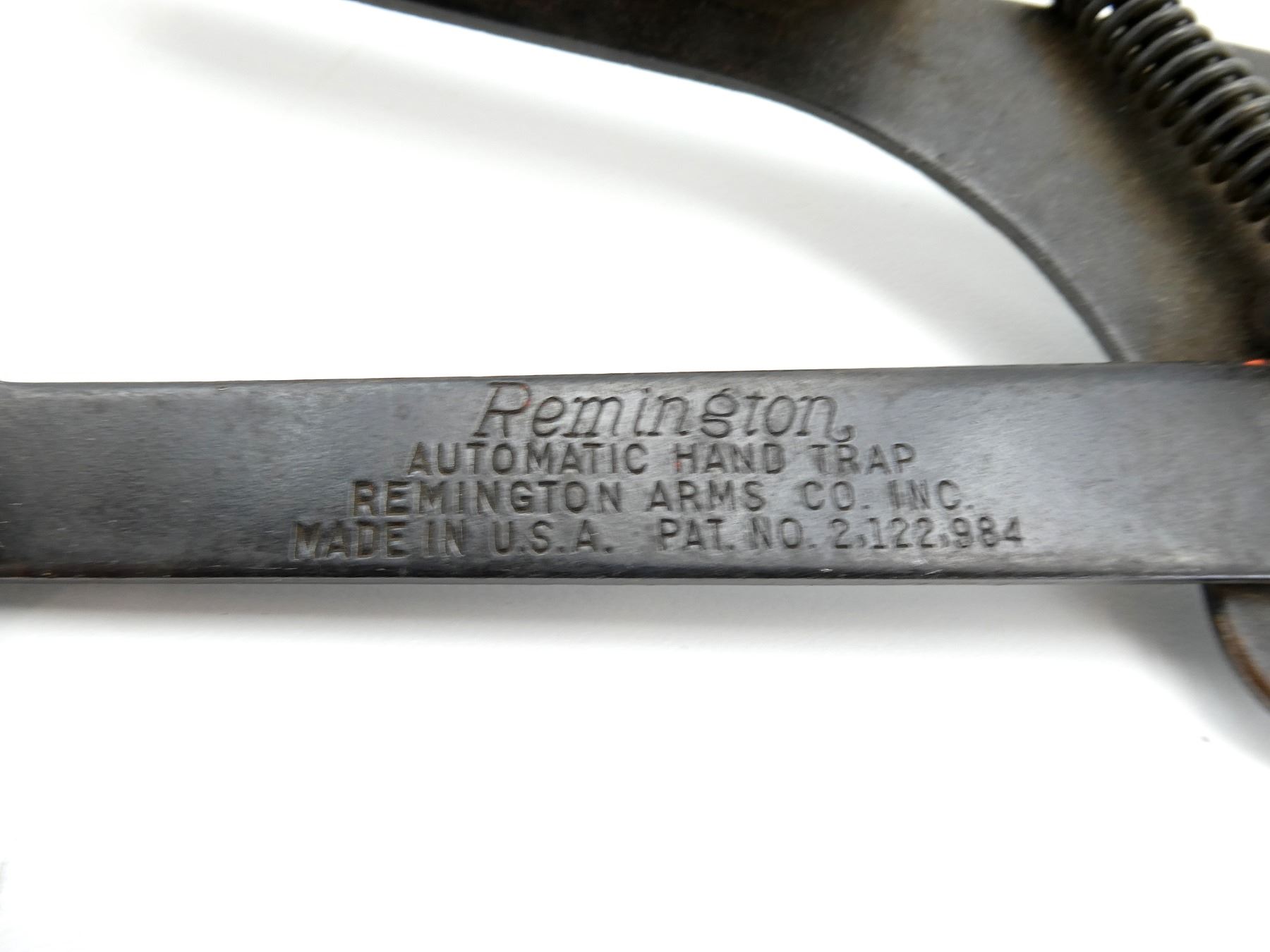 (1) CLAY THROWER, METAL / WOOD CONSTRUCTION, RIGHT HANDED, MARKED: "REMINGTON, AUTOMATIC HAND TRAP, REMINGTON ARMS CO. INC., MADE IN U.S.A." ETC., WOODEN HANDLE, OAL APPROX. 18 5/8". SEE PHOTOS.