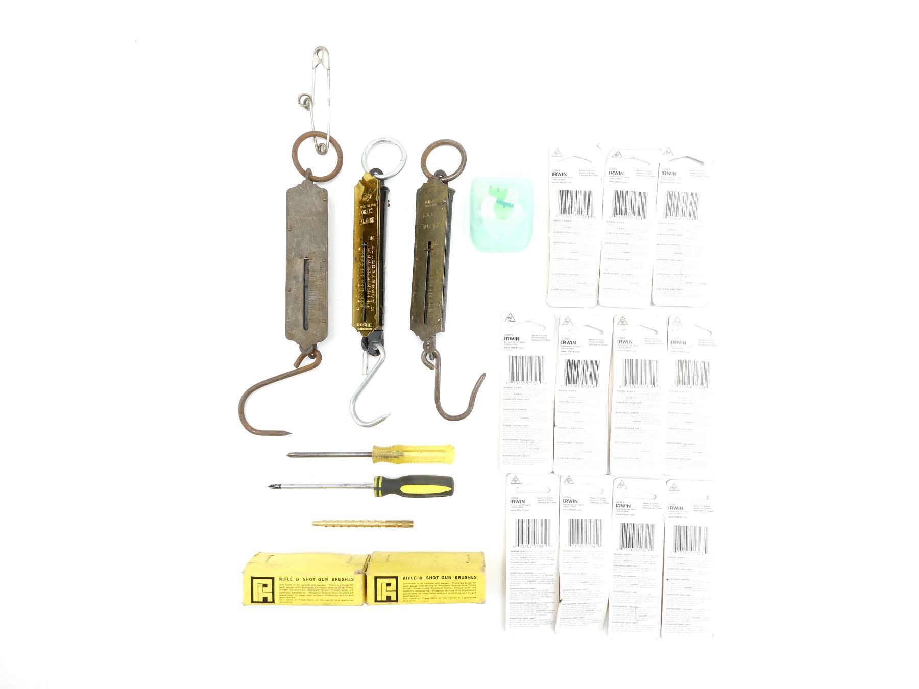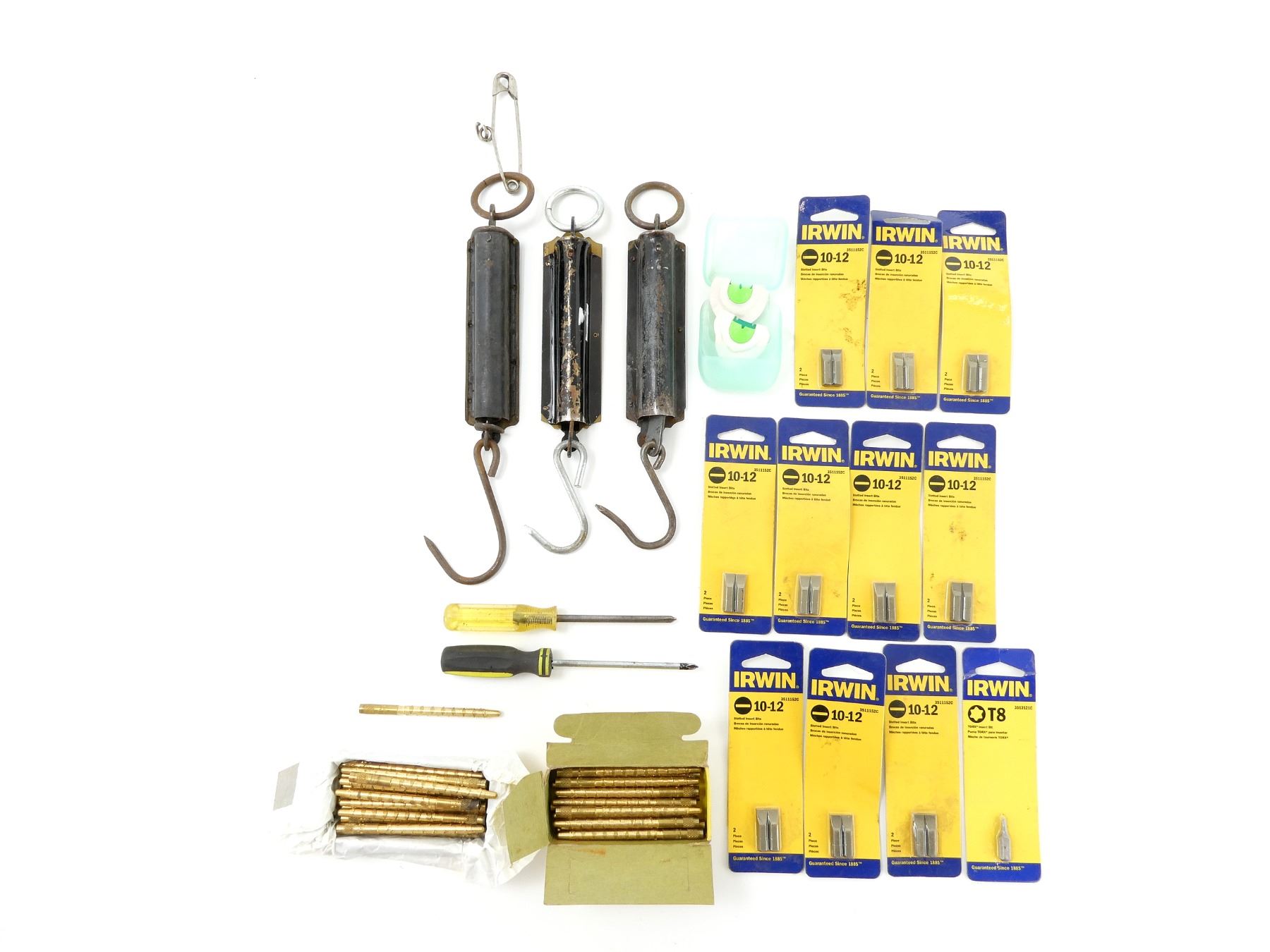 LOT INCLUDES; APPROX. (42) PARKER & HALE .303 CAL. BRASS JAGS, MARKED: "PARKER-HALE, LIST NO. J30, MADE IN ENGLAND", WITH ORIGINAL PACKAGING, (11) IRWIN DRILL BITS, SIZE 10-12 SLOTTED INSERT BITS & T8 TORX INSERT BIT, NOS, UN-OPENED PACKAGING, (1) PHILIPS NO. 1 SCREW DRIVER, (1) PHILIPS SCREW DRIVER, (3) POCKET BALANCES, METAL CONSTRUCTION, WITH LOOPS / HOOKS, VARIOUS MARKINGS, 0 TO 50 LBS & (1) PRIMOS CASE WITH 2 UNKNOWN GAME CALLS INSIDE. SEE PHOTOS.