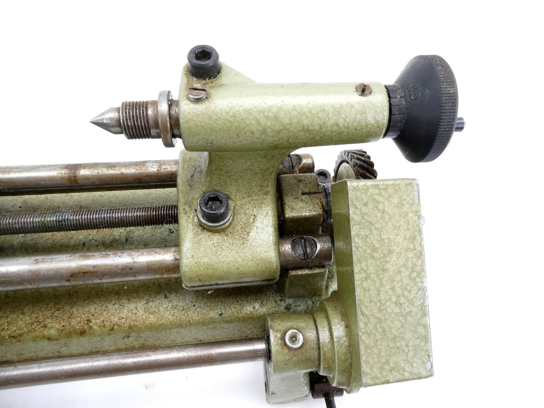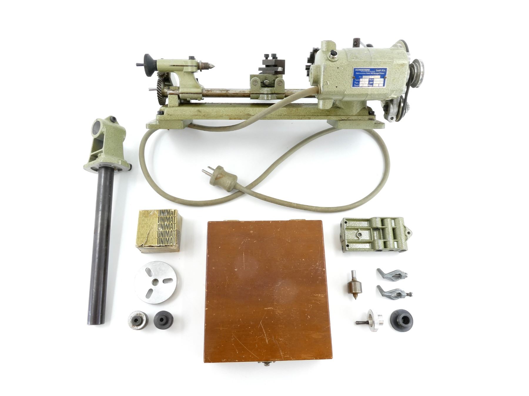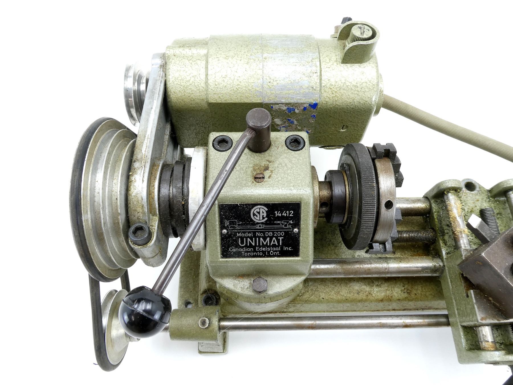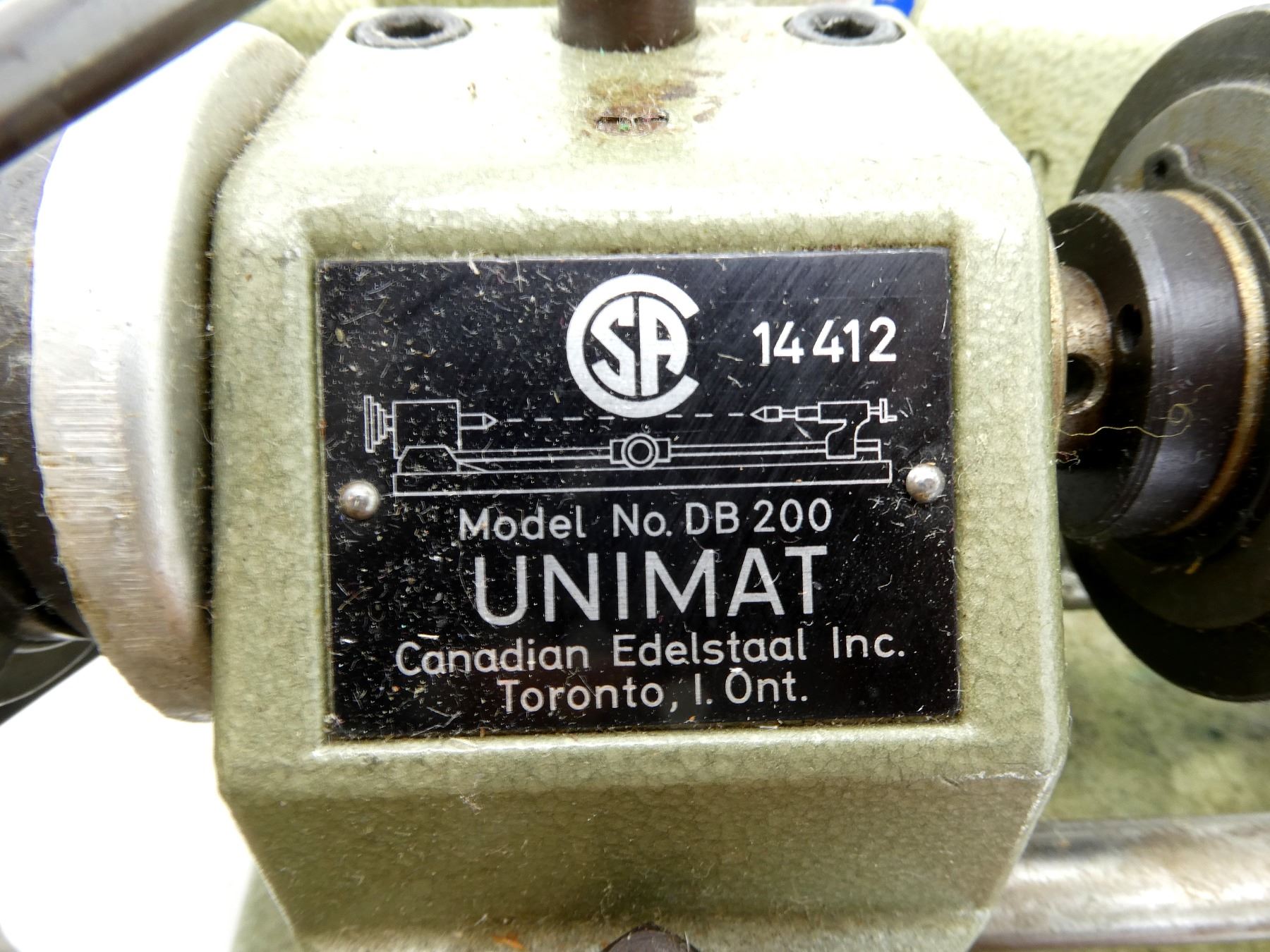 LOT INCLUDES; (1) TABLE TOP LATHE, MFG'D BY: EMCO-UNIMAT, CANADIAN EDELSTAAL INC., MODEL NO. DB 200, WORKING CONDITION, TURNS ON, VARIOUS PARTS ROTATE, MADE OF CAST ALUMINUM-ZINK, PAINTED HAMMERTONE GREEN, INCLUDES; (1) WOOD STORAGE BOX WITH VARIOUS ALLEN KEYS, VISE, VARIOUS CUTTERS, WRENCH, SPINDLE, CLAMPS, ETC., BOX APPROX. 8" X 7 1/8" X 2.5". SEE PHOTOS. *EXTRA SHIPPING CHARGES MAY APPLY*