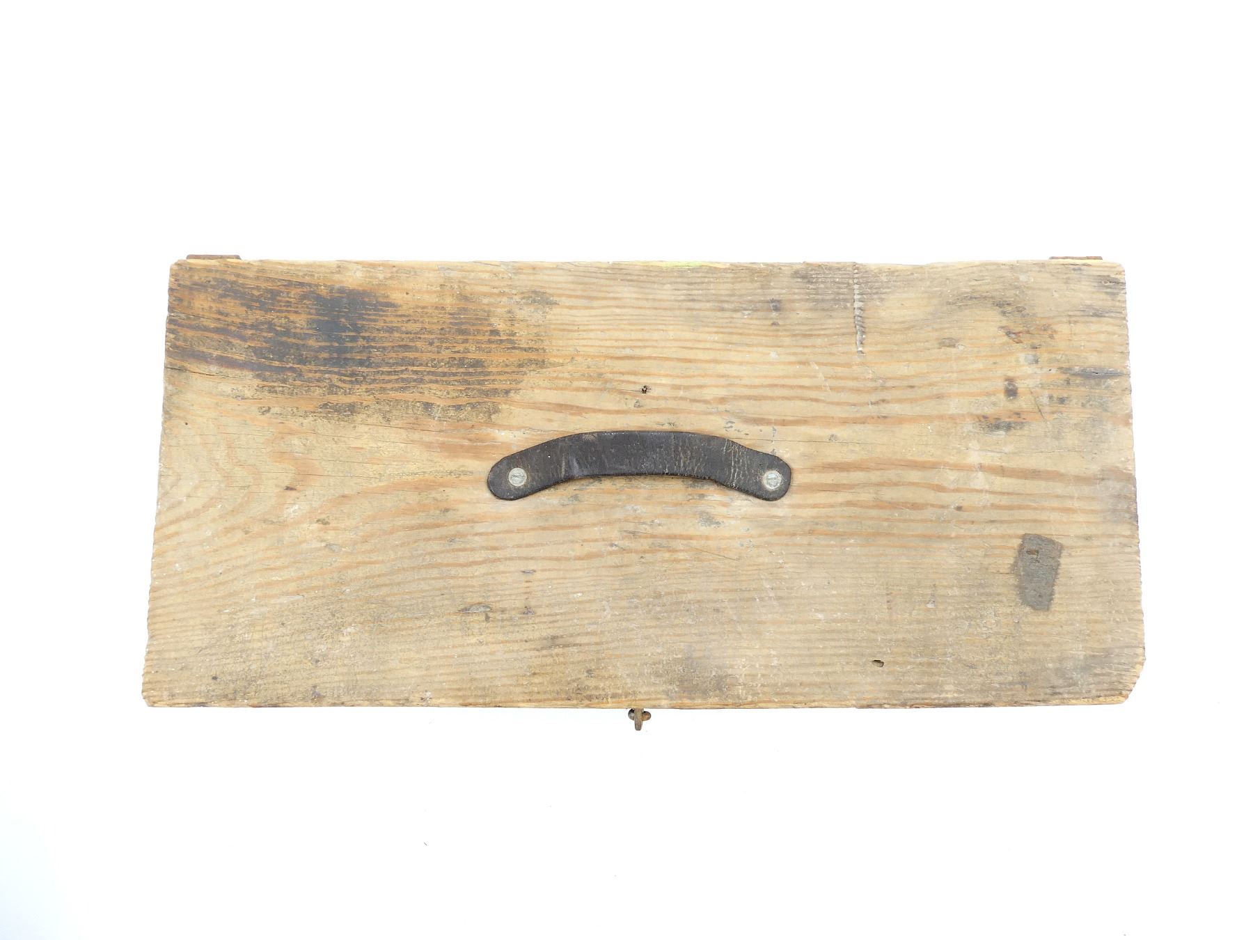 (1) WOODEN CRATE WITH BROWN LEATHER CARRYING HANDLE & METAL FITTINGS, MARKED: "WINCHESTER", "SMALL ARMS AMMUNITION, SHOT GUN", ETC., APPROX. 20.5" X 10" X 11". SEE PHOTOS.