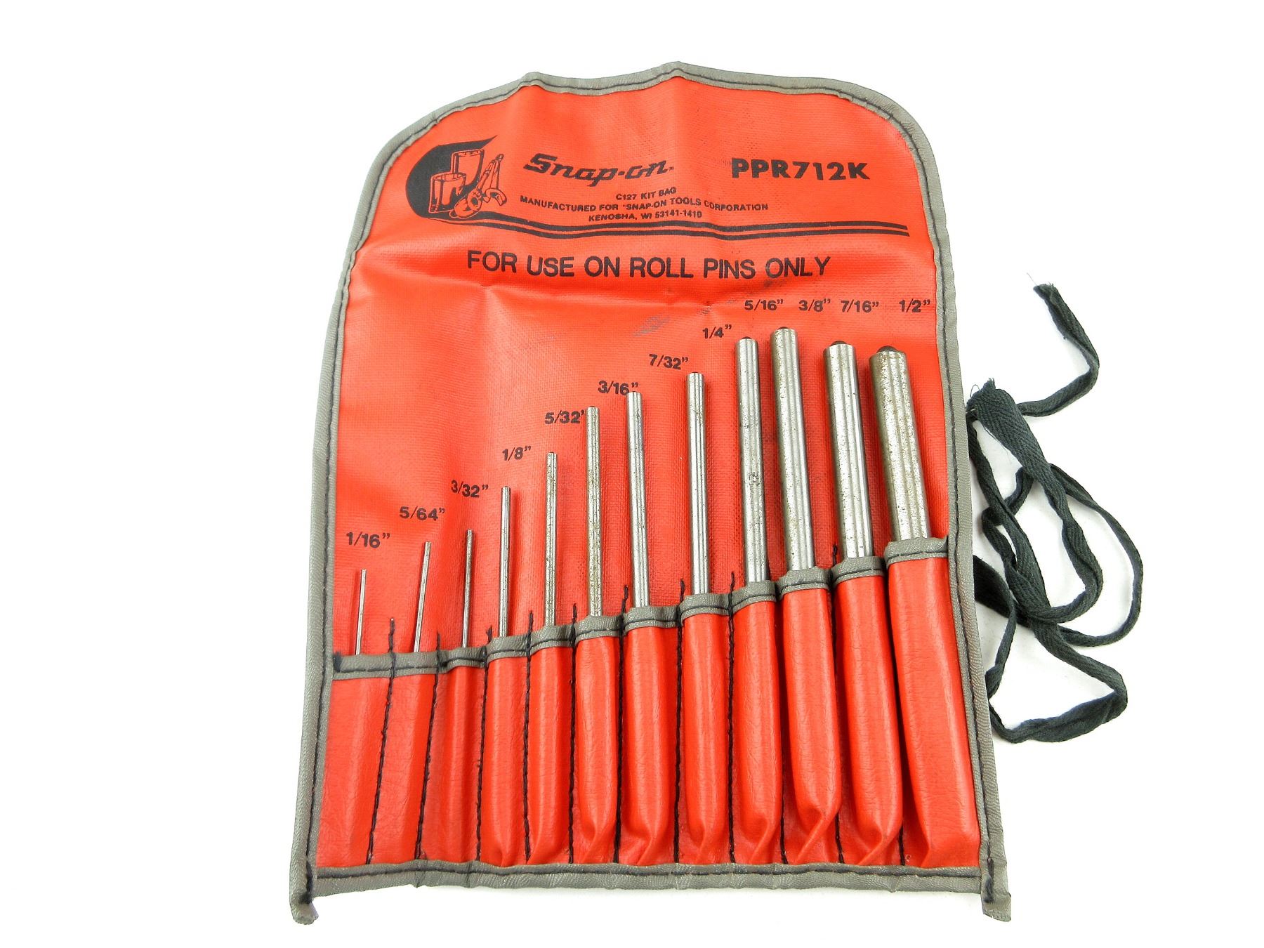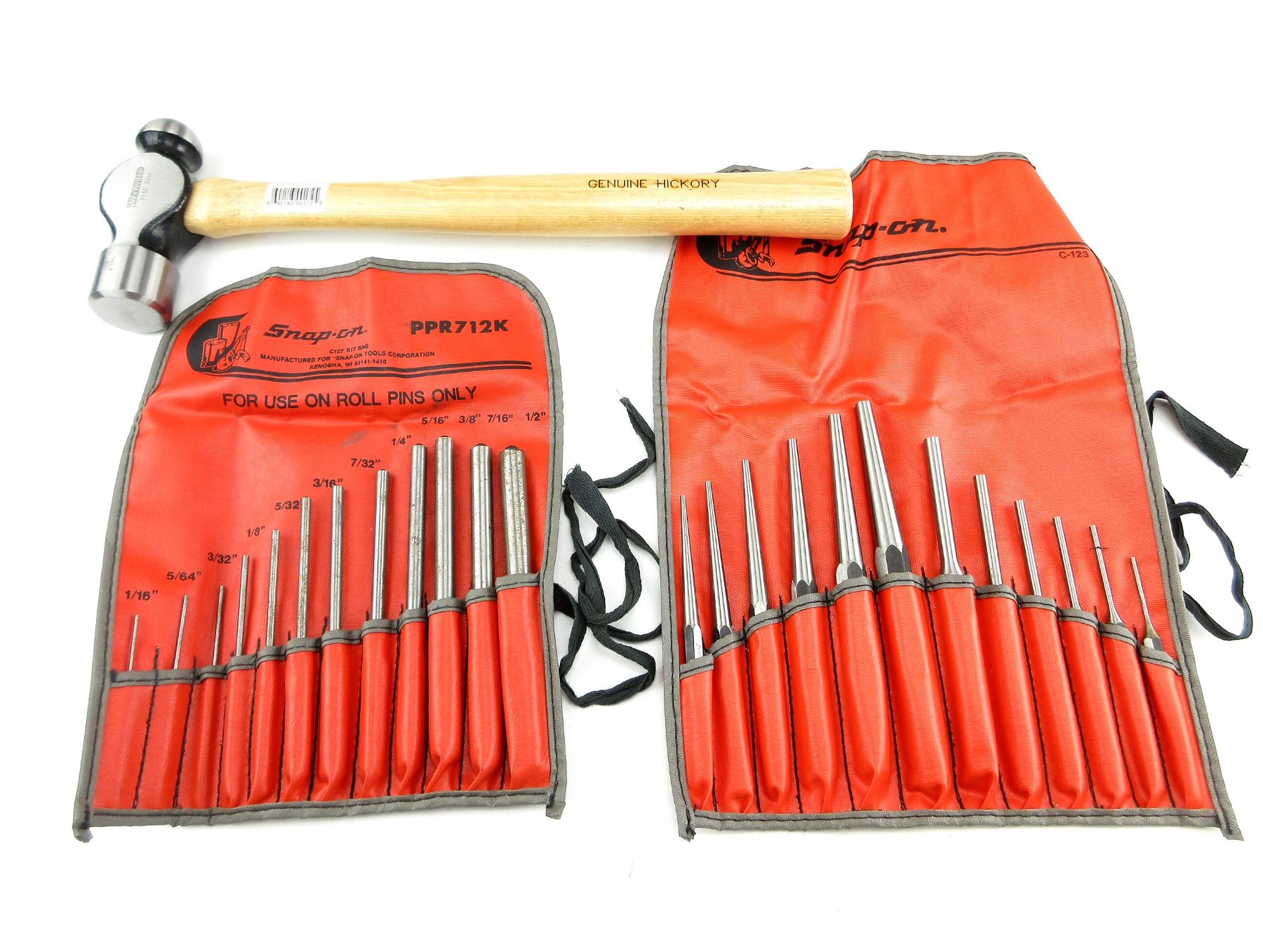 LOT INCLUDES; (1) "SNAP-ON TOOLS C-123" PUNCH SET, (1) "SNAP-ON TOOLS PPR712K ROLL PIN" PUNCH SET & (1) WESTWARD HAMMER, PART #: 7132, 32 OZ.'S, HICKORY HANDLE. SEE PHOTOS.