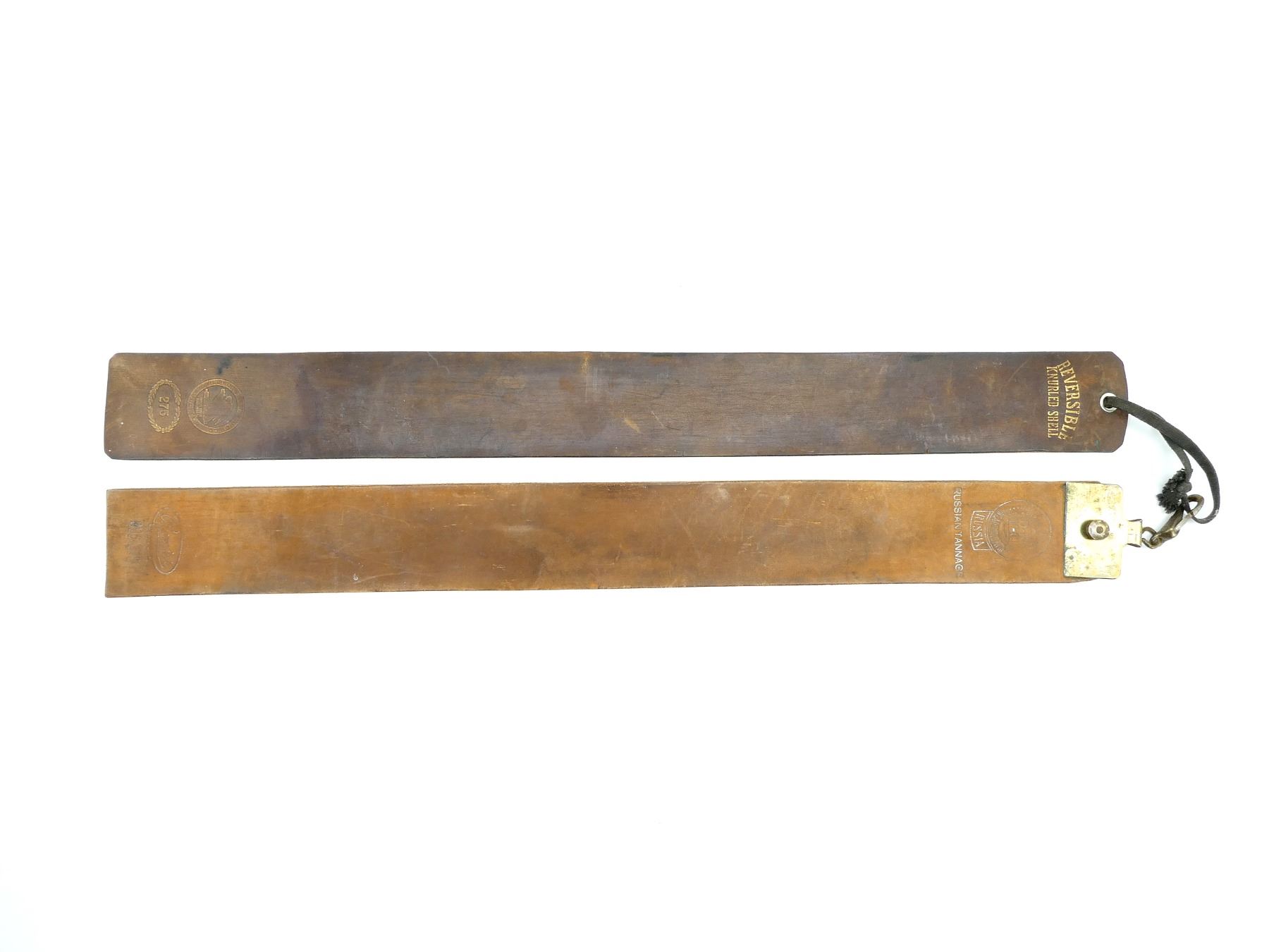 LOT INCLUDES; (2) BROWN LEATHER STRAIGHT RAZOR SHARPENING STRAPS, VARIOUS MARKINGS, APPROX. 2.5" WIDE & OAL APPROX. 23.75". SEE PHOTOS.