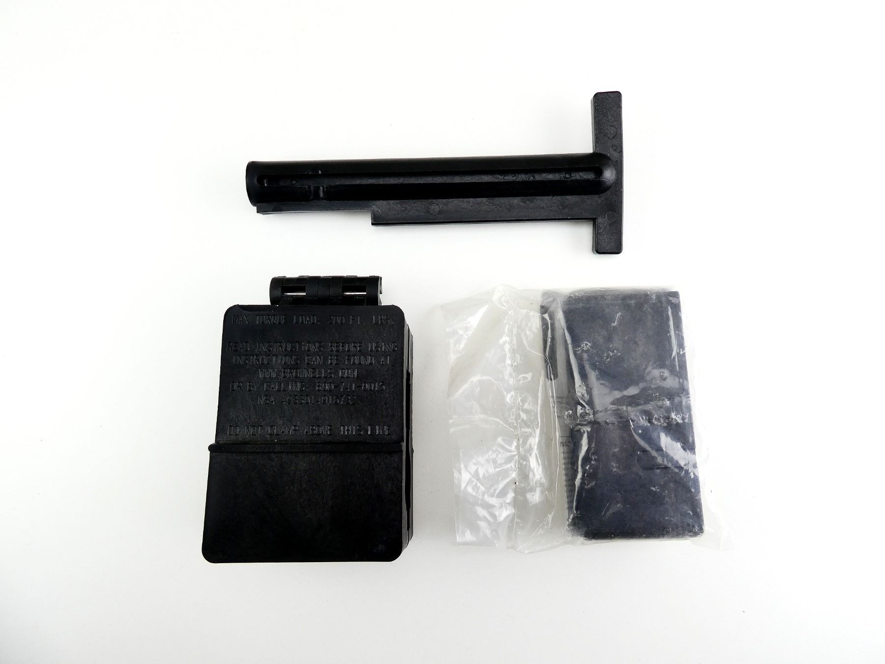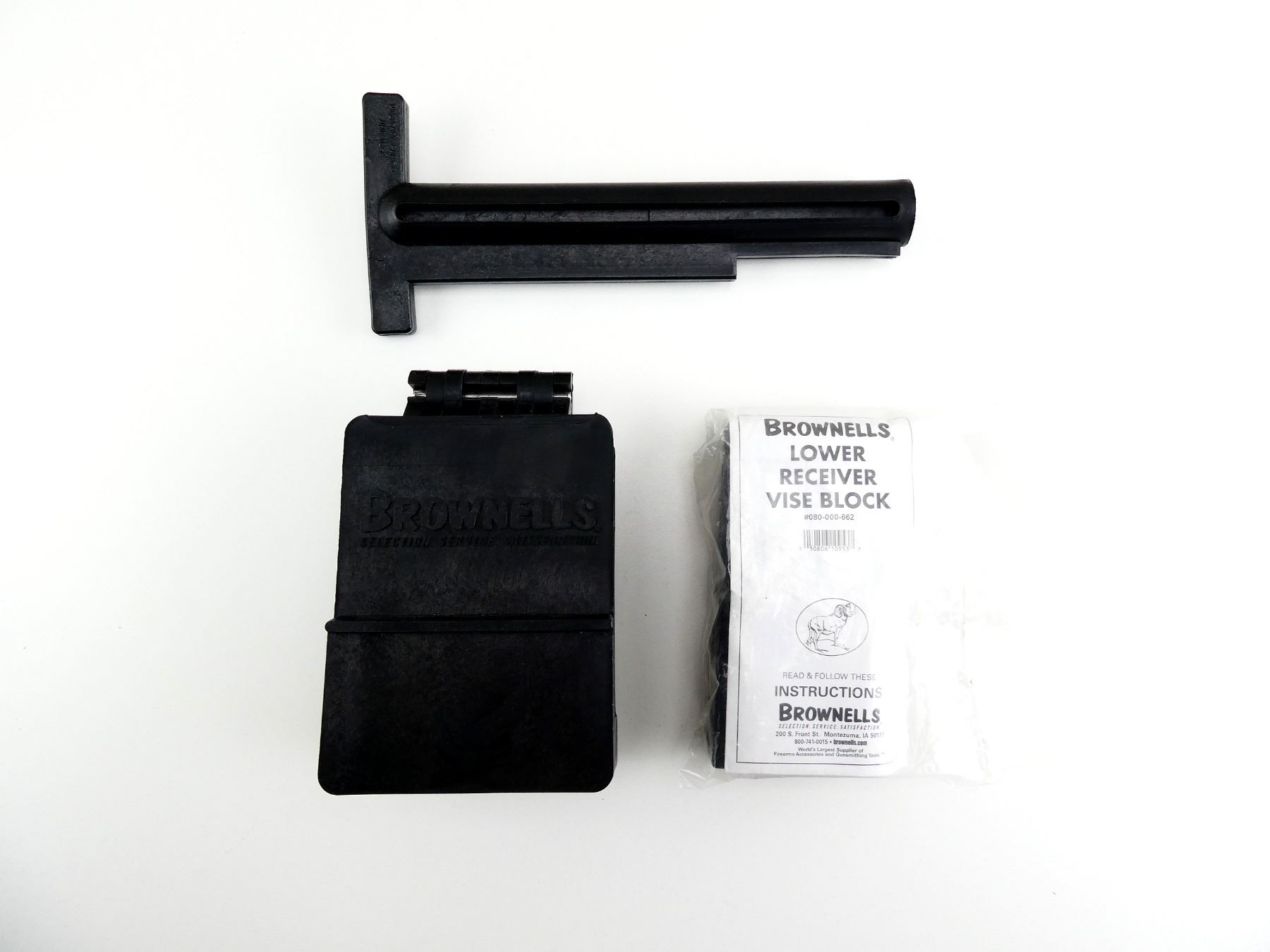 LOT INCLUDES; (1) UPPER VISE BLOCK, BLACK POLYMER, MARKED: "BROWNELL'S" & (1) LOWER RECEIVER VISE BLOCK, BLACK POLYMER, APPEARS NOS IN SEALED PACKAGING. SEE PHOTOS.