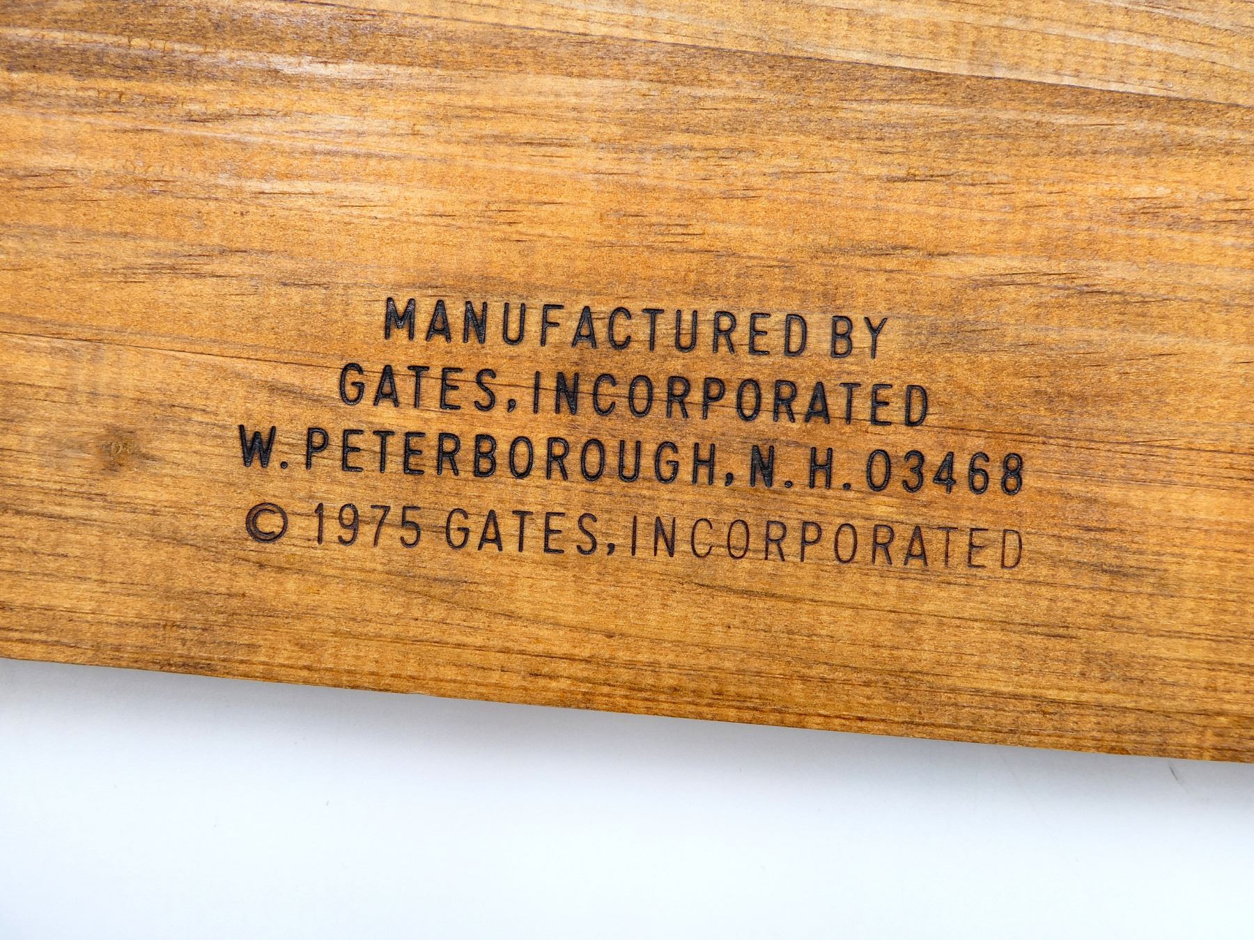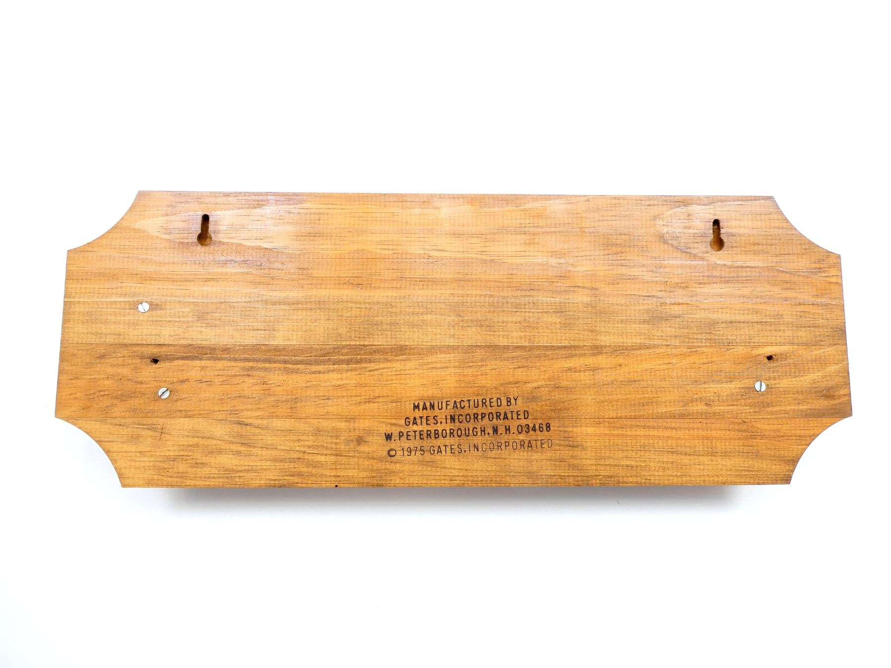 (1) WOOD SINGLE GUN RACK WITH IMITATION ANTLER HOOKS (HOOKS ARE LOOSE), FRONT MARKED: "WINCHESTER", BACK MARKED: "GATES INCORPORATED W. PETERBOROUGH, N.H.", ETC., APPROX. 24" X 9" X 3". SEE PHOTOS.