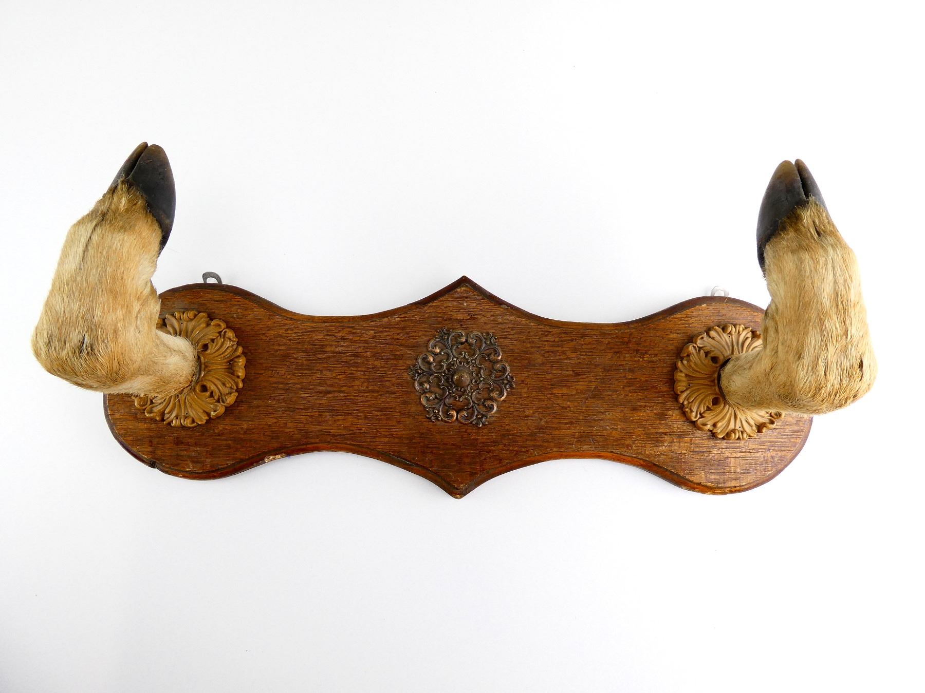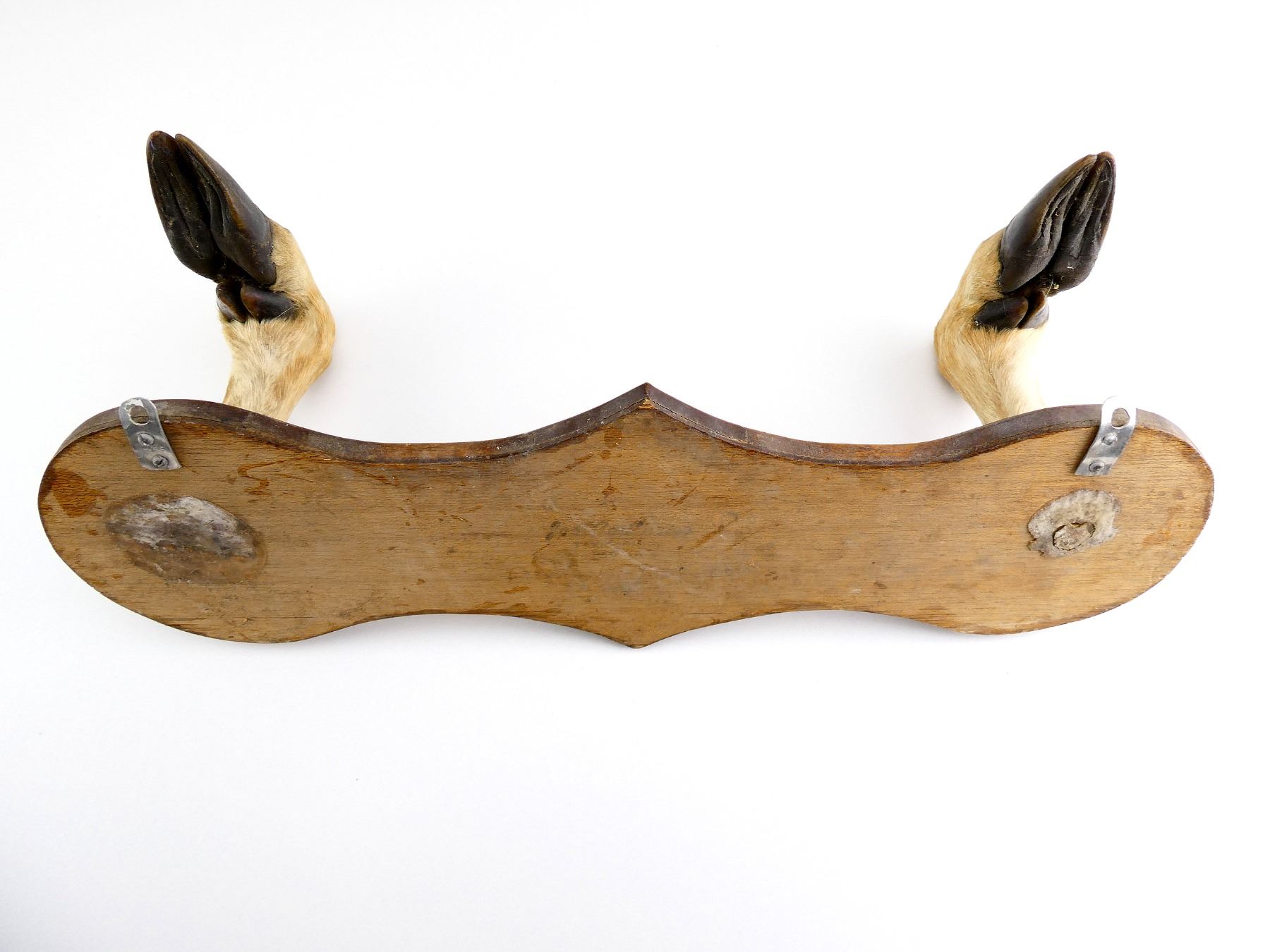 (1) WOOD SINGLE GUN RACK WITH HOOF HOOKS (HOOKS ARE LOOSE), UNMARKED, APPROX. 18.5" X 5 7/8" X 6.25". SEE PHOTOS.