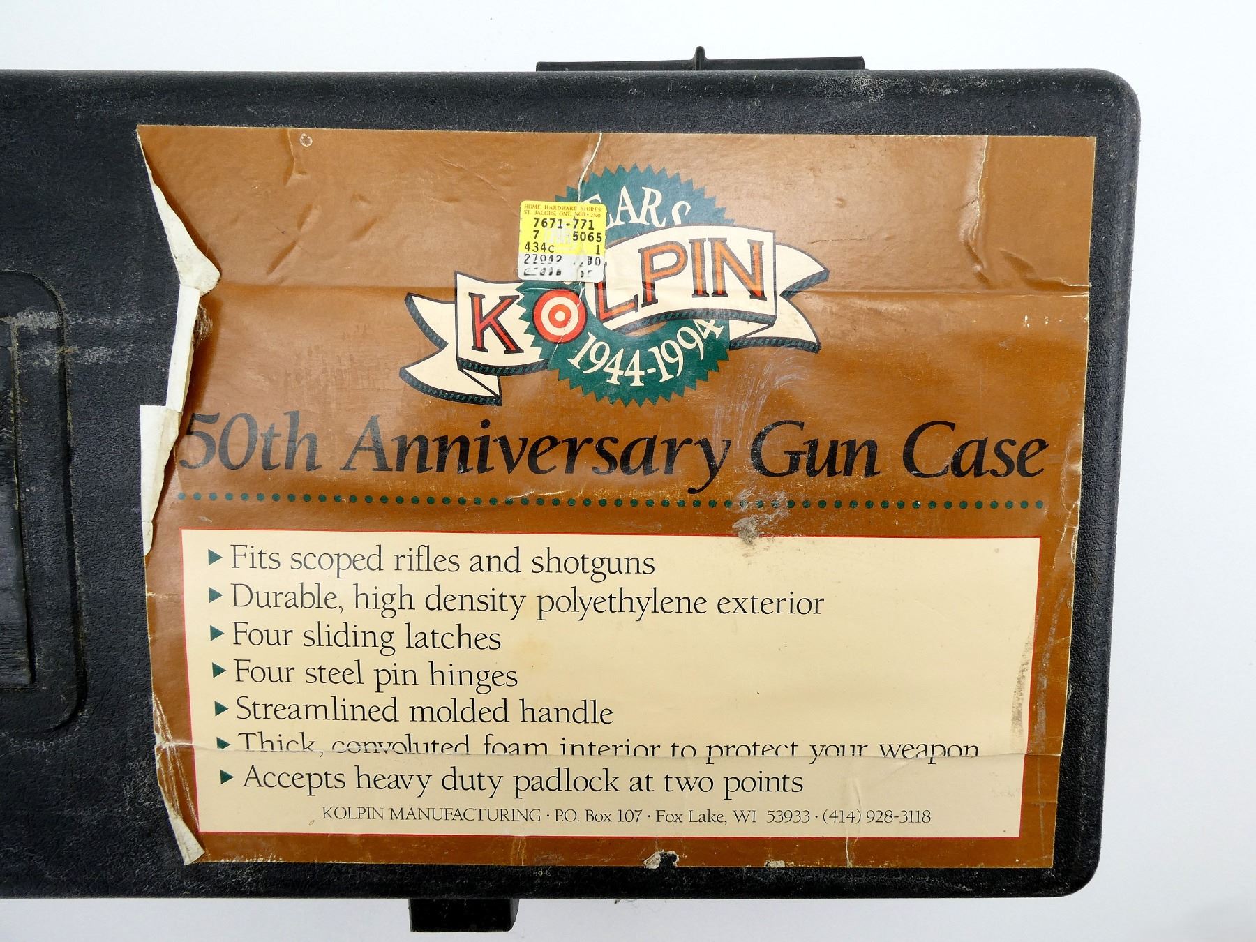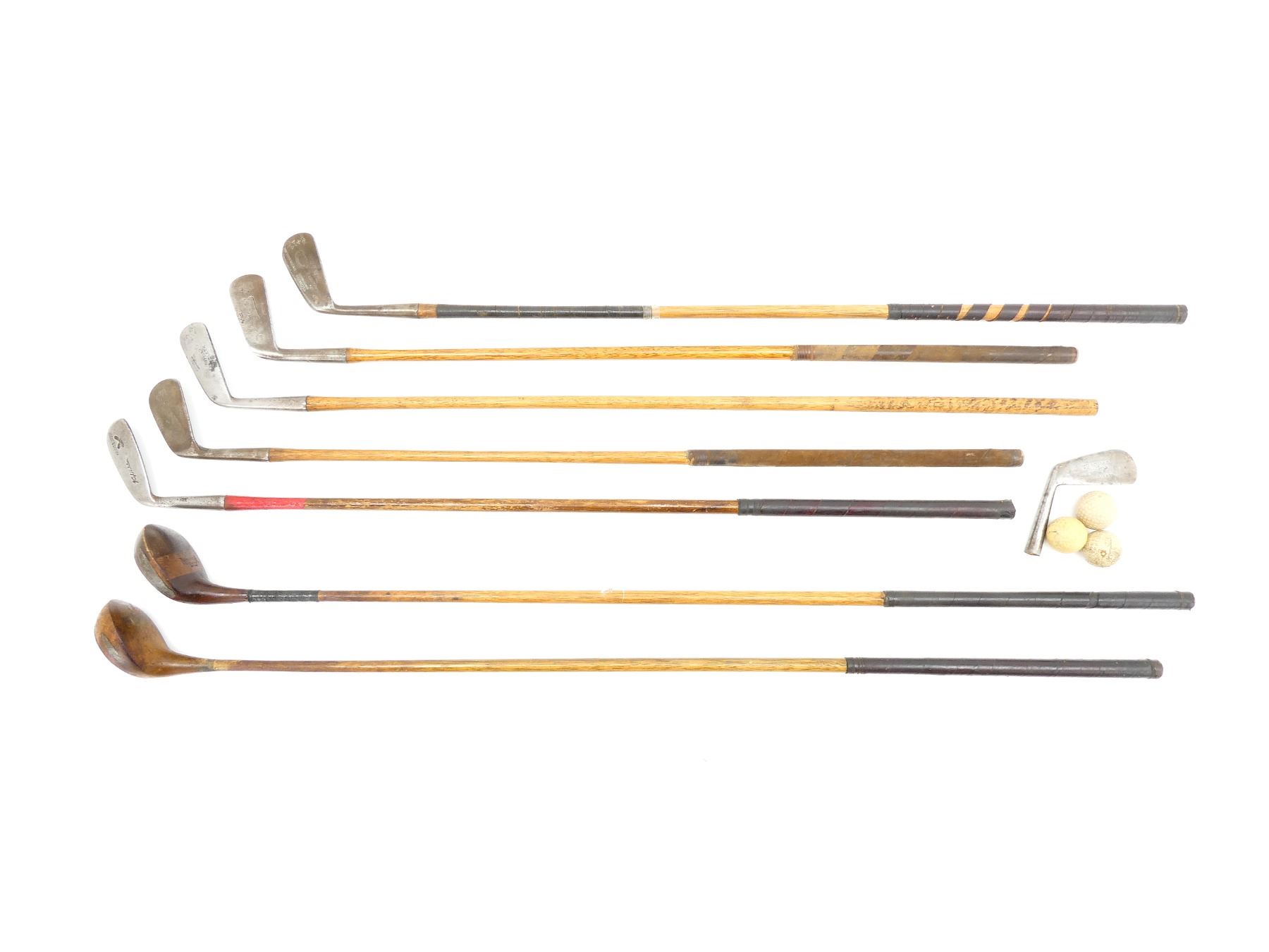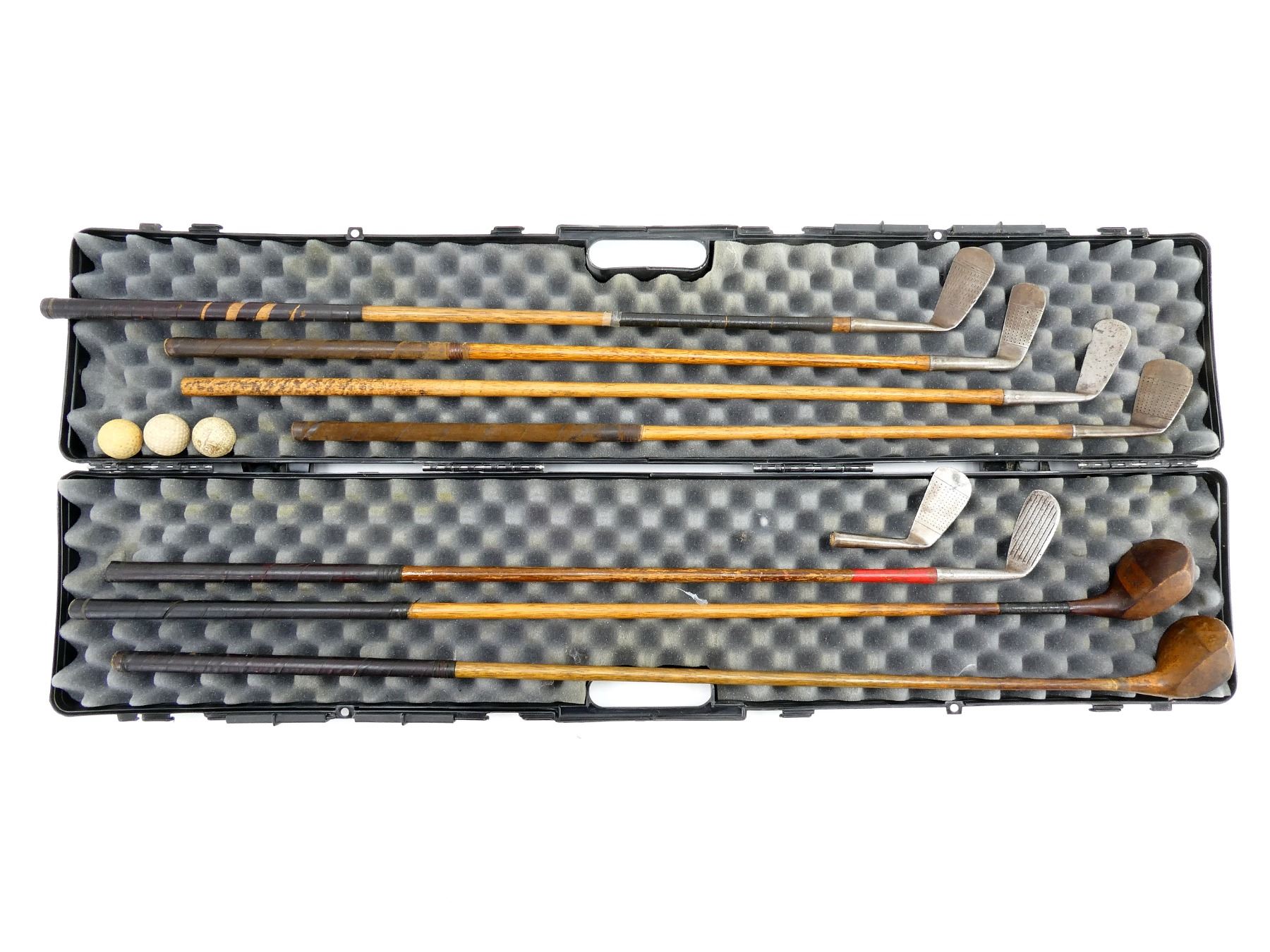 LOT INCLUDES; (7) ASSORTED VINTAGE GOLF CLUBS, WOOD SHAFTS, METAL HEADS WITH VARIOUS MARKINGS, OAL'S APPROX. 36.25"-44", (3) GOLF BALLS & (1) KOLPIN 50TH ANNIVERSARY HARD PADDED RIFLE CASE, BLACK, OAL APPROX. 37.25. SEE PHOTOS.