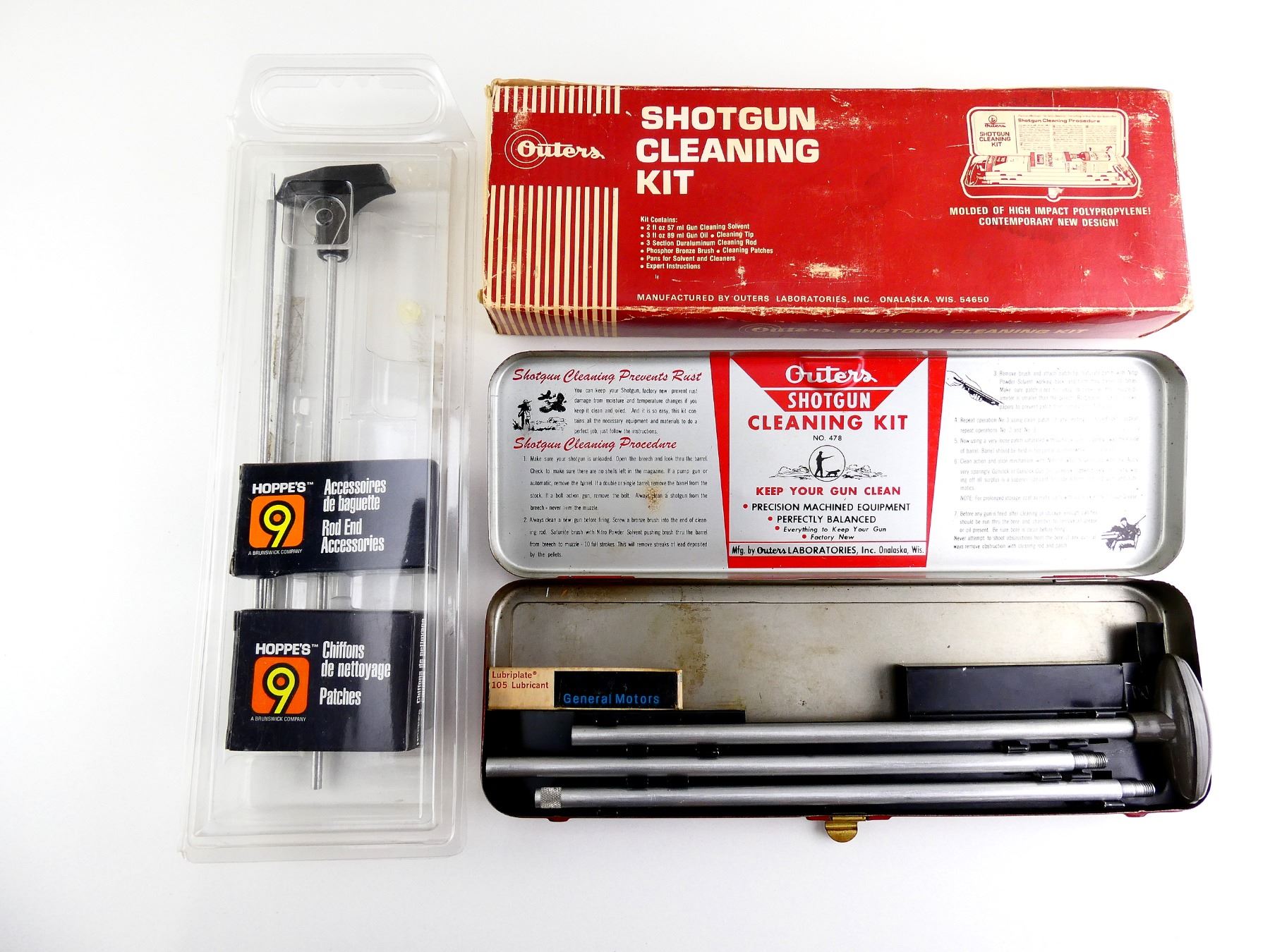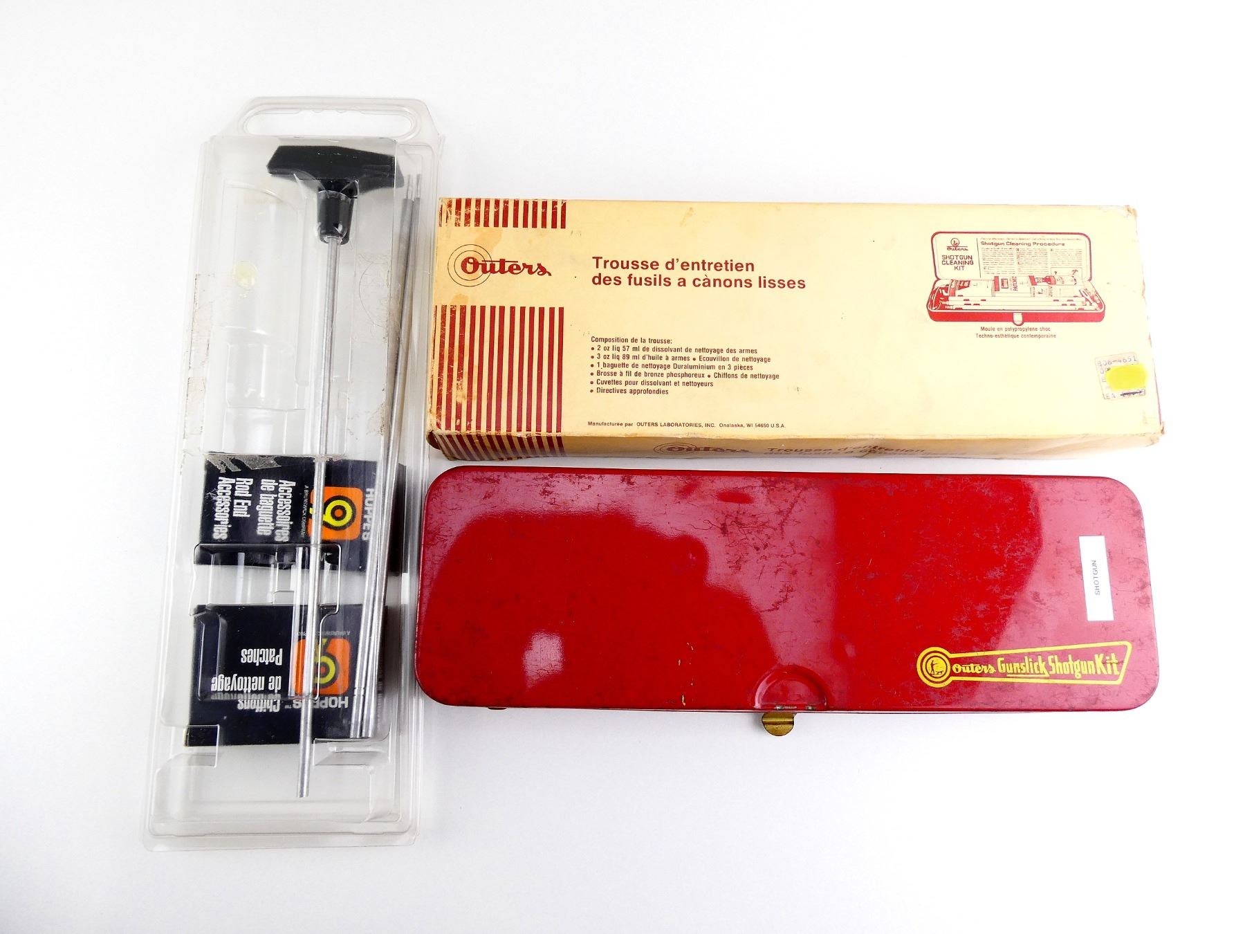 LOT INCLUDES; (1) OUTERS GUNSLICK SHOTGUN CLEANING KIT WITH 3-PIECE CLEANING ROD, LUBRICANT, ETC., MAY NOT BE COMPLETE & (1) UNKNOWN CLEANING KIT WITH 3-PIECE CLEANING ROD, ROD END ACCESSORIES & PATCHES, MAY NOT BE COMPLETE. SEE PHOTOS.