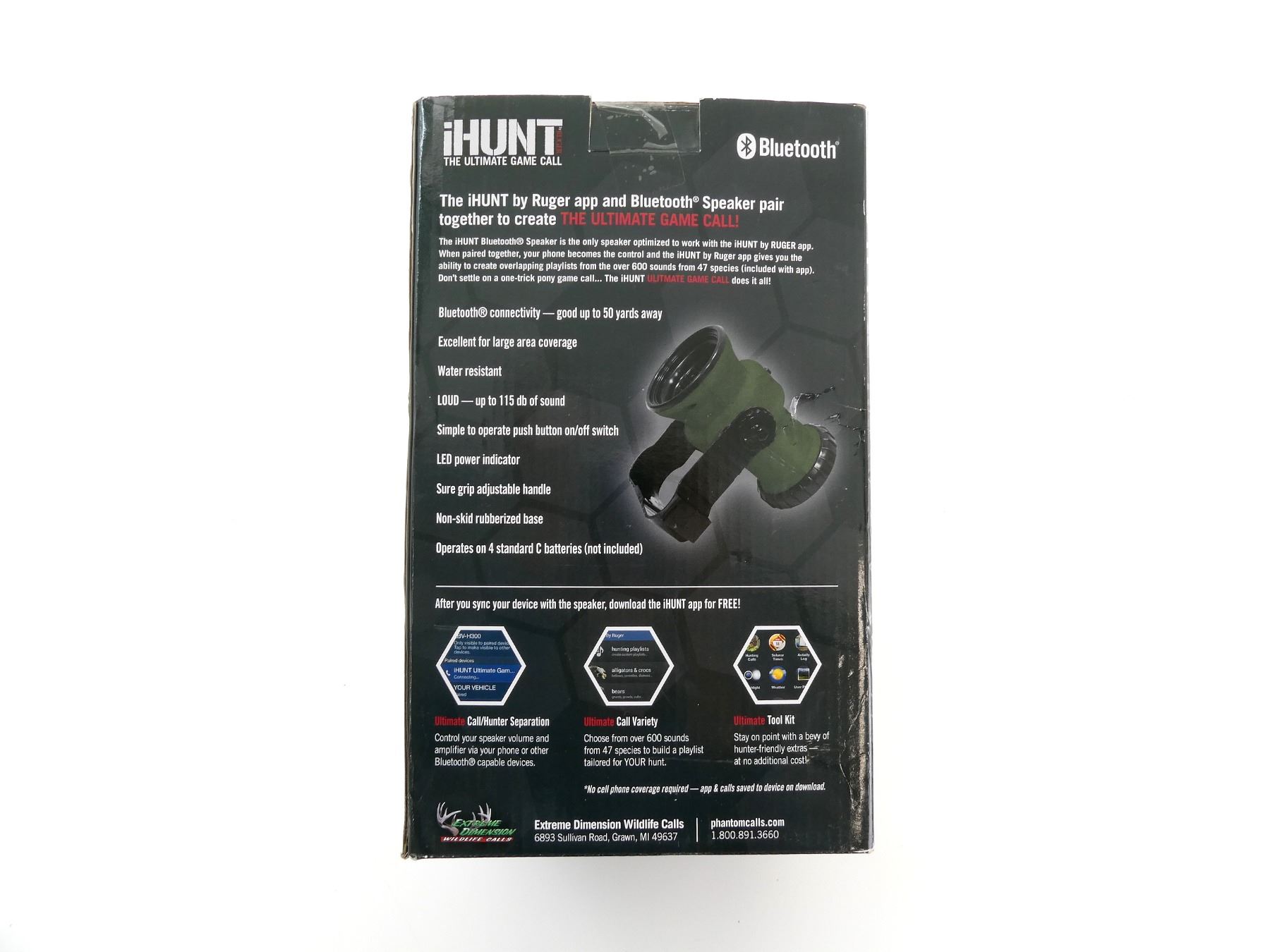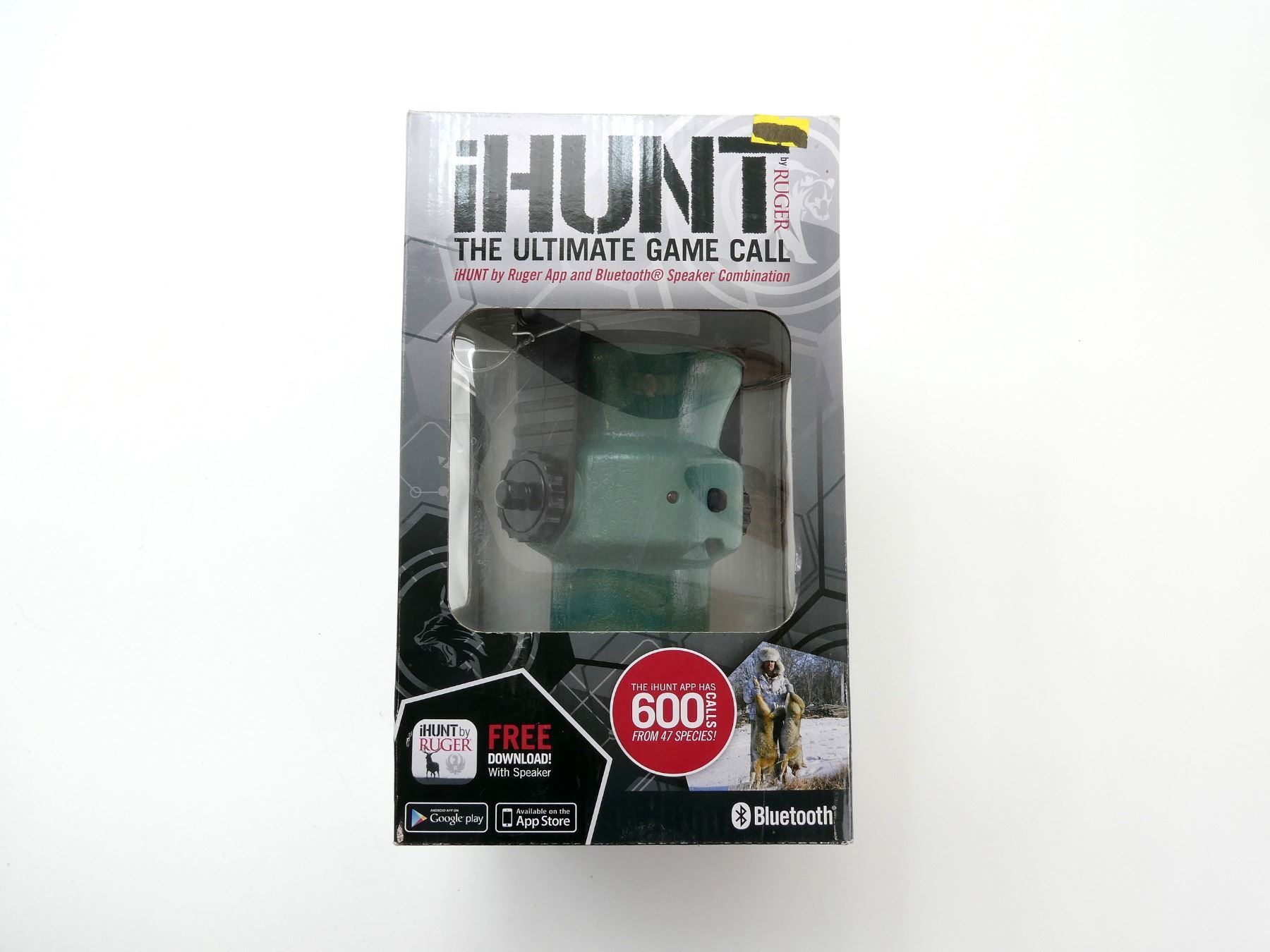 (1) ELECTRONIC GAME CALL, USES IHUNT APP BY RUGER & BLUETOOTH SPEAKER COMBINATION, APP HAS 600 CALLS FROM 47 SPECIES, BLUETOOTH CONNECTIVITY GOOD UP TO 50 YARDS, WATER RESISTANT, UP TO 115DB OF SOUND, BATTERY OPERATED, APPEARS NOS WITH ORIGINAL PACKAGING. SEE PHOTOS.