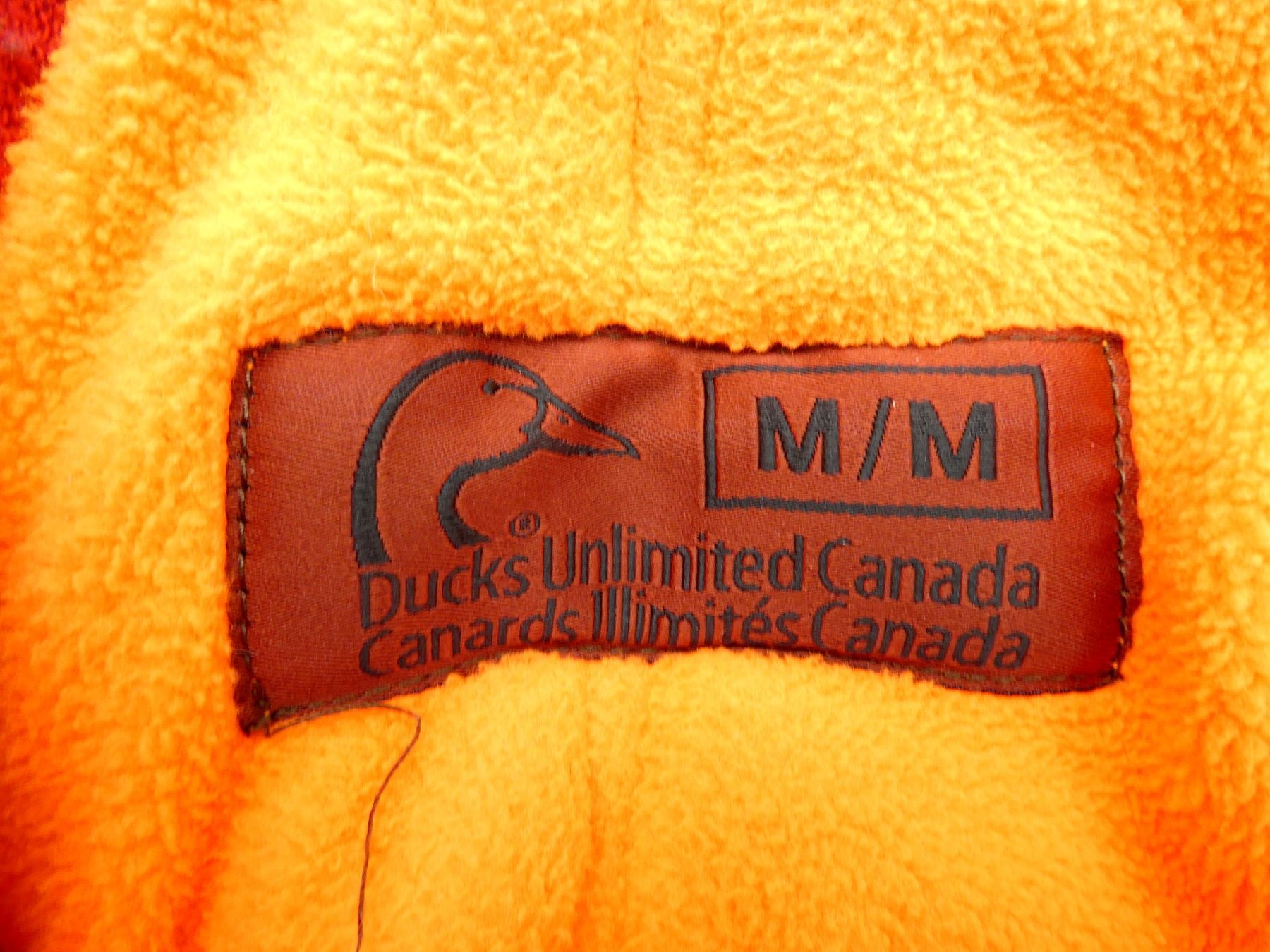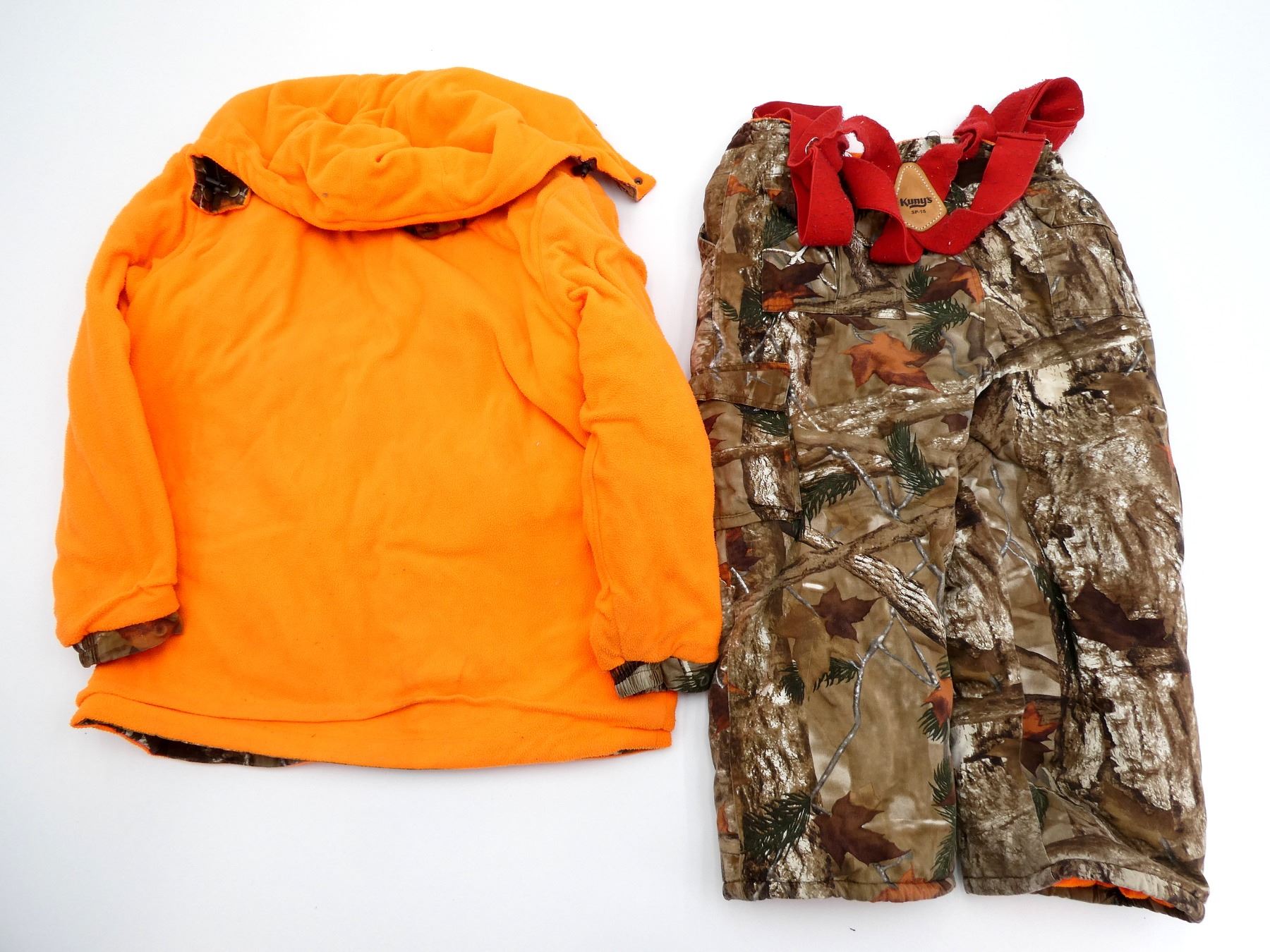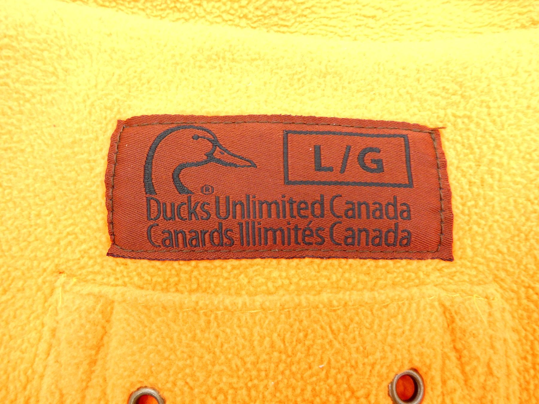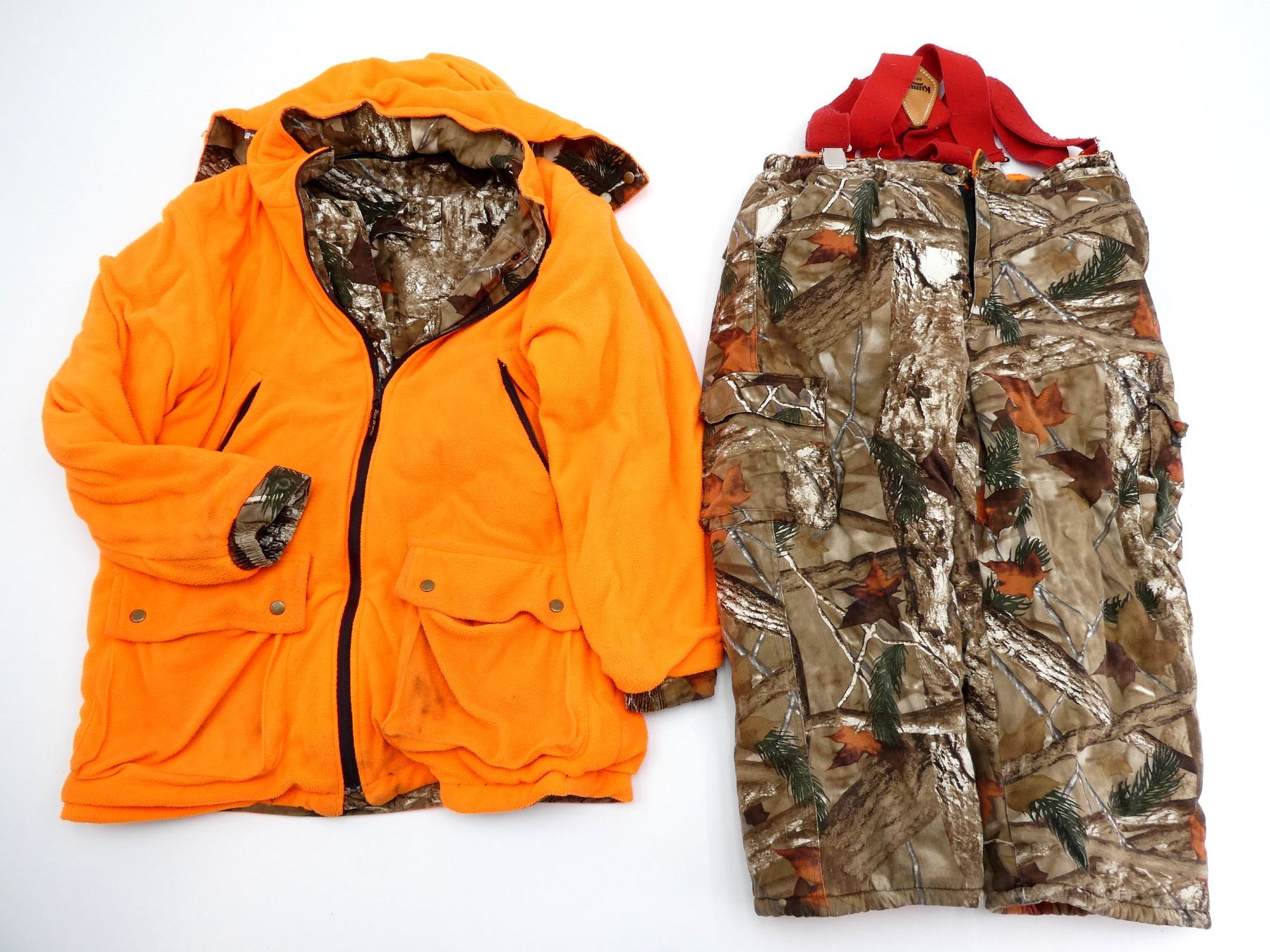 LOT INCLUDES; (1) DUCKS UNLIMITED HUNTING COAT, SIZE: LG, REVERSIBLE, BROWN CAMO / SAFETY ORANGE, DETACHABLE HOOD, WORKING ZIPPER FRONT, SHOWS WEAR & (1) PAIR OF DUCKS UNLIMITED HUNTING PANTS WITH RED ELASTIC SUSPENDERS, SIZE: M, REVERSIBLE, BROWN CAMO / SAFETY ORANGE, SOME ELASTIC IN WAIST, WORKING ZIPPER CLOSURE, SHOWS WEAR. SEE PHOTOS.