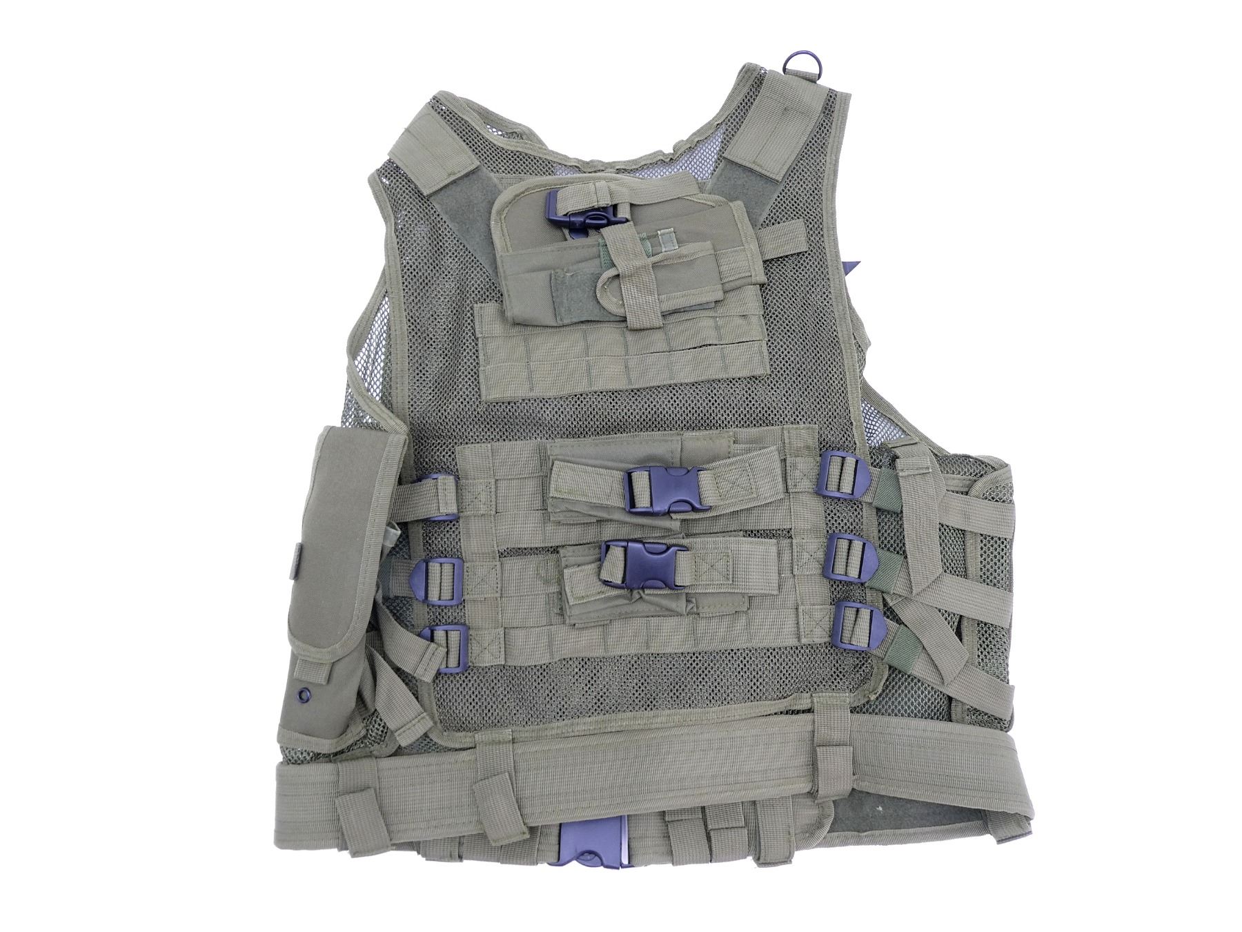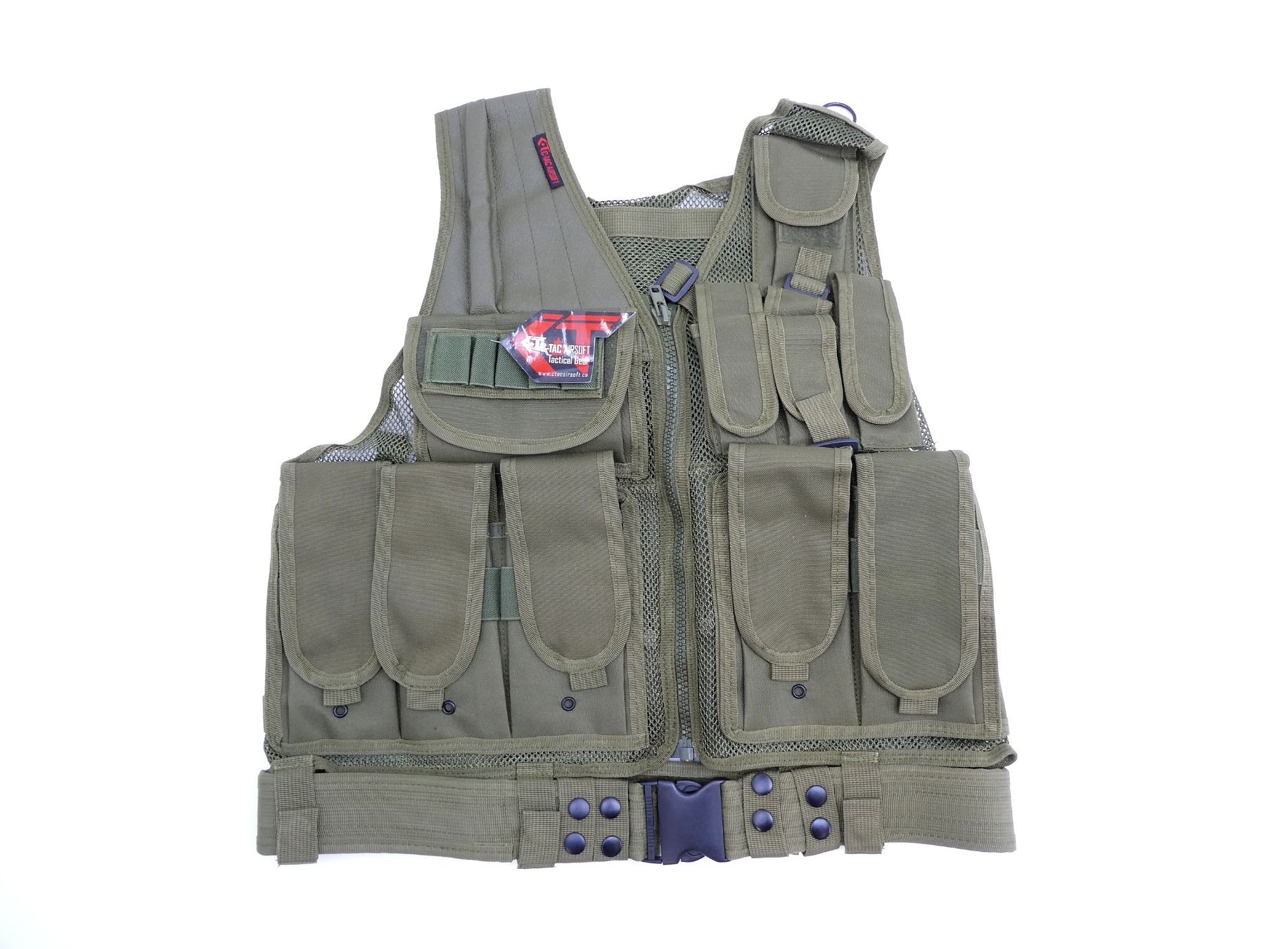 (1) GREEN, POLYESTER CONSTRUCTION, ADJUSTABLE WITH SIX LARGE RIFLE MAGAZINE POUCHES, TWO SMALL UTILITY POUCHES & TWO MAP POUCHES ON THE INSIDE, WITH ZIP CLOSURES, ONE-SIZE - PULL-TAB/CLIP ADJUSTABLE SIDES, NOS, WITH ORIGINAL TAGS. SEE PHOTOS.