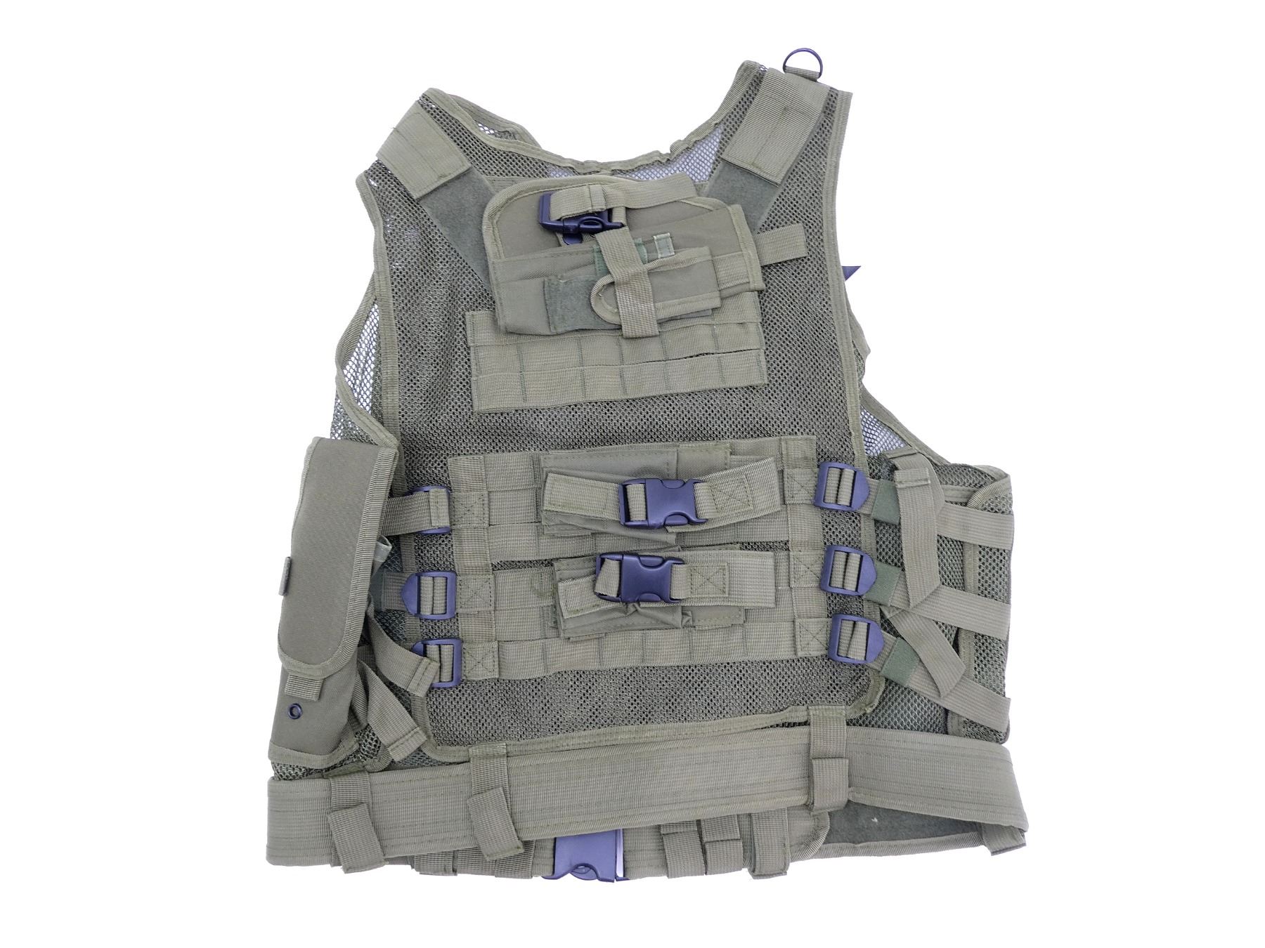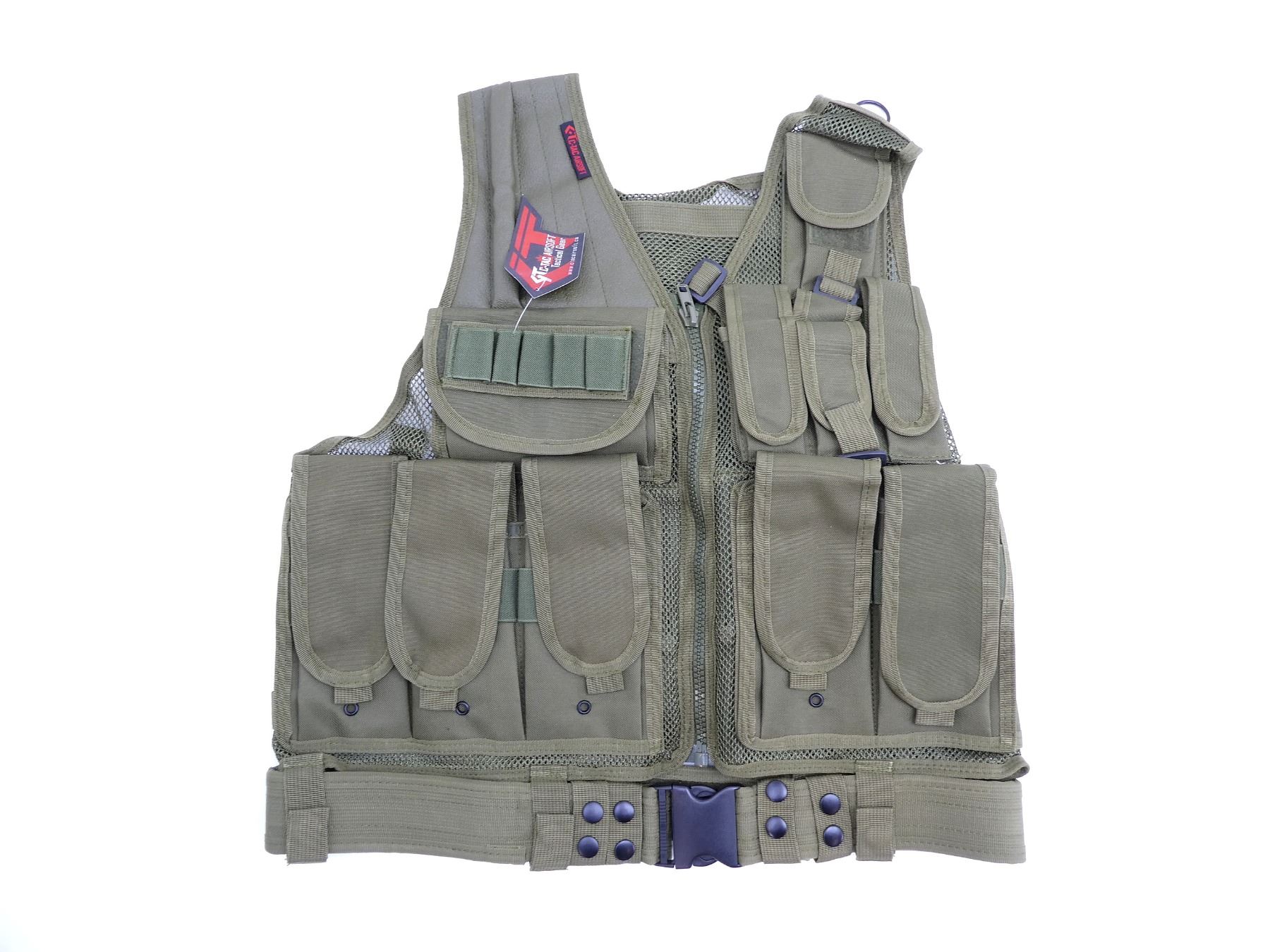 (1) GREEN, POLYESTER CONSTRUCTION, ADJUSTABLE WITH SIX LARGE RIFLE MAGAZINE POUCHES, TWO SMALL UTILITY POUCHES & TWO MAP POUCHES ON THE INSIDE, WITH ZIP CLOSURES, ONE-SIZE - PULL-TAB/CLIP ADJUSTABLE SIDES, NOS, WITH ORIGINAL TAGS. SEE PHOTOS.
