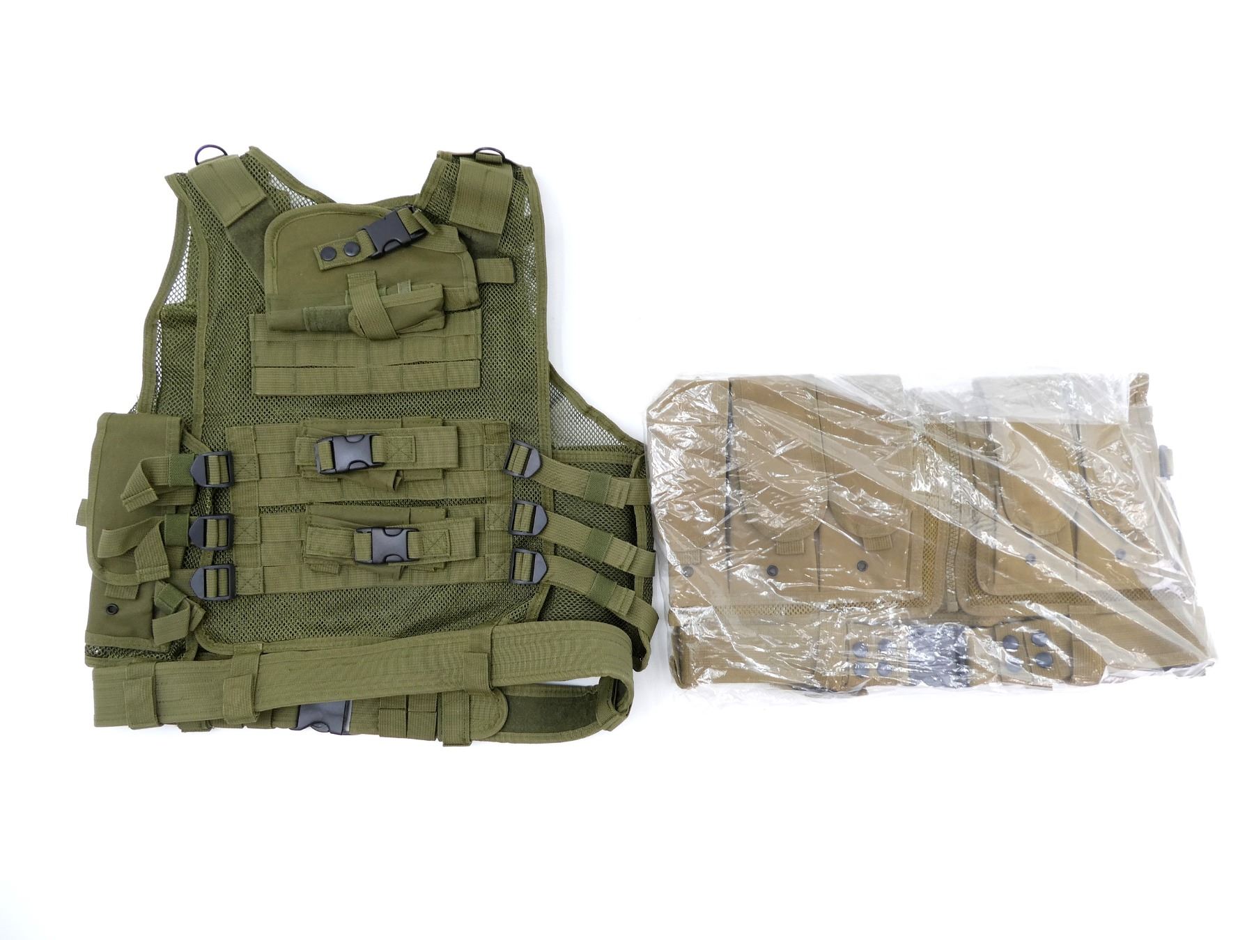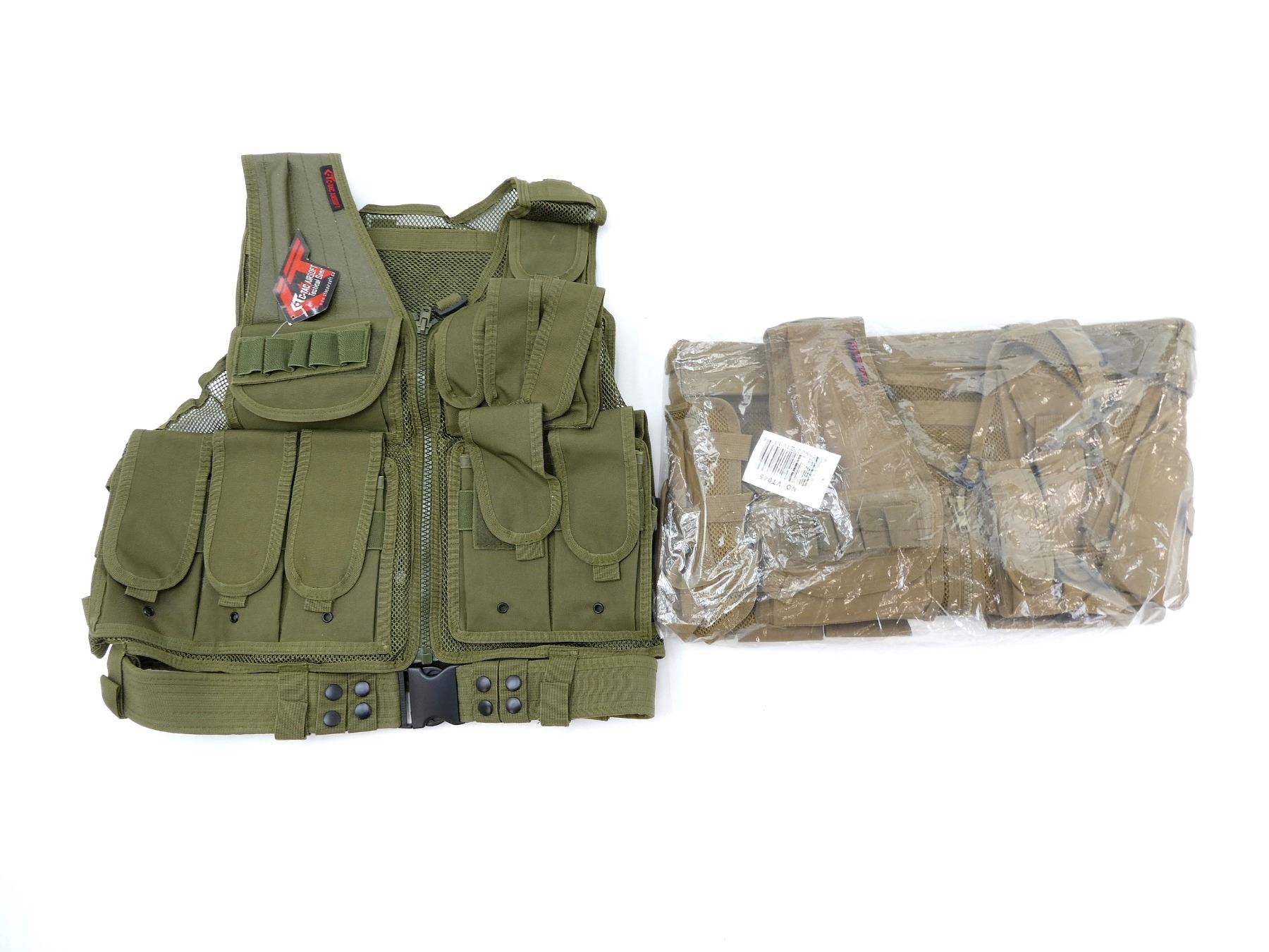 LOT INCLUDES; (1) COYOTE BROWN, POLYESTER CONSTRUCTION, ADJUSTABLE WITH SIX LARGE RIFLE MAGAZINE POUCHES, TWO SMALL UTILITY POUCHES & TWO MAP POUCHES ON THE INSIDE, WITH ZIP CLOSURES, ADJUSTABLE, NOS, WITH ORIGINAL TAGS, (1) GREEN, POLYESTER CONSTRUCTION, ADJUSTABLE WITH SIX LARGE RIFLE MAGAZINE POUCHES, TWO SMALL UTILITY POUCHES & TWO MAP POUCHES ON THE INSIDE, WITH ZIP CLOSURES, ONE-SIZE - PULL-TAB/CLIP ADJUSTABLE SIDES, NOS, WITH ORIGINAL TAGS. SEE PHOTOS.