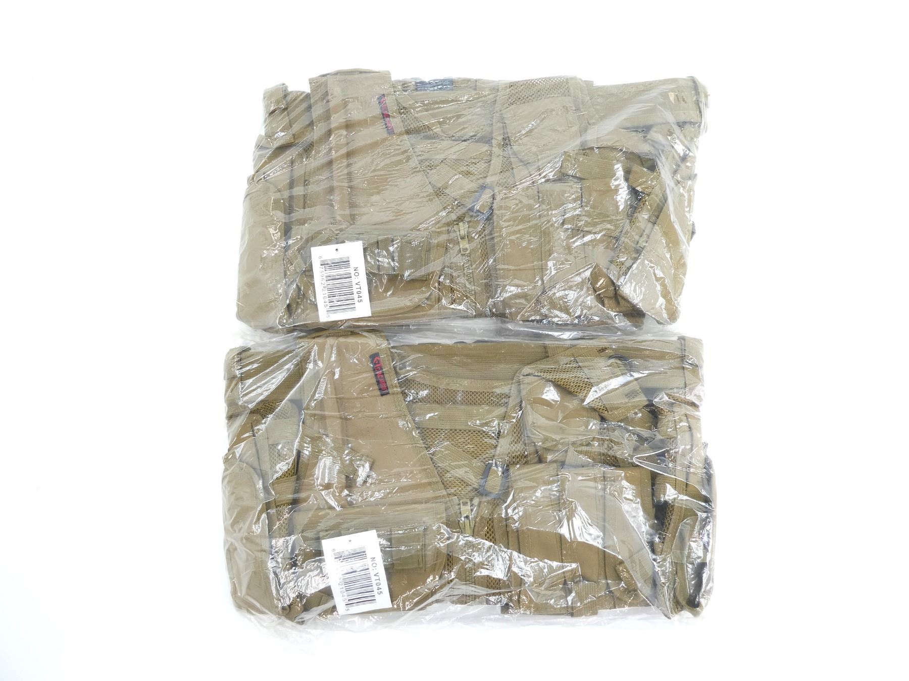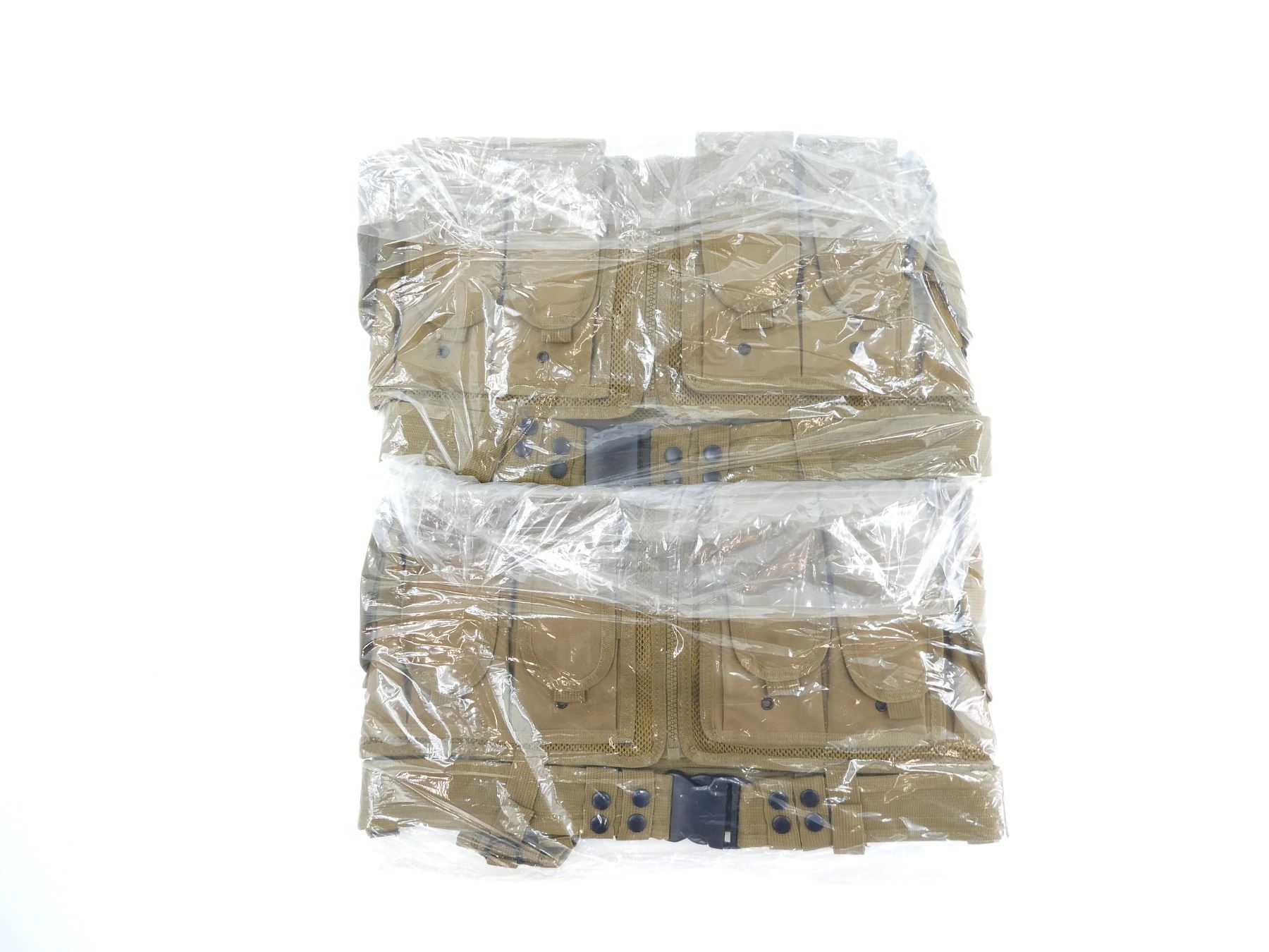 LOT INCLUDES; (2) COYOTE BROWN, POLYESTER CONSTRUCTION, ADJUSTABLE WITH SIX LARGE RIFLE MAGAZINE POUCHES, TWO SMALL UTILITY POUCHES & TWO MAP POUCHES ON THE INSIDE, WITH ZIP CLOSURES, ADJUSTABLE, NOS, WITH ORIGINAL TAGS. SEE PHOTOS.