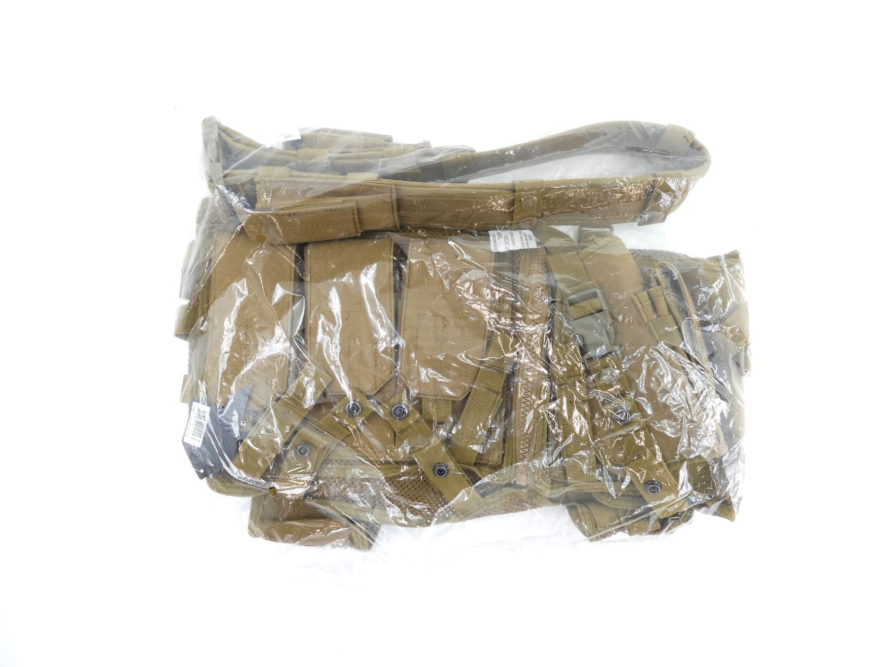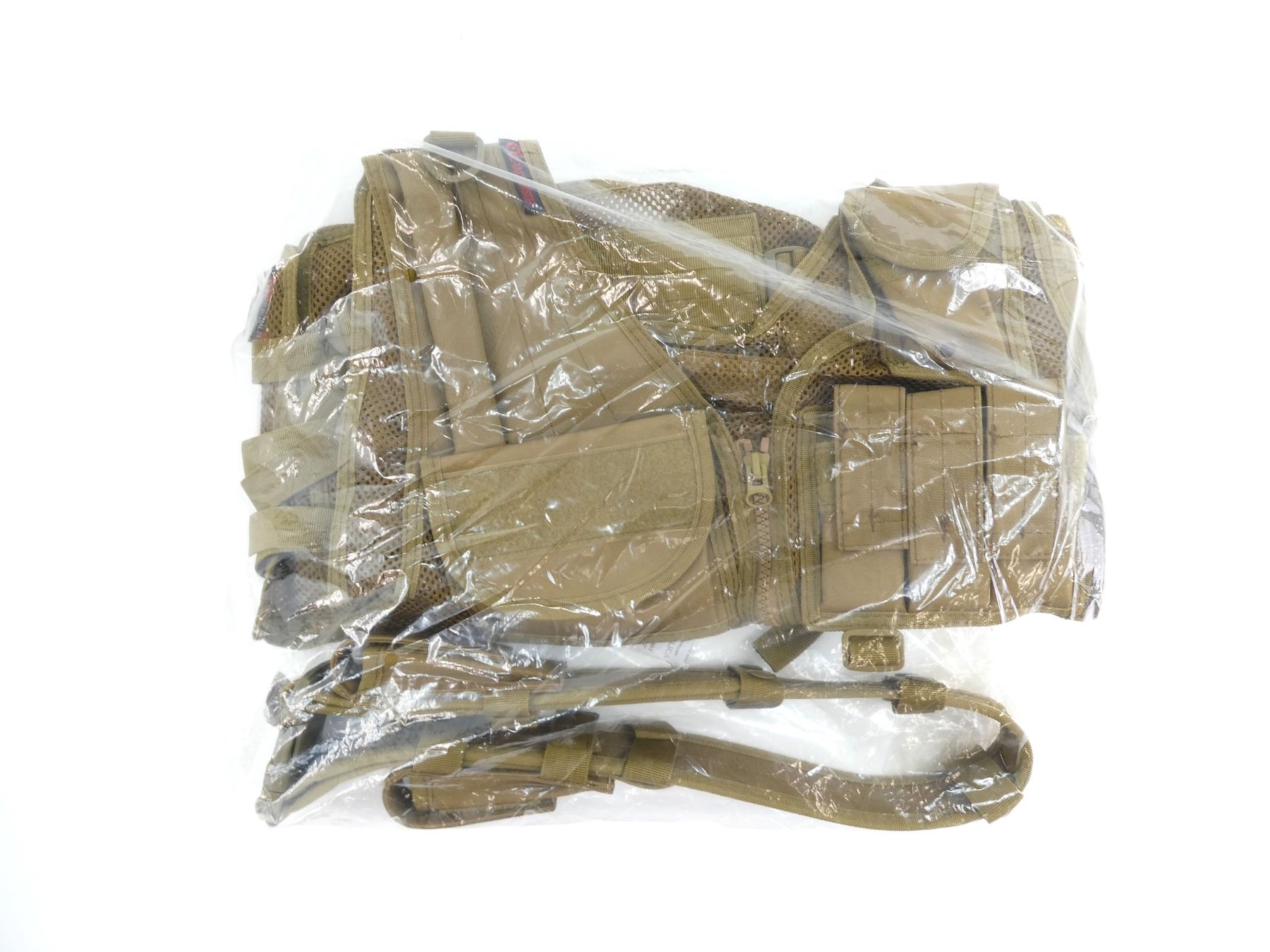 (1) COYOTE BROWN, POLYESTER CONSTRUCTION, ADJUSTABLE WITH SIX LARGE RIFLE MAGAZINE POUCHES, TWO SMALL UTILITY POUCHES & TWO MAP POUCHES ON THE INSIDE, WITH ZIP CLOSURES, ADJUSTABLE, NOS, WITH ORIGINAL TAGS. SEE PHOTOS.