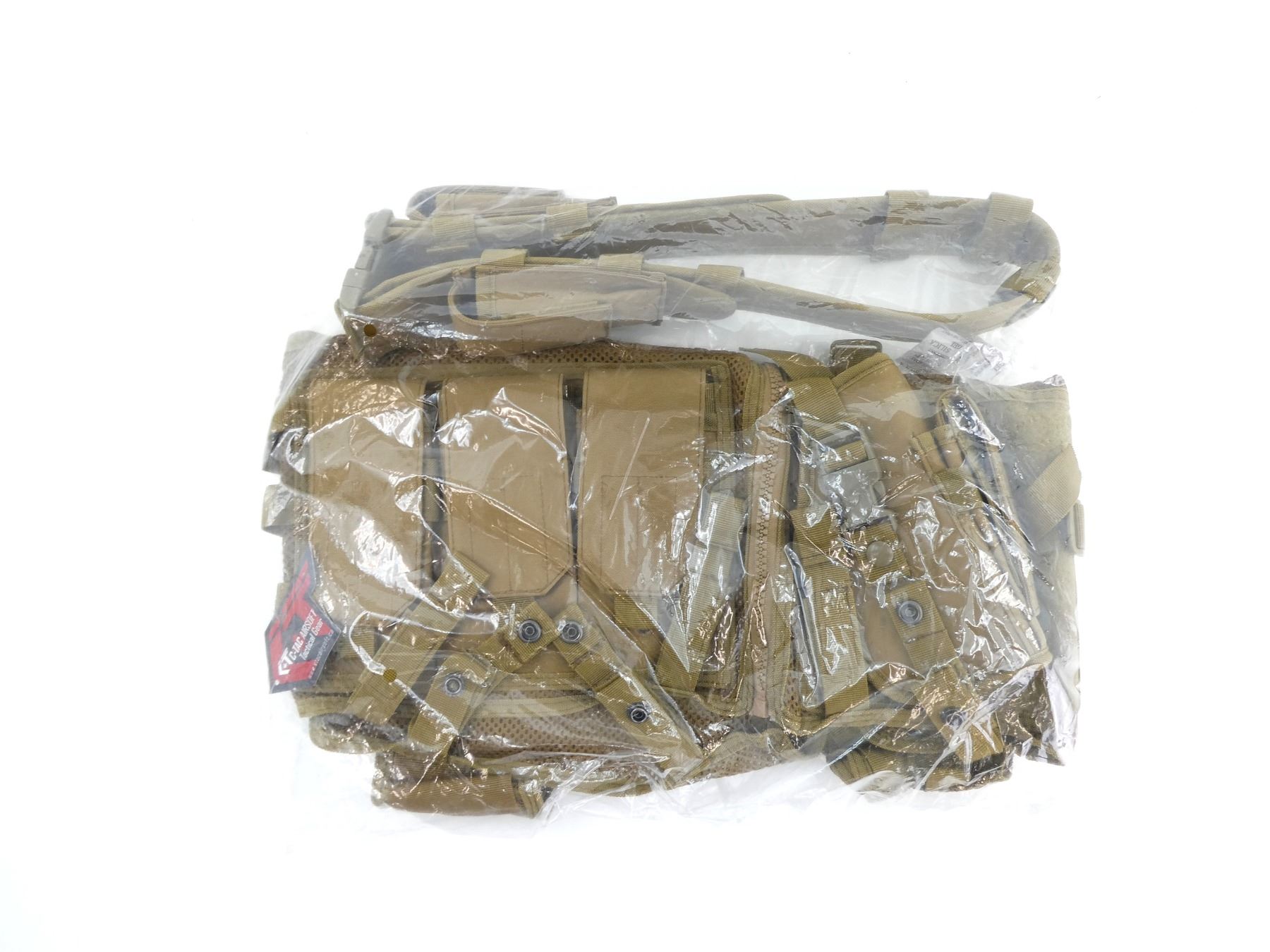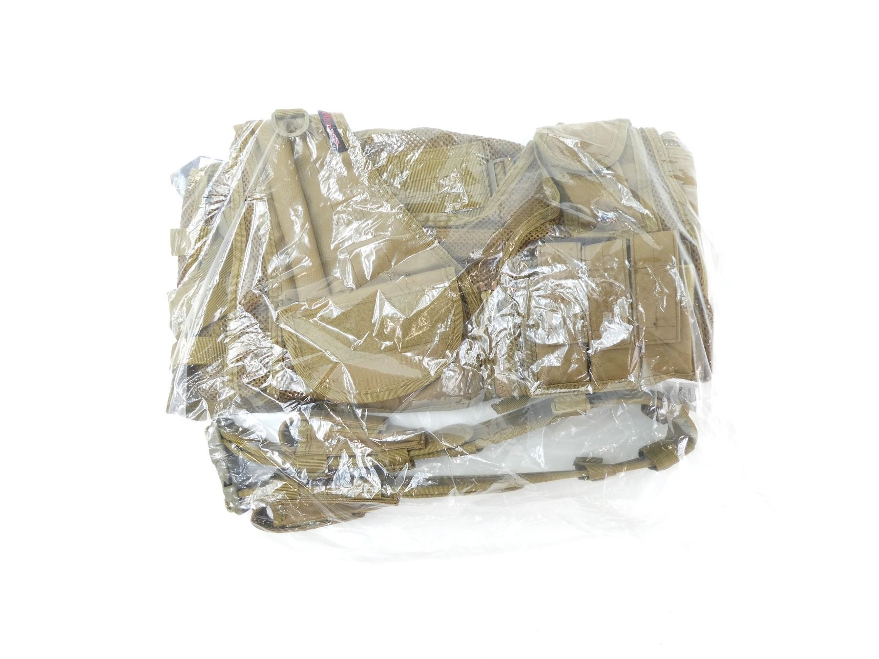 (1) COYOTE BROWN, POLYESTER CONSTRUCTION, ADJUSTABLE WITH SIX LARGE RIFLE MAGAZINE POUCHES, TWO SMALL UTILITY POUCHES & TWO MAP POUCHES ON THE INSIDE, WITH ZIP CLOSURES, ADJUSTABLE, NOS, WITH ORIGINAL TAGS. SEE PHOTOS.