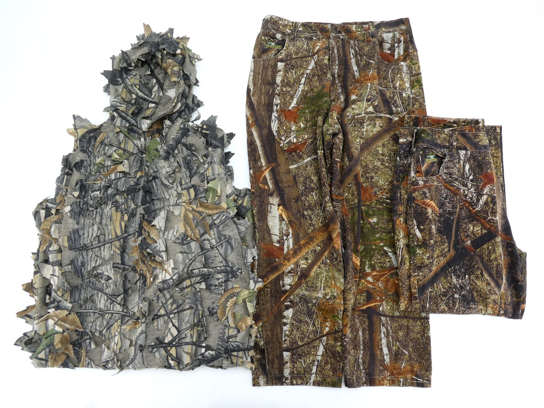 SPORTCHIEF CAMOUFLAGE HUNTING PANTS AND GHILLIE SUIT LOT