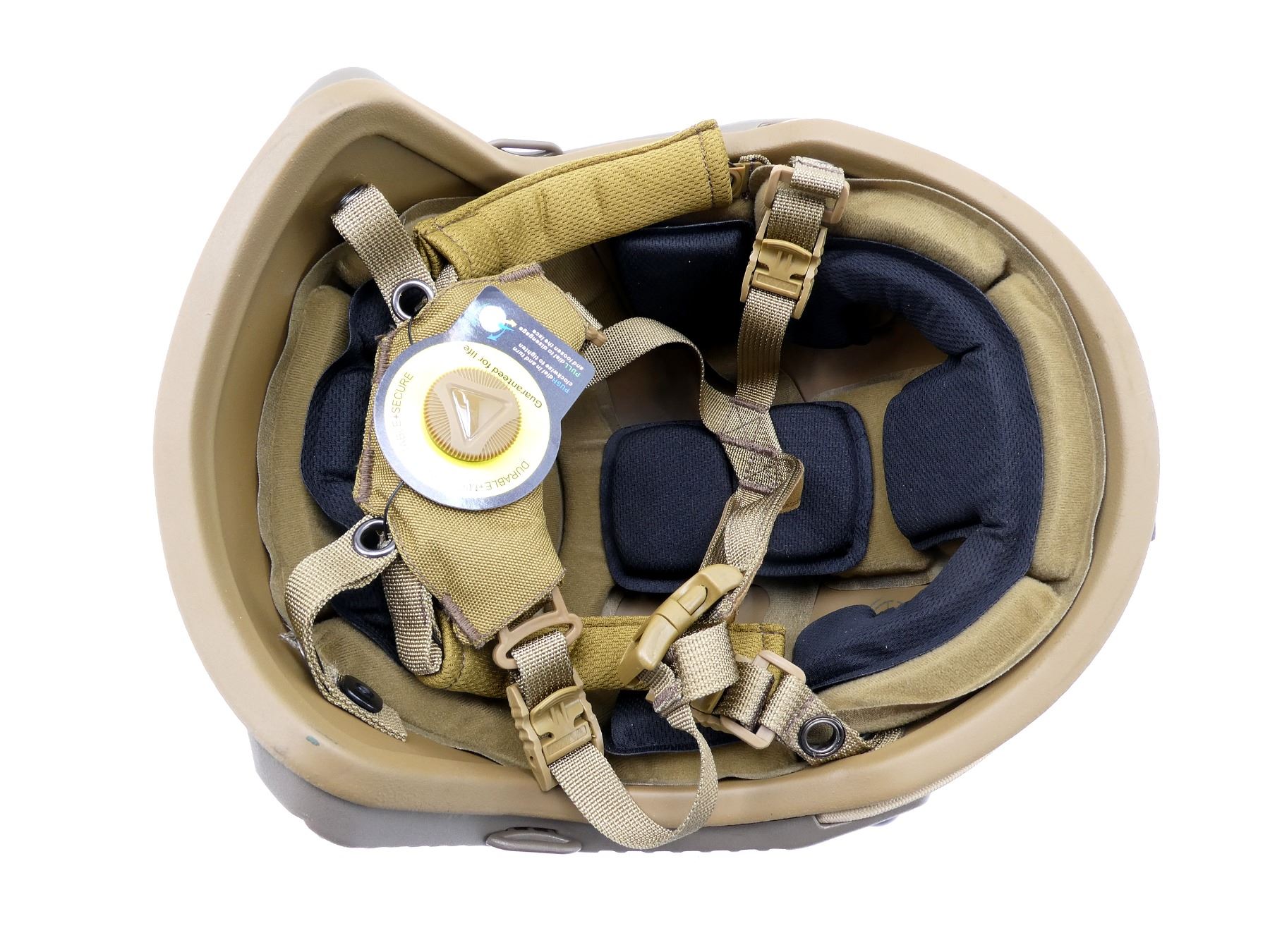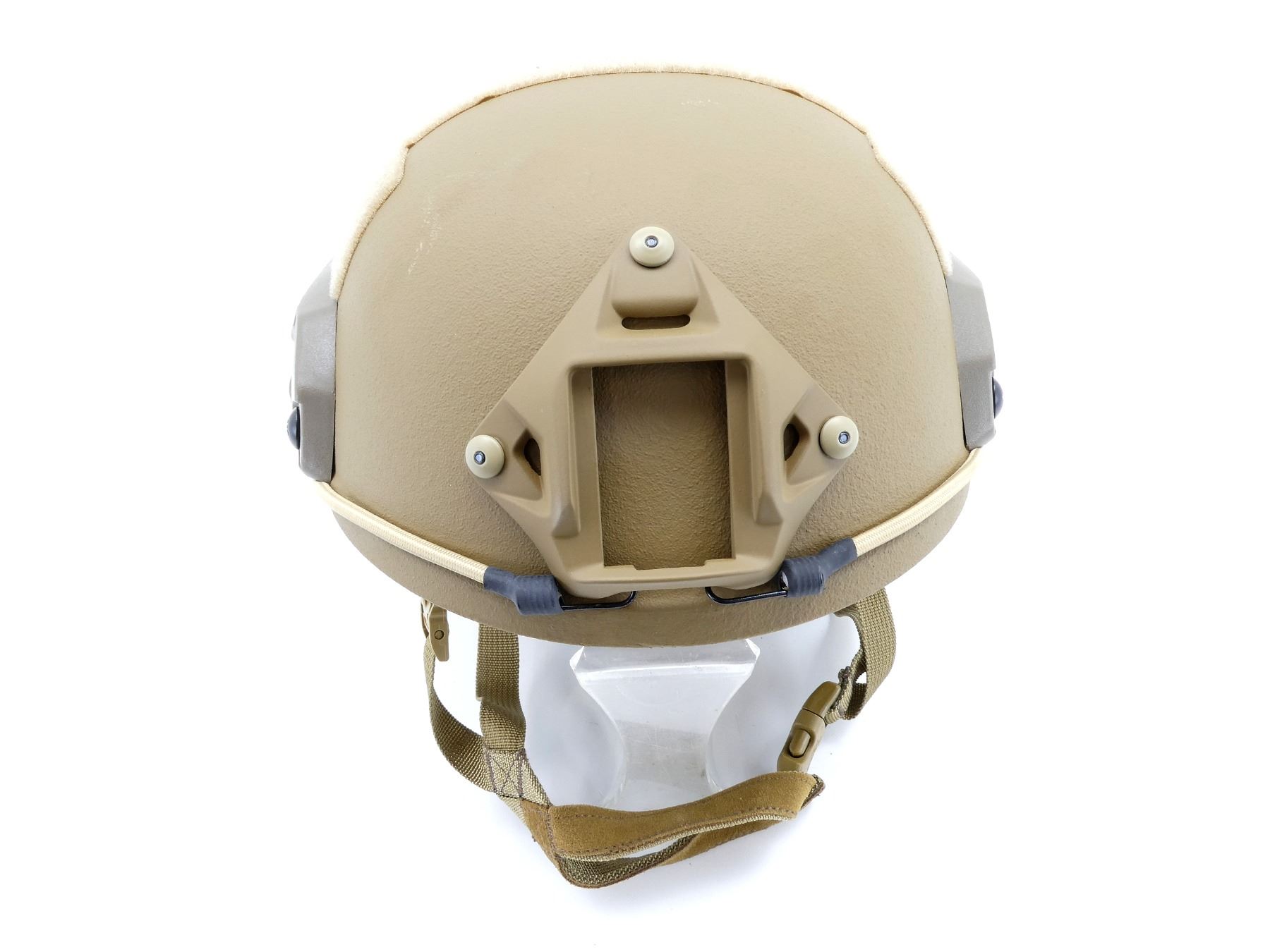 (1) ARAMID HELMET, TAN, LEVEL 3A PROTECTION, HIGH-CUT FAST WITH WENDY SUSPENSION SYSTEM, ONE SIZE, FULLY ADJUSTABLE, INCLUDES ARC RAIL & VARIOUS VELCRO ATTACHMENT POINTS, NVG SHROUD TO FIT MOST COMMON NVGS, NOS. SEE PHOTOS.