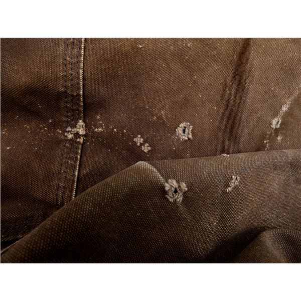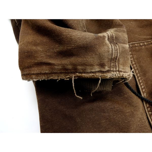 (1) DARK BROWN CANVAS JACKET WITH FLEECE LINING & HOOD, ZIPPERED FRONT (WORKS), MARKED: "CARHARTT", POSSIBLY MEDIUM SIZE ?, SHOWS WEAR / TEAR. SEE PHOTOS.