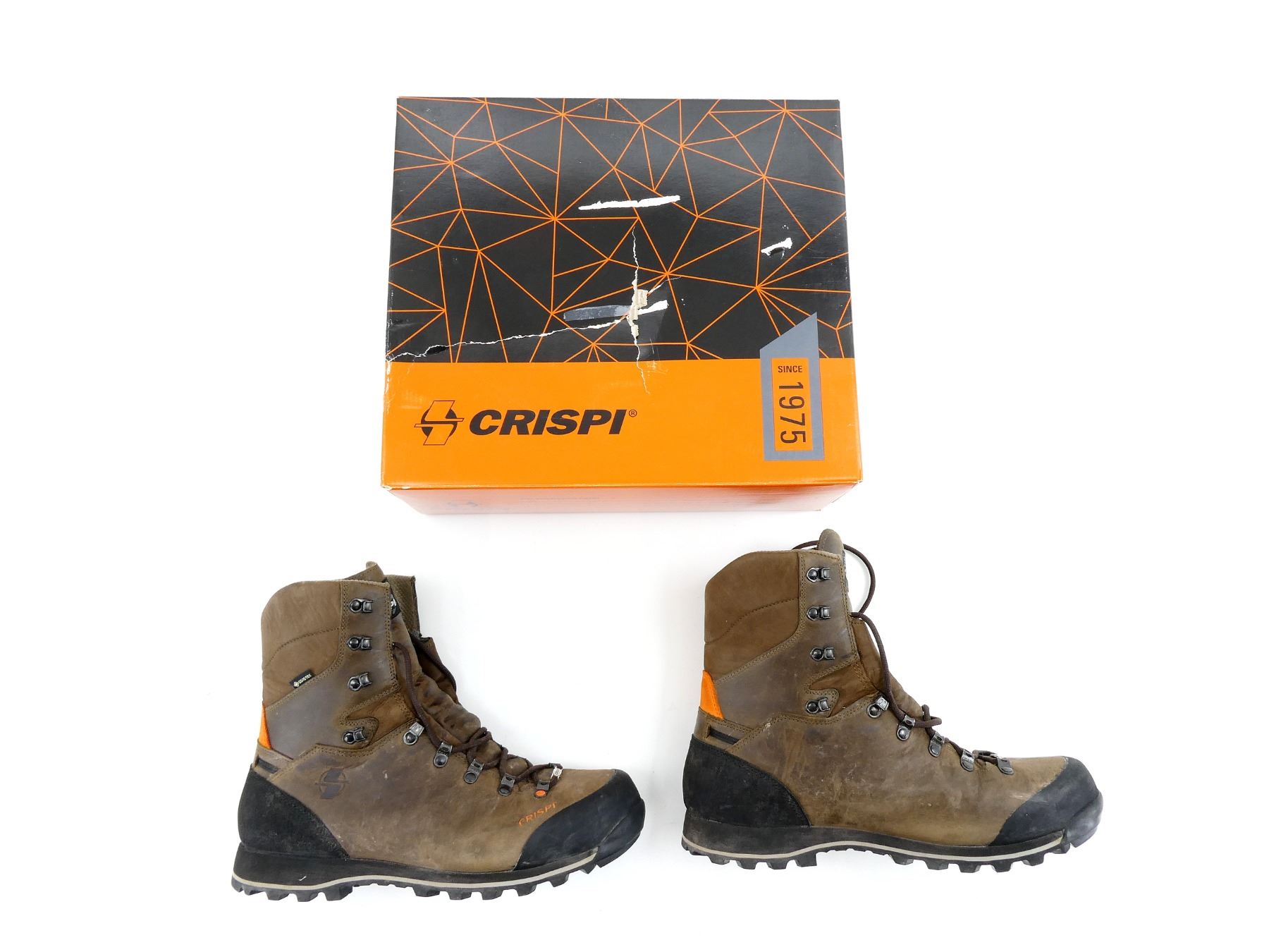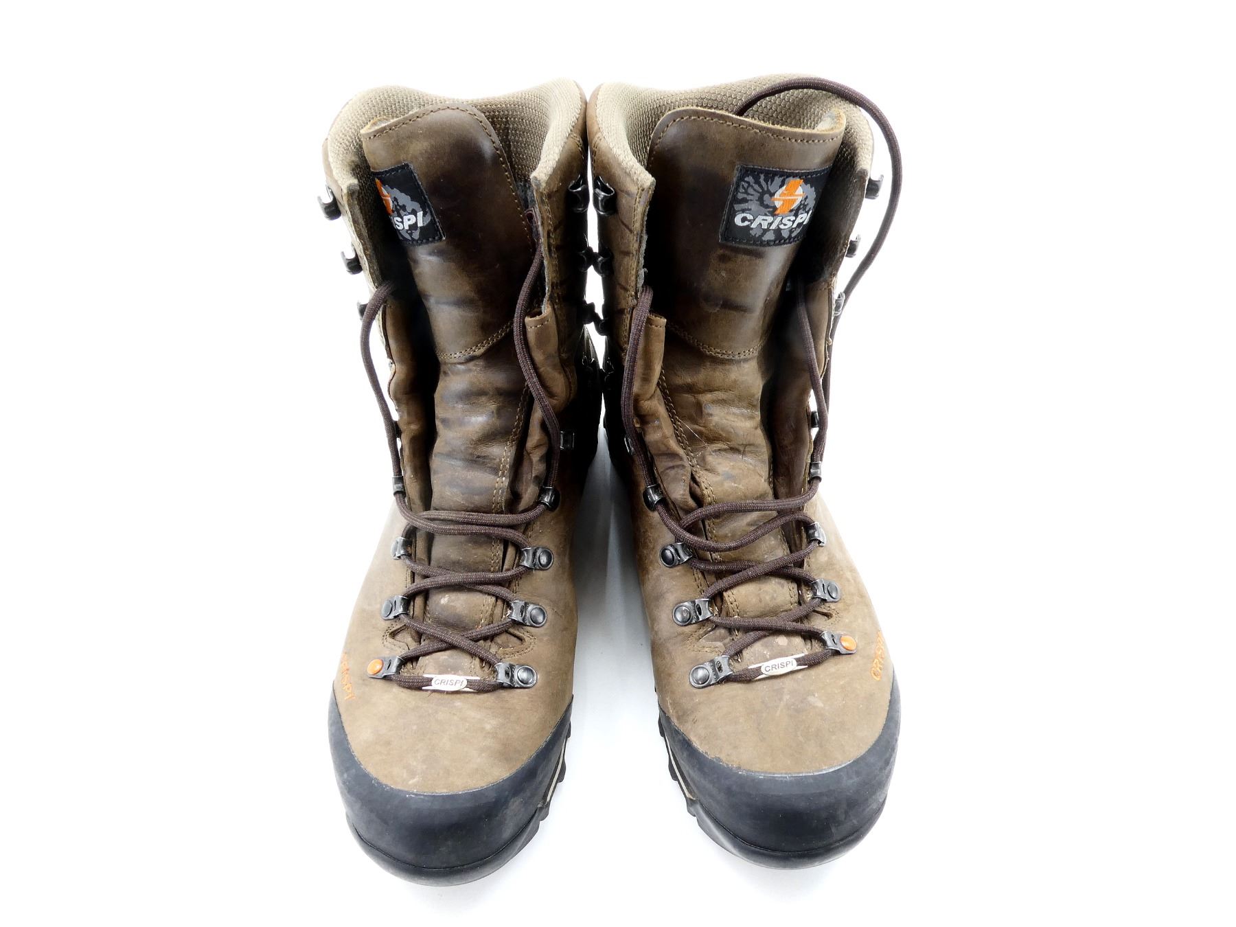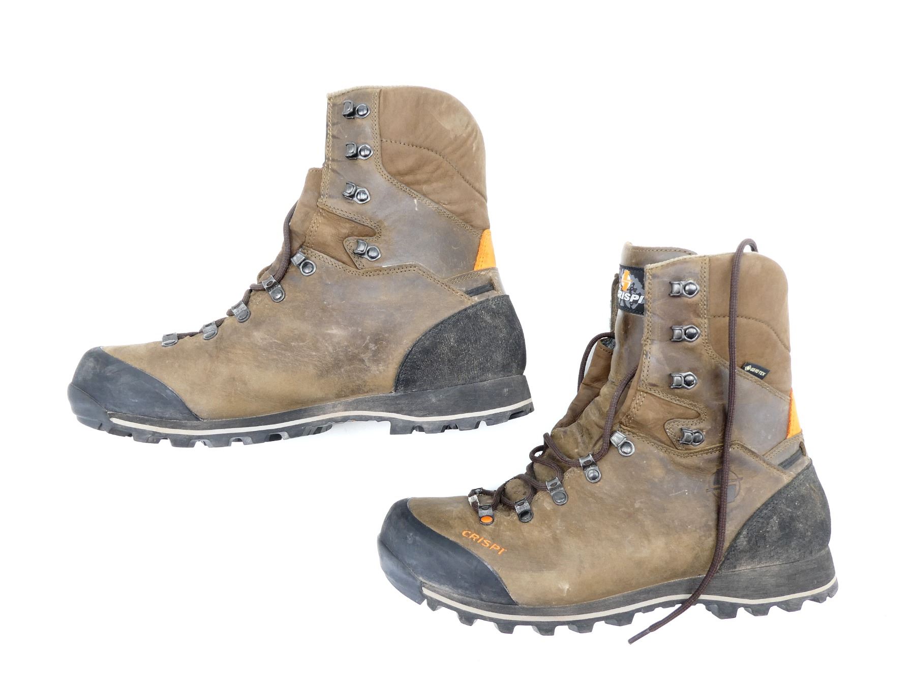 (1) PAIR OF WATER REPELLENT GREASED NUBUCK BROWN LEATHER BOOTS, REMOVEABLE CRISPI AIRMESH EVO INSOLES, RUBBER TOE CAP & POLYURETHAN-COATED LEATHER HEEL CAP, CONSIGNOR STATES: "USED FOR 4 DAYS", MARKED: "CRISPI", "U.S. 12", ETC., WITH ORIGINAL PACKAGING. SEE PHOTOS.
