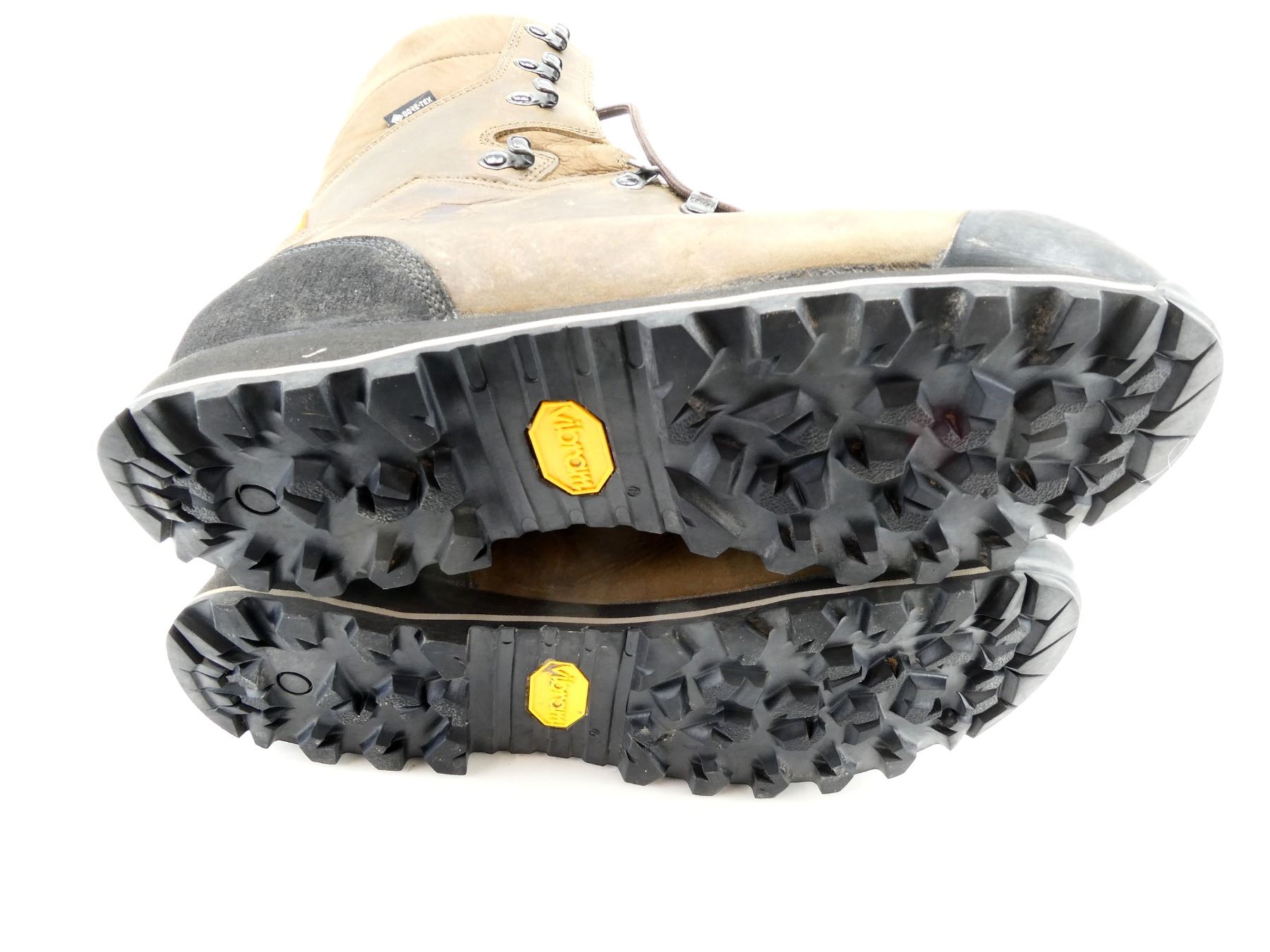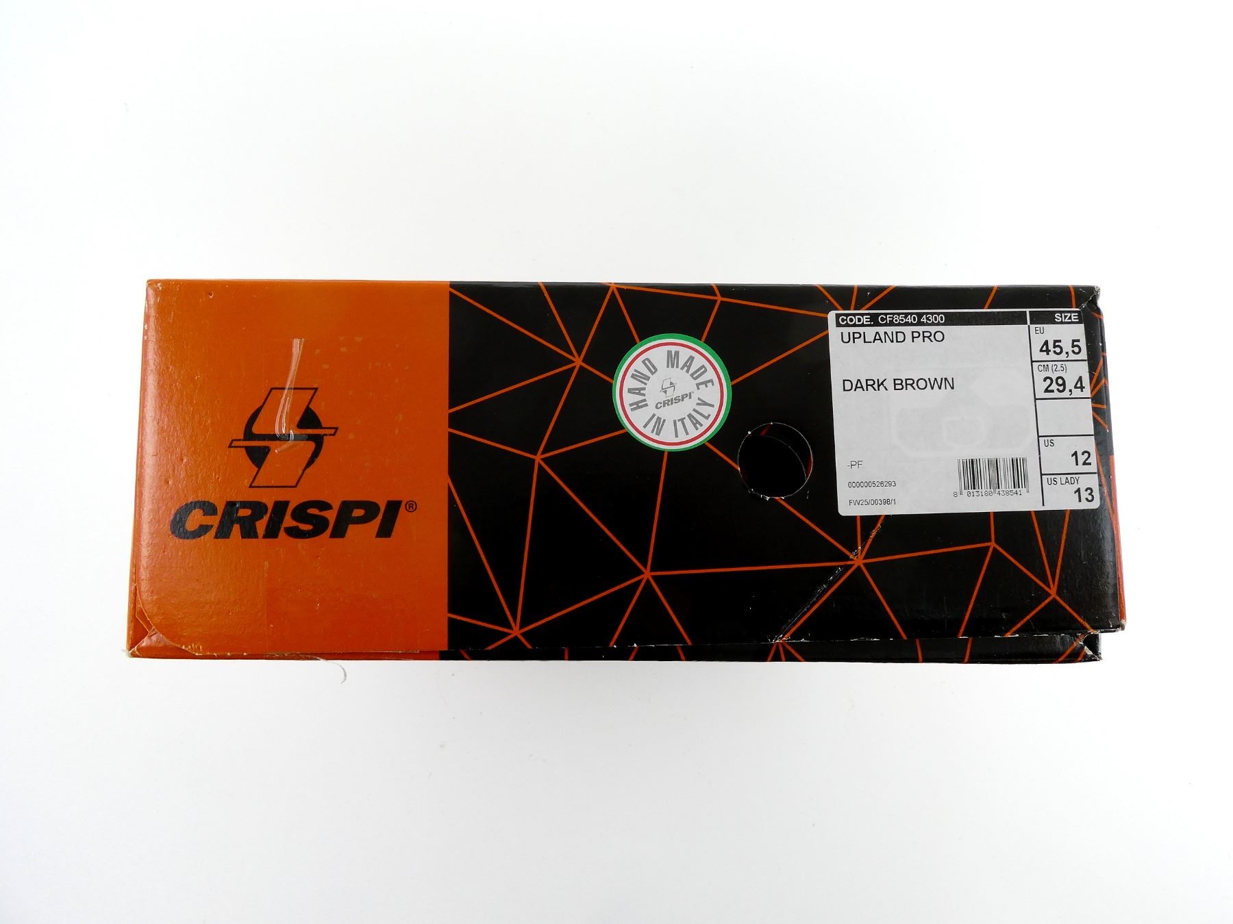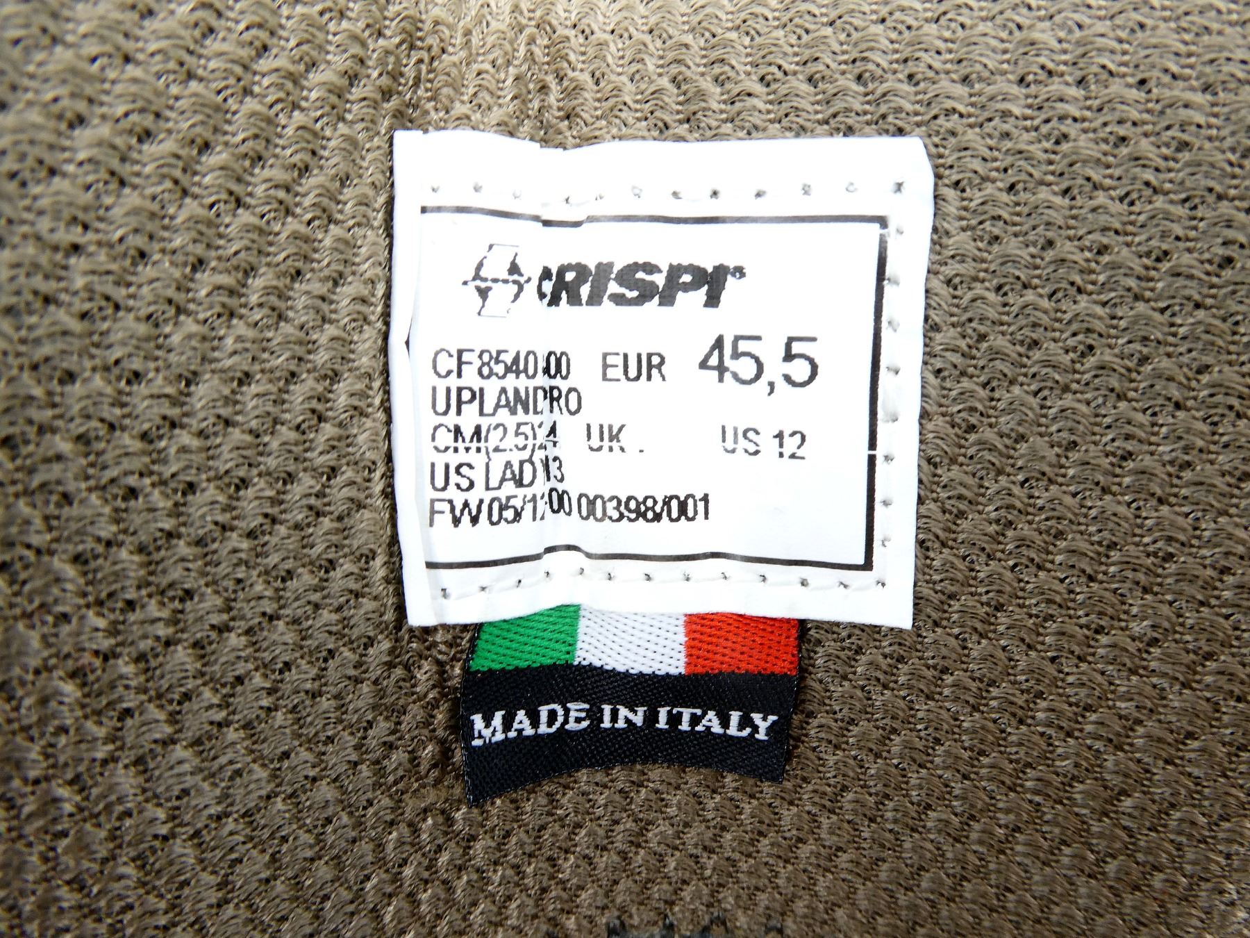 (1) PAIR OF WATER REPELLENT GREASED NUBUCK BROWN LEATHER BOOTS, REMOVEABLE CRISPI AIRMESH EVO INSOLES, RUBBER TOE CAP & POLYURETHAN-COATED LEATHER HEEL CAP, CONSIGNOR STATES: "USED FOR 4 DAYS", MARKED: "CRISPI", "U.S. 12", ETC., WITH ORIGINAL PACKAGING. SEE PHOTOS.