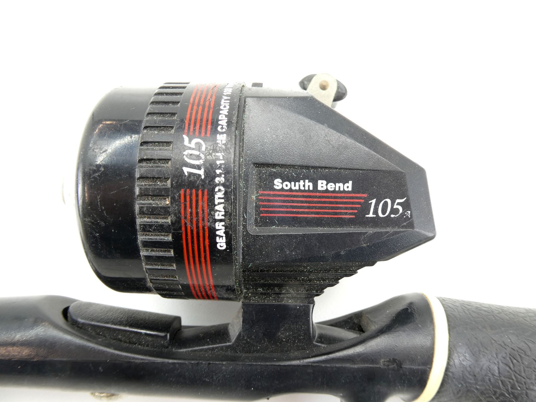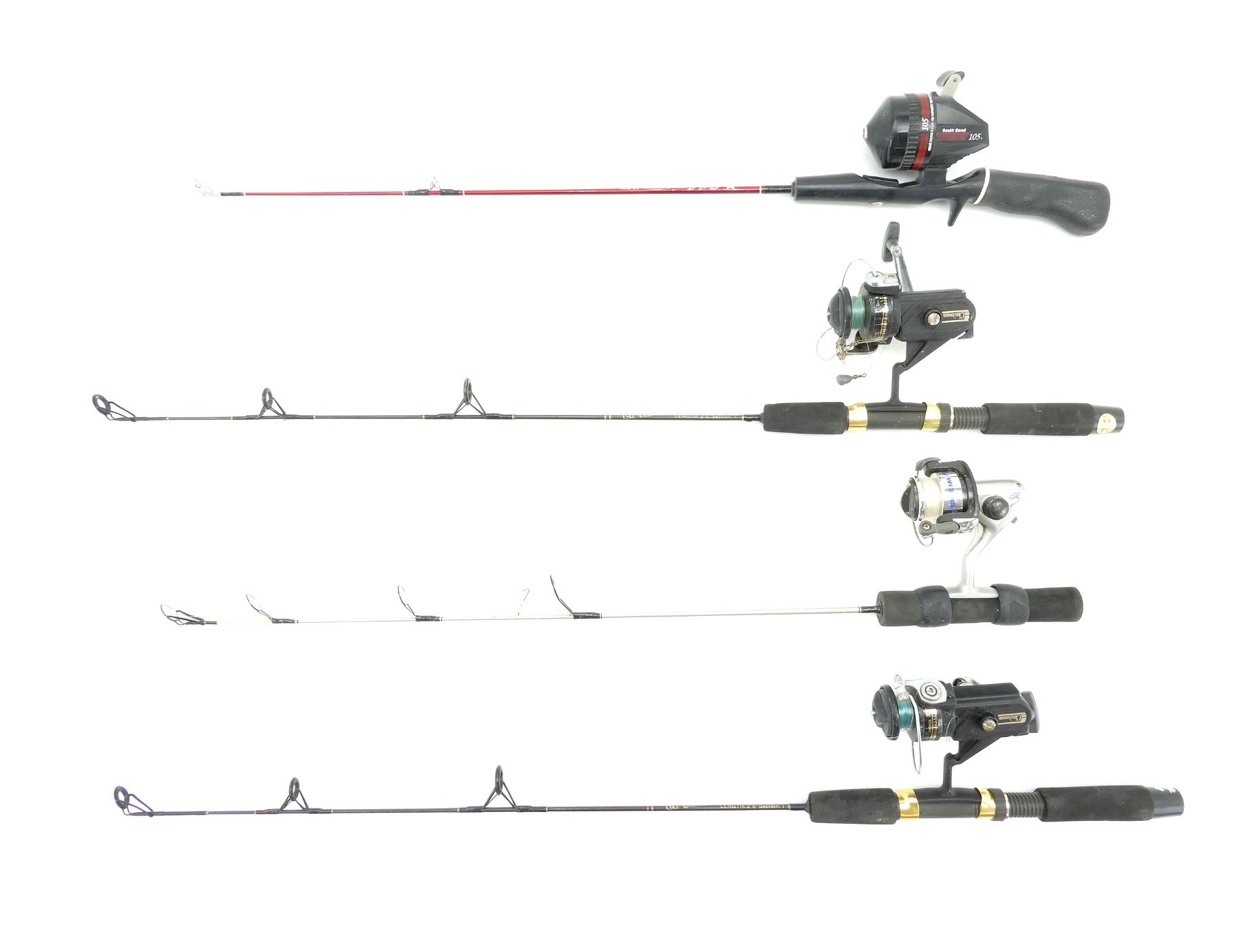 LOT INCLUDES; (2) LE BARON MODEL NO: LBI-126 ICE FISHING RODS WITH JOHNSON CHAIRMAN 820 REELS, WORKING CONDITION, VARIOUS MARKINGS, OALS APPROX. 31 3/8", (1) CRYSTAL ICE SOUTH BEND ICE FISHING ROD WITH REEL, MEDIUM LIGHT, WORKING CONDITION, VARIOUS MARKINGS, OAL APPROX. 27 5/8" & (1) SOUTH BEND CASY AWAY ICE FISHING ROD, NO. 00?3, MEDIUM ACTION, WITH SOUTH BEND 105 REEL, OAL APPROX. 28.75". SEE PHOTOS.