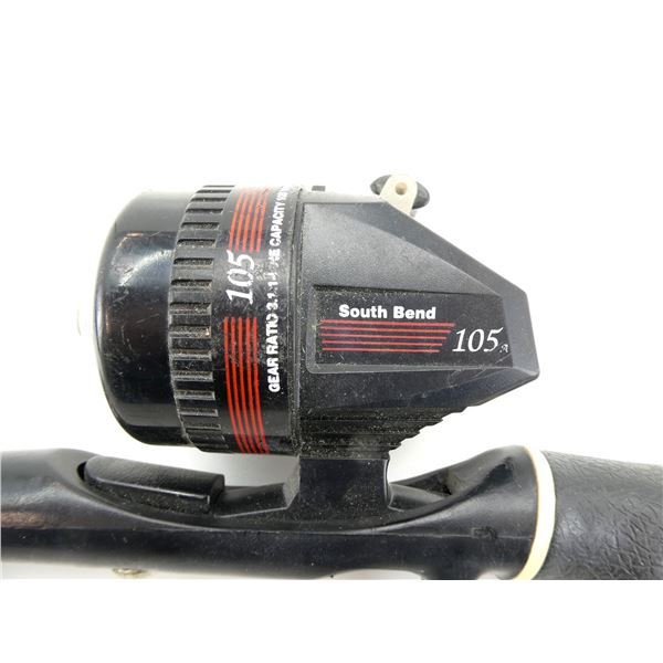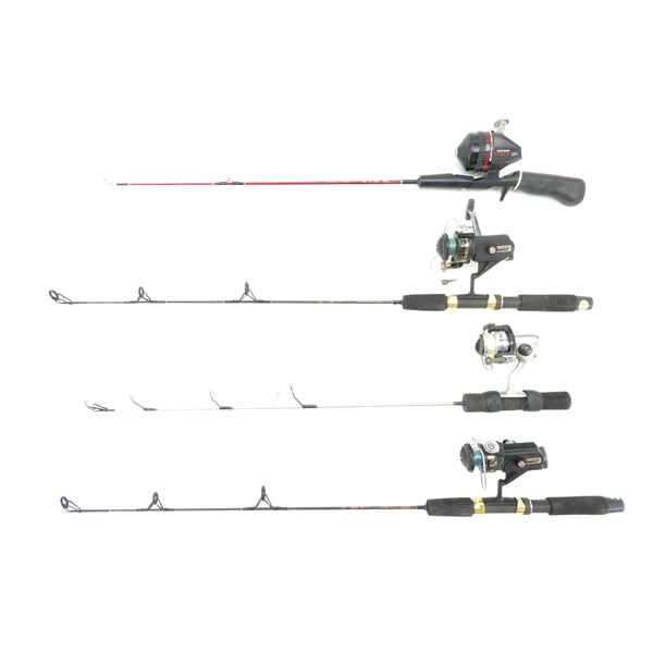 LOT INCLUDES; (2) LE BARON MODEL NO: LBI-126 ICE FISHING RODS WITH JOHNSON CHAIRMAN 820 REELS, WORKING CONDITION, VARIOUS MARKINGS, OALS APPROX. 31 3/8", (1) CRYSTAL ICE SOUTH BEND ICE FISHING ROD WITH REEL, MEDIUM LIGHT, WORKING CONDITION, VARIOUS MARKINGS, OAL APPROX. 27 5/8" & (1) SOUTH BEND CASY AWAY ICE FISHING ROD, NO. 00?3, MEDIUM ACTION, WITH SOUTH BEND 105 REEL, OAL APPROX. 28.75". SEE PHOTOS.