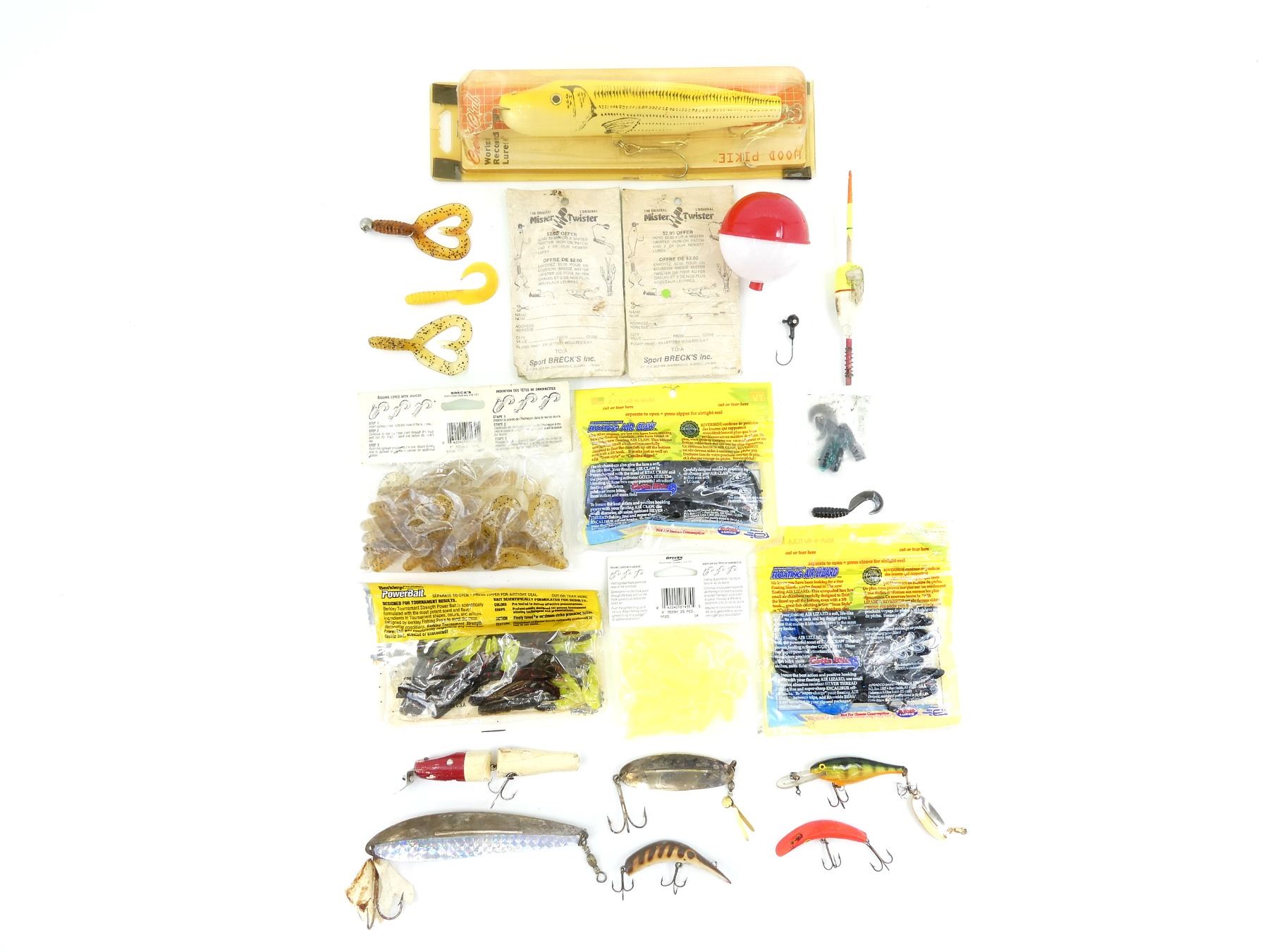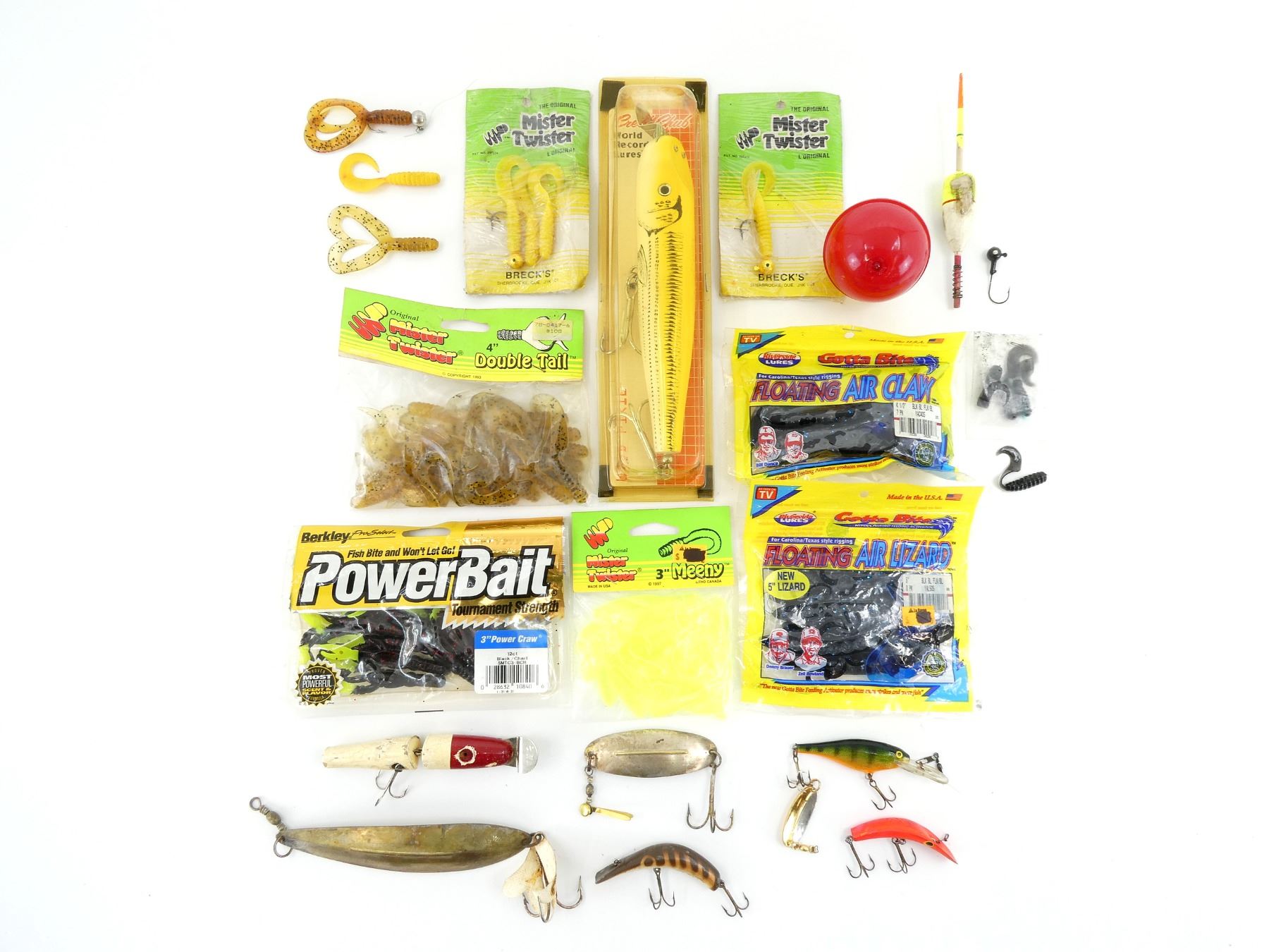 APPROX. (20) PIECES, INCLUDES; FISHING LURES, BOBBINS, PACKAGES OF MISTER TWISTER RUBBER WORMS, PACKAGE OF GOTTA BITE FLOATING AIR CLAWS, PACKAGE OF GOTTA BITE FLOATING AIR LIZARDS, PACKAGE OF POWER BAIT POWER CLAWS, ETC., VARIOUS SIZES / COLOURS / MFGS, SOME NOS, SOME SHOW WEAR & TEAR SEE PHOTOS.
