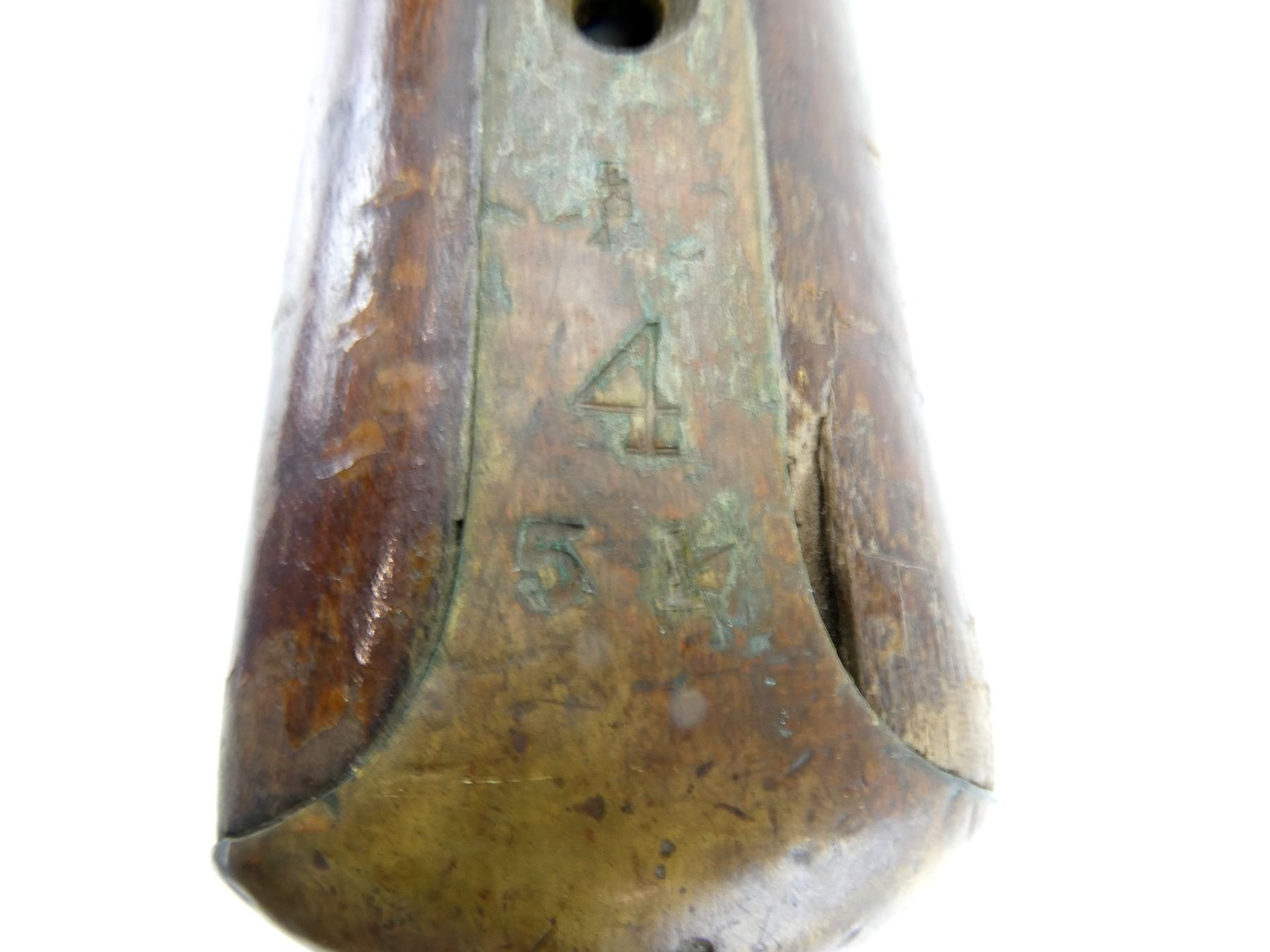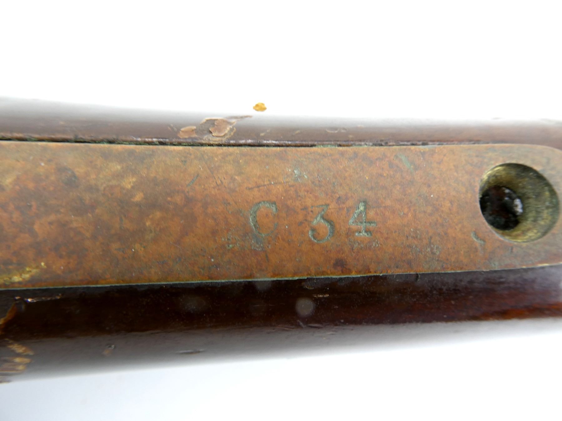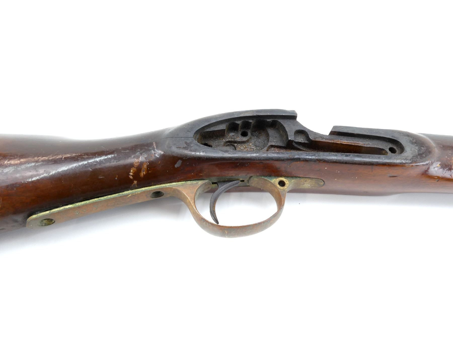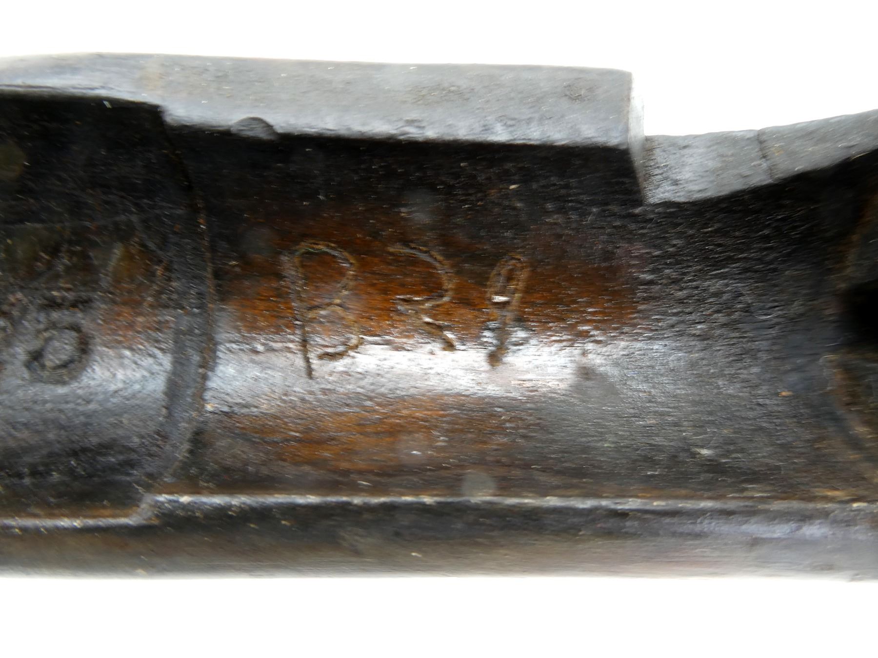 (1) SNIDER ENFIELD 3-BAND RIFLE STOCK, WOOD / BRASS CONSTRUCTION, WITH BRASS NOSE CAP, BRASS TRIGGER GUARD, TRIGGER & BRASS BUTT PLATE, BUTT PLATE MARKED: "E" OVER CROWN OVER "42" OVER "4" OVER "51", BUTT STOCK MARKED: "25" & "40", TRIGGER GUARD MARKED: "E" OVER CROWN OVER "29" & "C34", TOP MARKED: "25" & "B29", NOSE CAP MARKED: "E" OVER CROWN OVER "28", SHOWS WEAR & TEAR, WITH SOME CHIPS, OAL APPROX. 51", MAY REQUIRE FITTING. SEE PHOTOS.