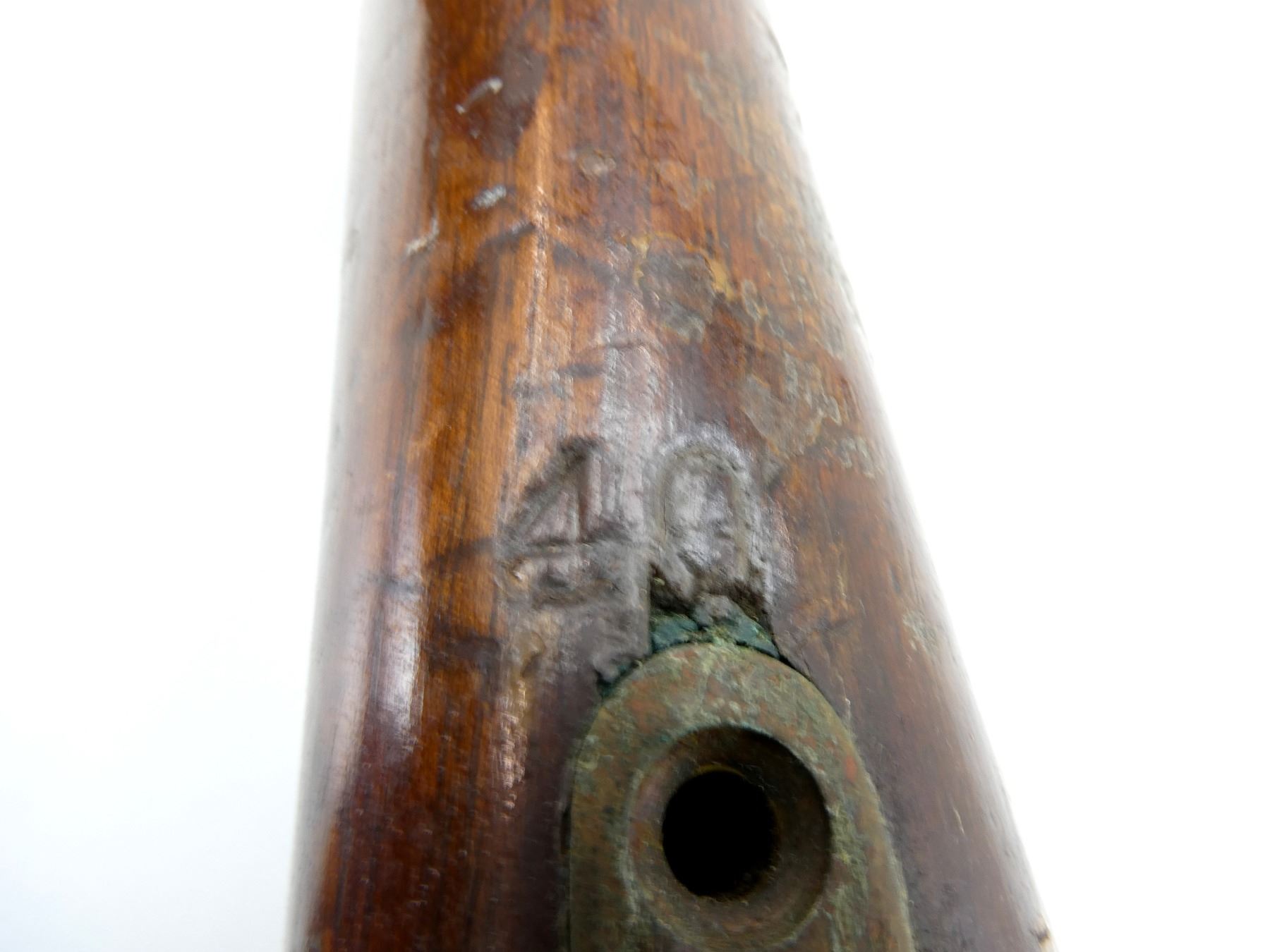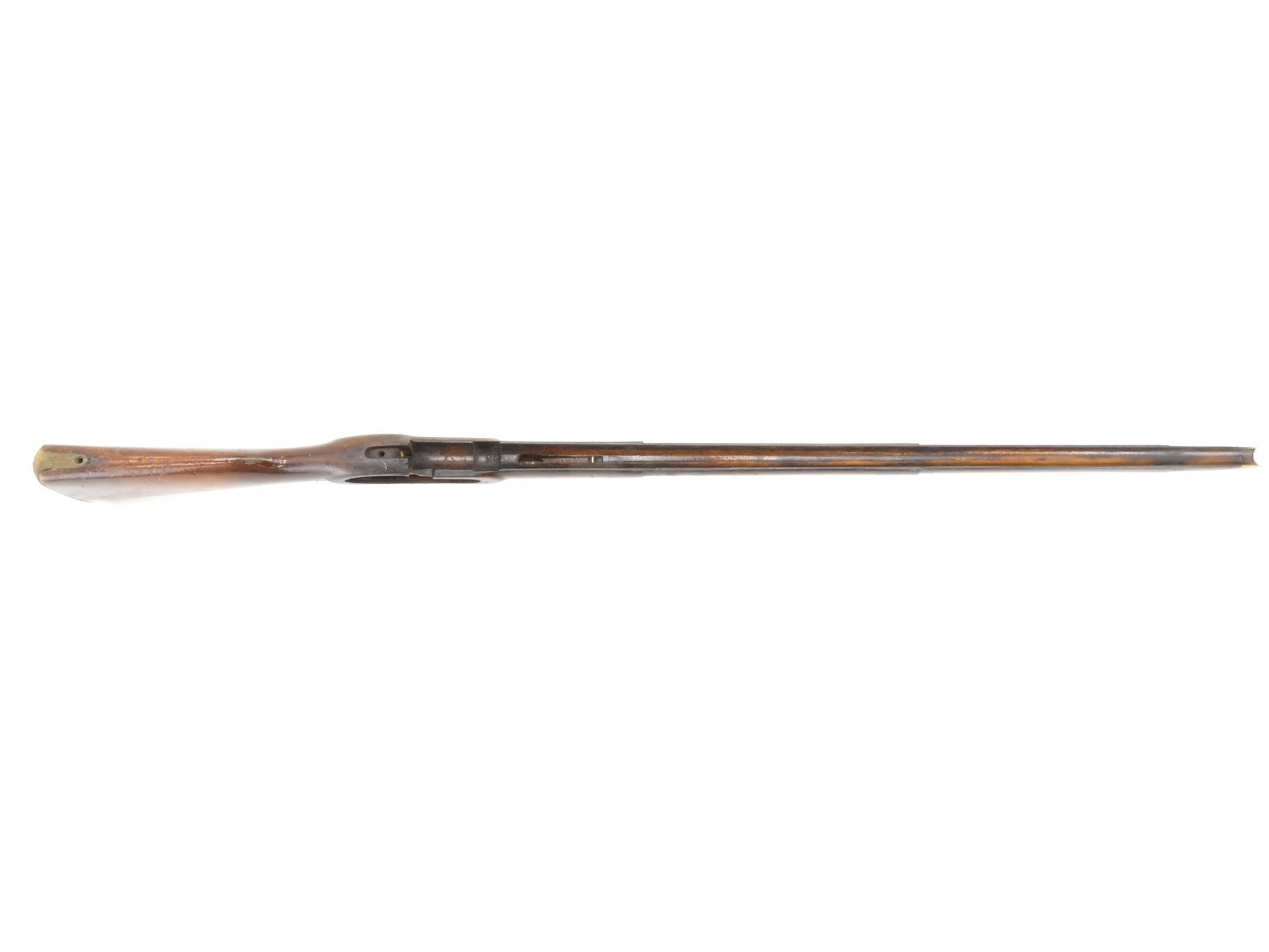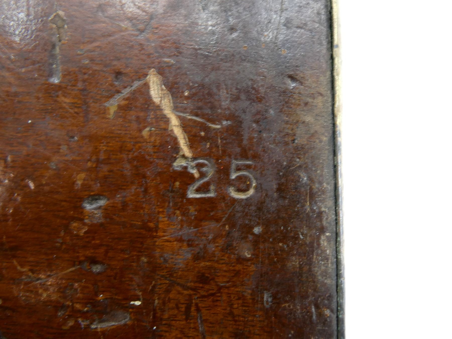 (1) SNIDER ENFIELD 3-BAND RIFLE STOCK, WOOD / BRASS CONSTRUCTION, WITH BRASS NOSE CAP, BRASS TRIGGER GUARD, TRIGGER & BRASS BUTT PLATE, BUTT PLATE MARKED: "E" OVER CROWN OVER "42" OVER "4" OVER "51", BUTT STOCK MARKED: "25" & "40", TRIGGER GUARD MARKED: "E" OVER CROWN OVER "29" & "C34", TOP MARKED: "25" & "B29", NOSE CAP MARKED: "E" OVER CROWN OVER "28", SHOWS WEAR & TEAR, WITH SOME CHIPS, OAL APPROX. 51", MAY REQUIRE FITTING. SEE PHOTOS.