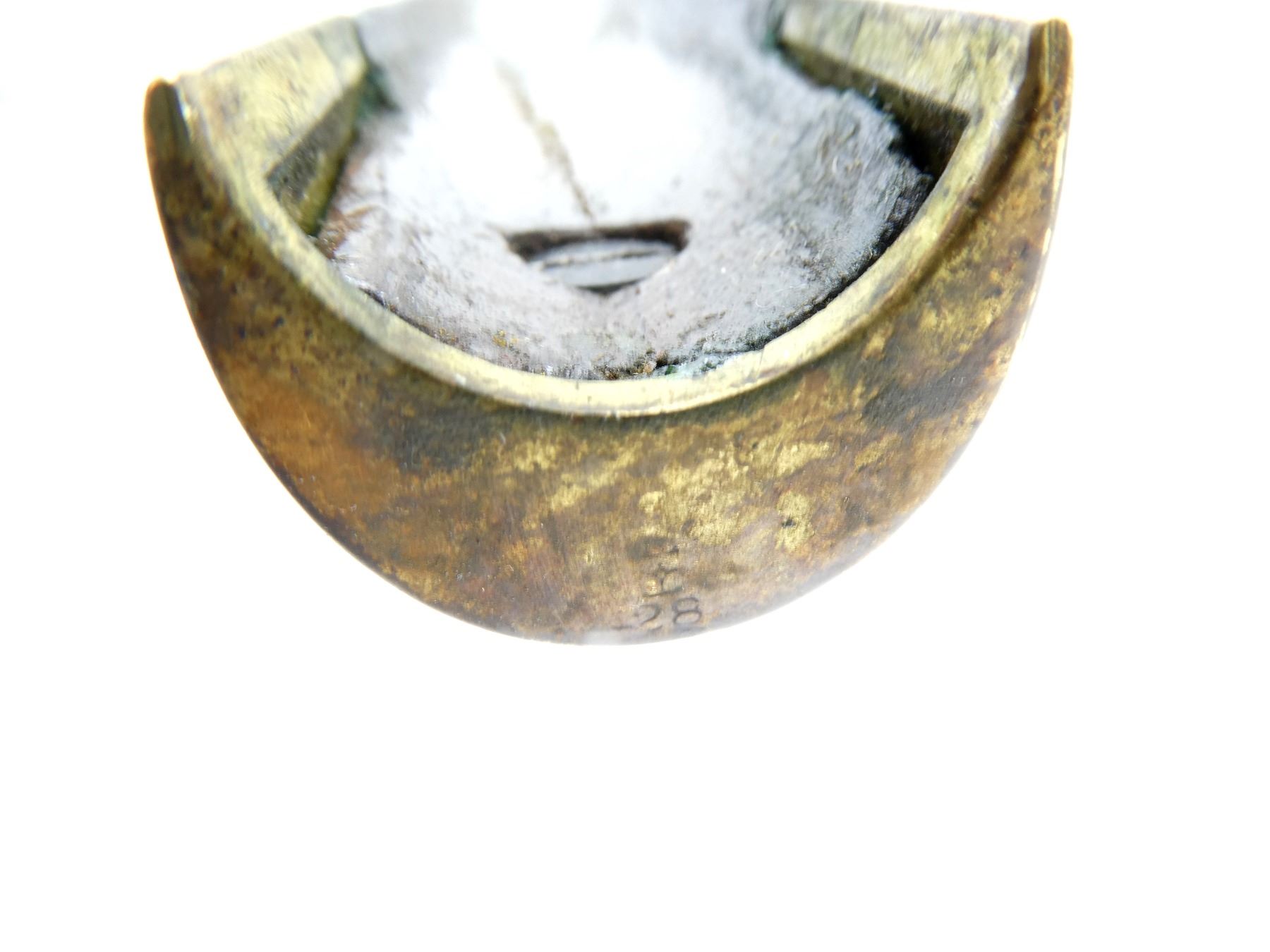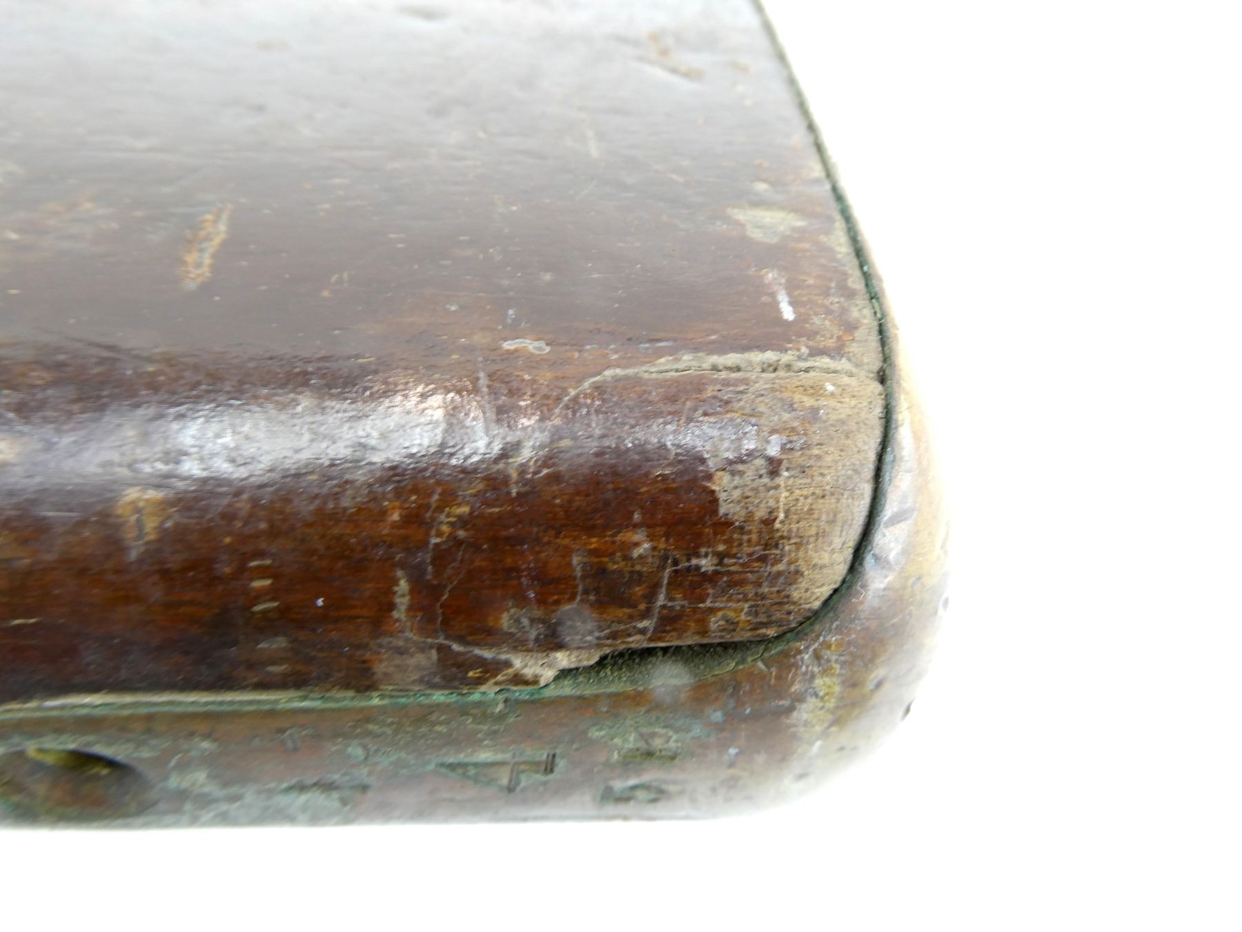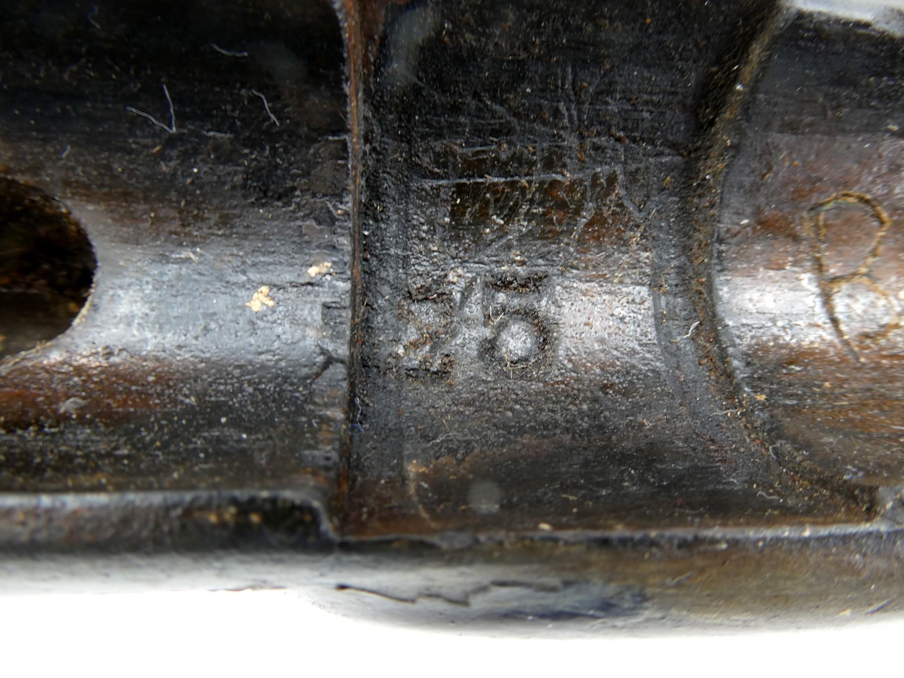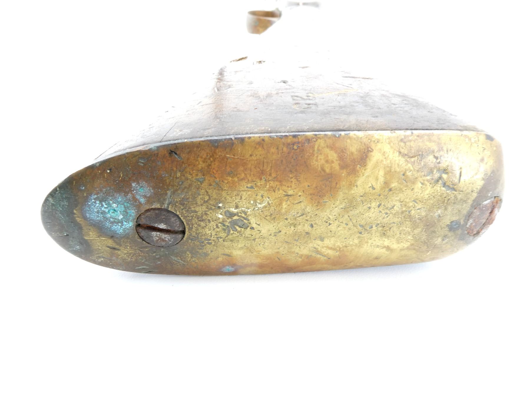 (1) SNIDER ENFIELD 3-BAND RIFLE STOCK, WOOD / BRASS CONSTRUCTION, WITH BRASS NOSE CAP, BRASS TRIGGER GUARD, TRIGGER & BRASS BUTT PLATE, BUTT PLATE MARKED: "E" OVER CROWN OVER "42" OVER "4" OVER "51", BUTT STOCK MARKED: "25" & "40", TRIGGER GUARD MARKED: "E" OVER CROWN OVER "29" & "C34", TOP MARKED: "25" & "B29", NOSE CAP MARKED: "E" OVER CROWN OVER "28", SHOWS WEAR & TEAR, WITH SOME CHIPS, OAL APPROX. 51", MAY REQUIRE FITTING. SEE PHOTOS.