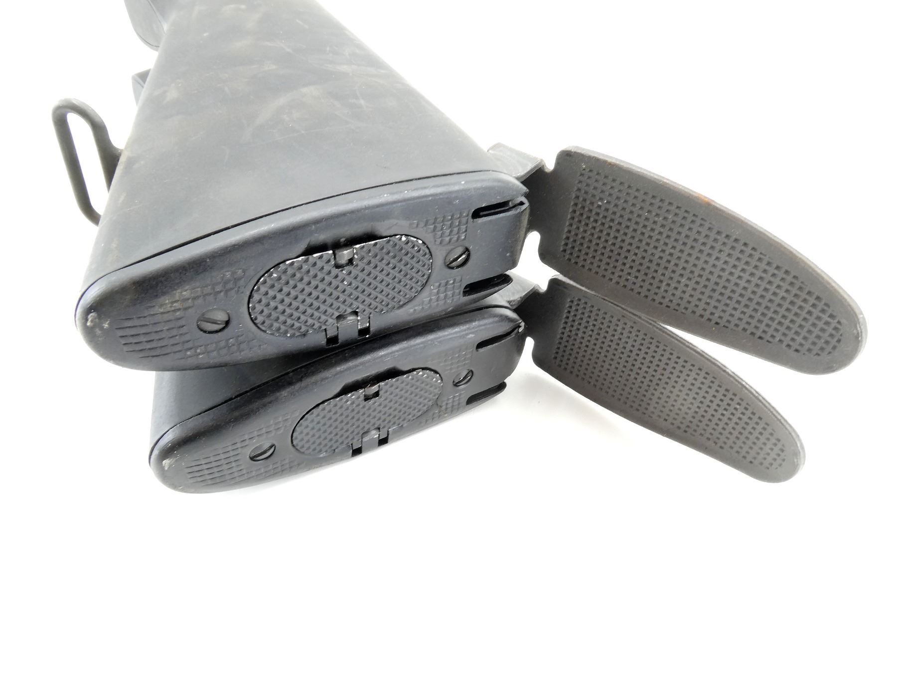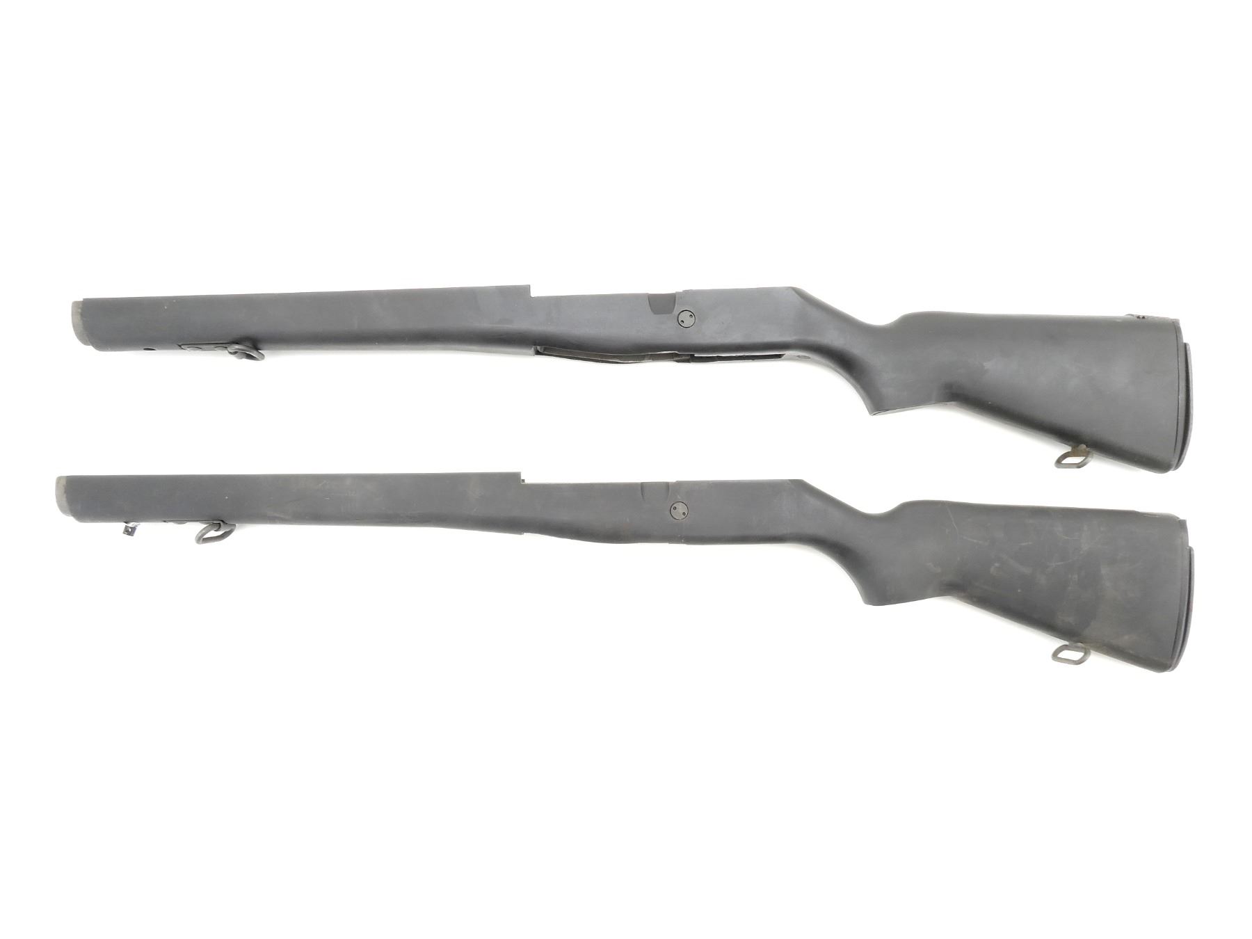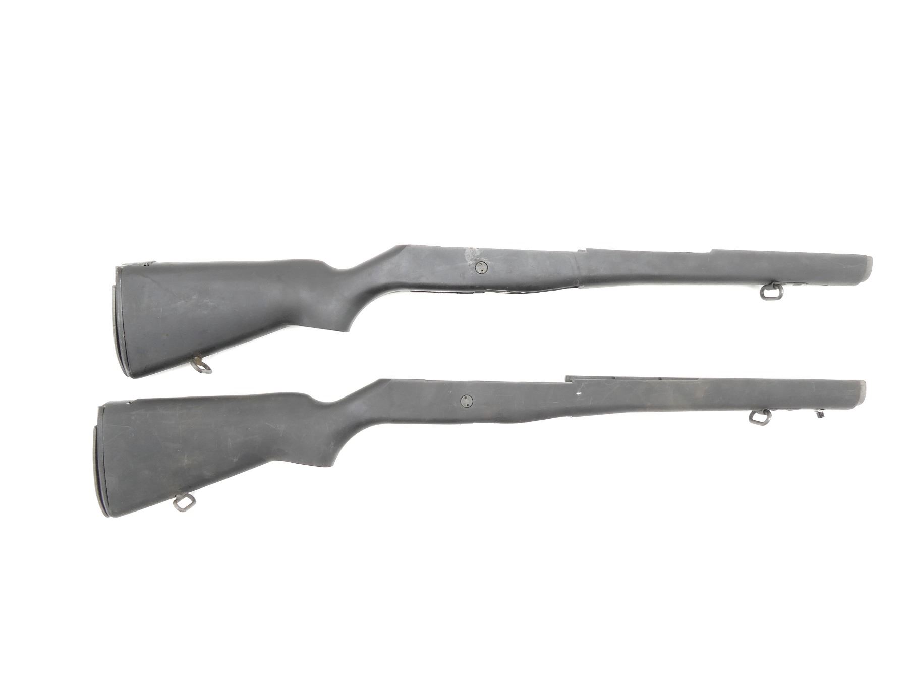LOT INCLUDES; (2) BLACK SYNTHETIC RIFLE STOCKS, WITH PISTOL GRIP, BUTT PLATE WITH SHOULDER REST, STOCK LINER & SLING SWIVEL, EACH INCLUDES ONE CLEANING KIT, OAL APPROX. 33". MAY REQUIRE FITTING. SEE PHOTOS.