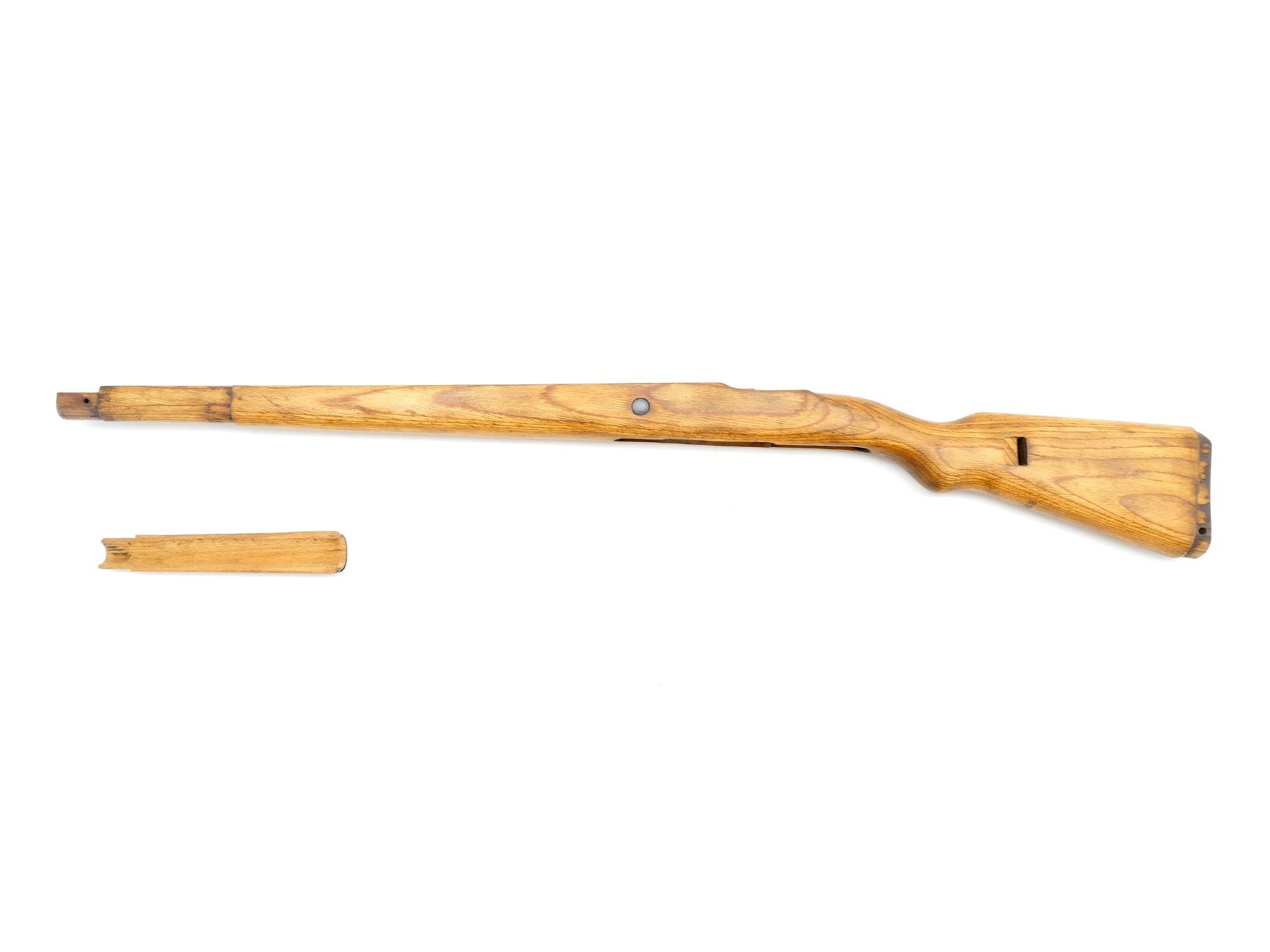 (1) WOODEN STOCK, RIGHT HANDED, SMOOTH, PISTOL GRIP, WITH WOOD HAND GUARD, MAY HAVE SMALL CRACKS & CHIPS / SHOWS WEAR / TEAR, UNMARKED, OAL APPROX. 38". MAY REQUIRE FITTING. SEE PHOTOS.