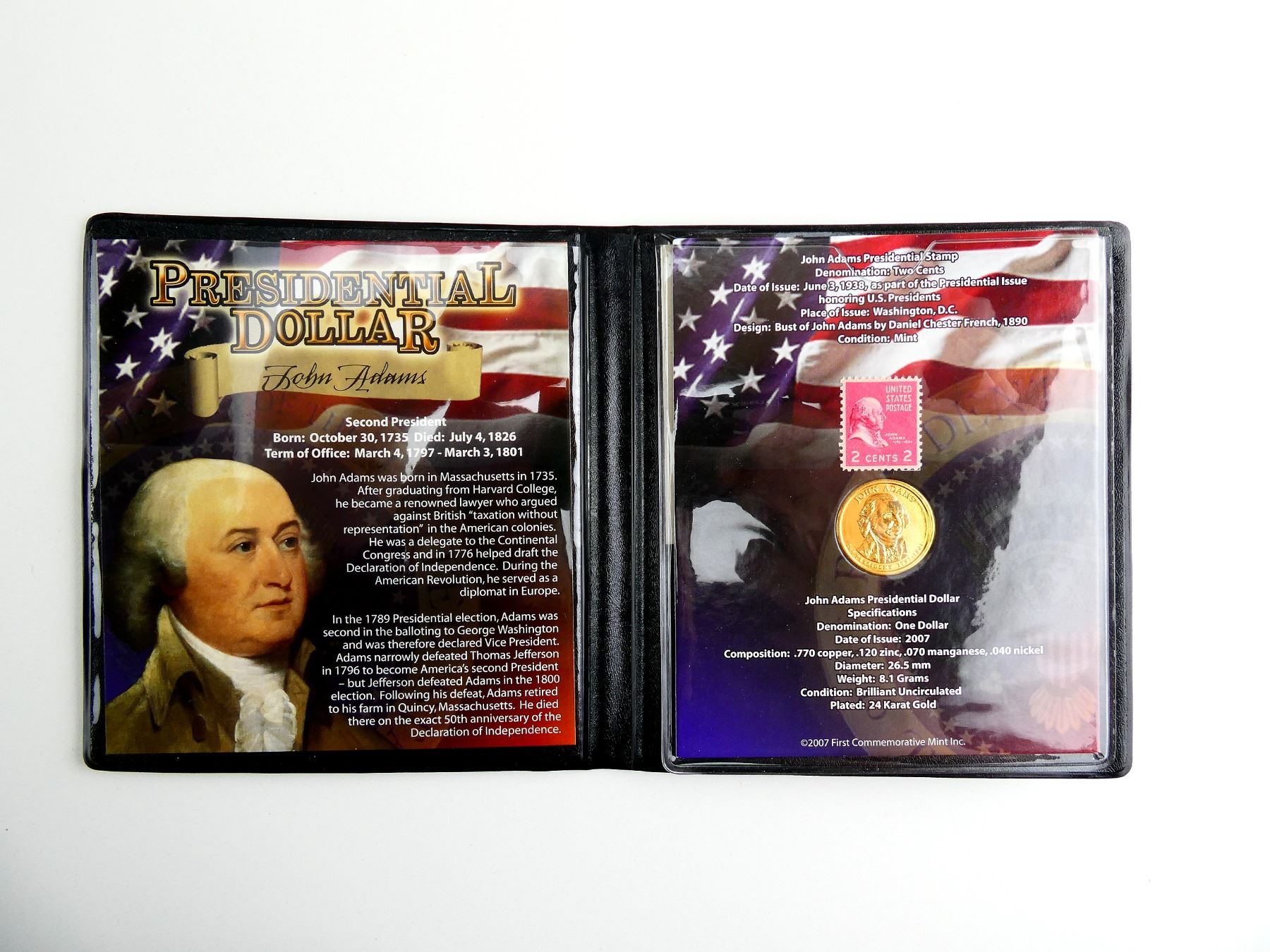 LOT INCLUDES; (1) JOHN ADAMS PRESIDENTIAL STAMP, ISSUED JUNE 3, 1938, AS PART OF THE PRESIDENTIAL ISSUE HONORING U.S. PRESIDENTS & (1) JOHN ADAMS PRESIDENTIAL DOLLAR, ISSUED 2007, UNCIRCULATED, 24 KARAT GOLD PLATED, APPROX. 26.5MM DIA., ALL PIECES IN PROTECTIVE CASE, WITH INFORMATION ABOUT EACH PIECE & CERTIFICATE OF AUTHENTICITY. SEE PHOTOS.