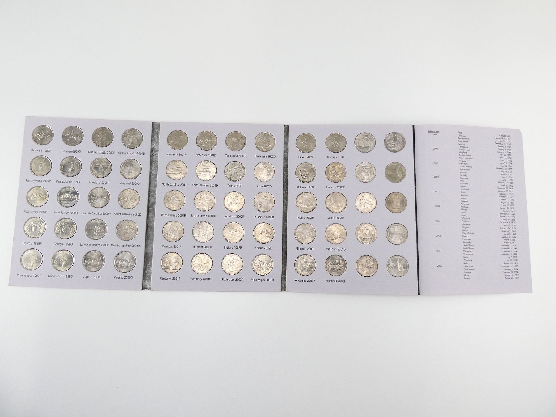 LOT INCLUDES; APPROX. (60) STATE QUARTERS, MINTED IN PHILADELPHIA & DENVER, DATED 1999 TO 2003, ALL SET IN CARDBOARD BOOKLET WITH INFORMATION SHEET INSIDE. SEE PHOTOS.