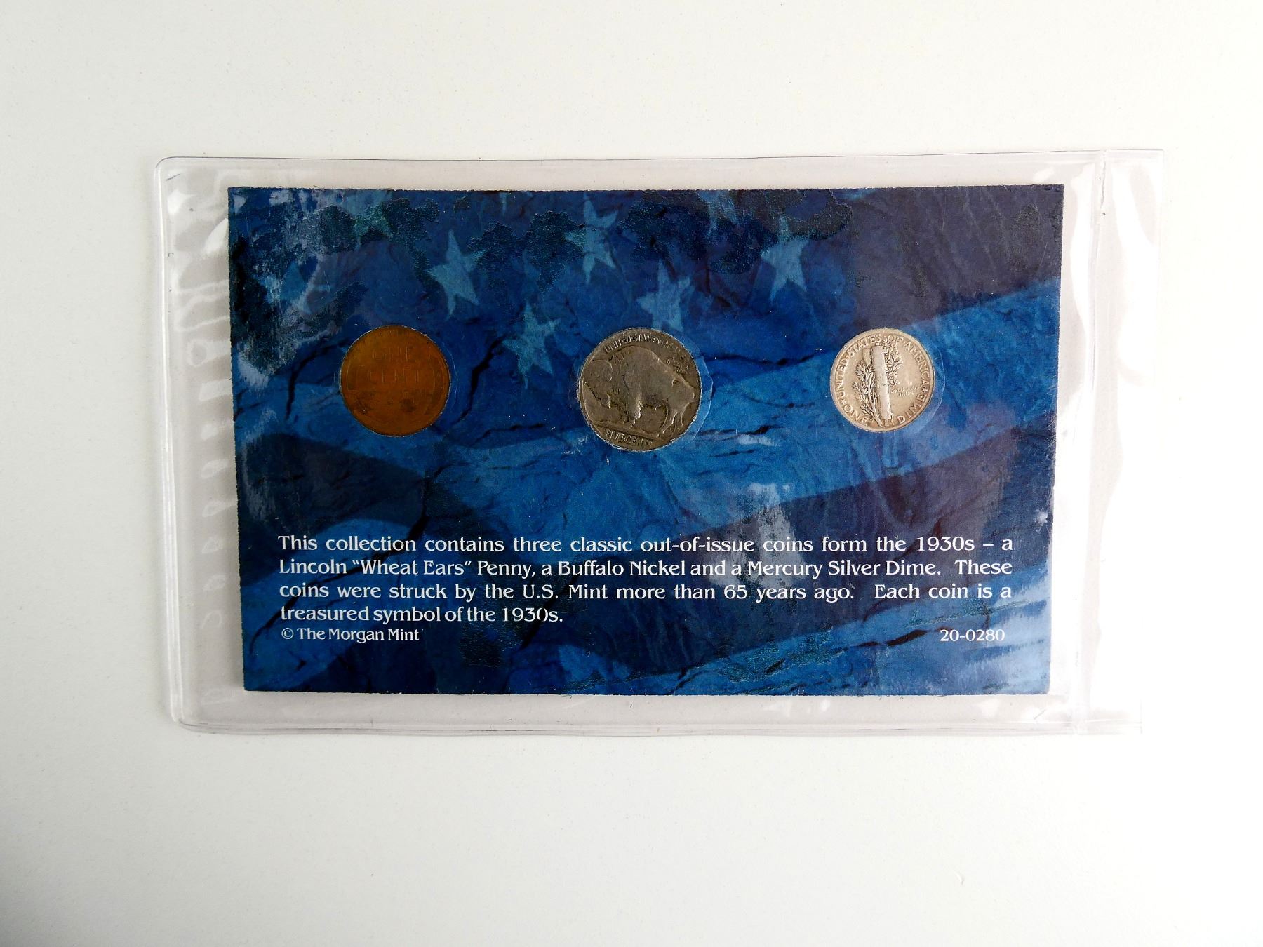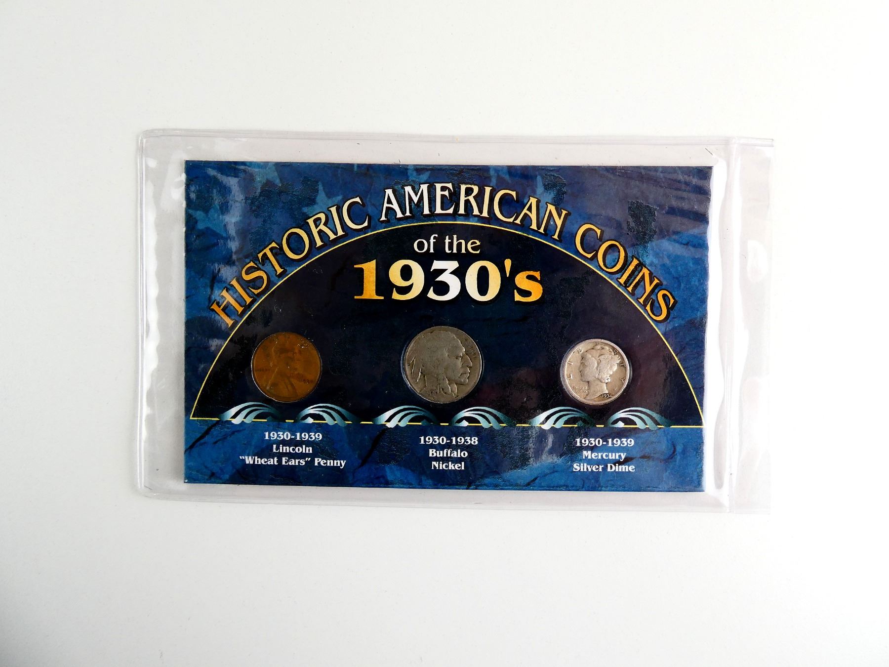 LOT INCLUDES; (1) LINCOLN "WHEAT EARS" PENNY, DATED 1934, (1) BUFFALO NICKEL, DATED 1930 & (1) MERCURY SILVER DIME, DATED 1934, ALL OUT OF ISSUE COINS, SET IN CARDBOARD WITH VARIOUS INFORMATION. SEE PHOTOS.