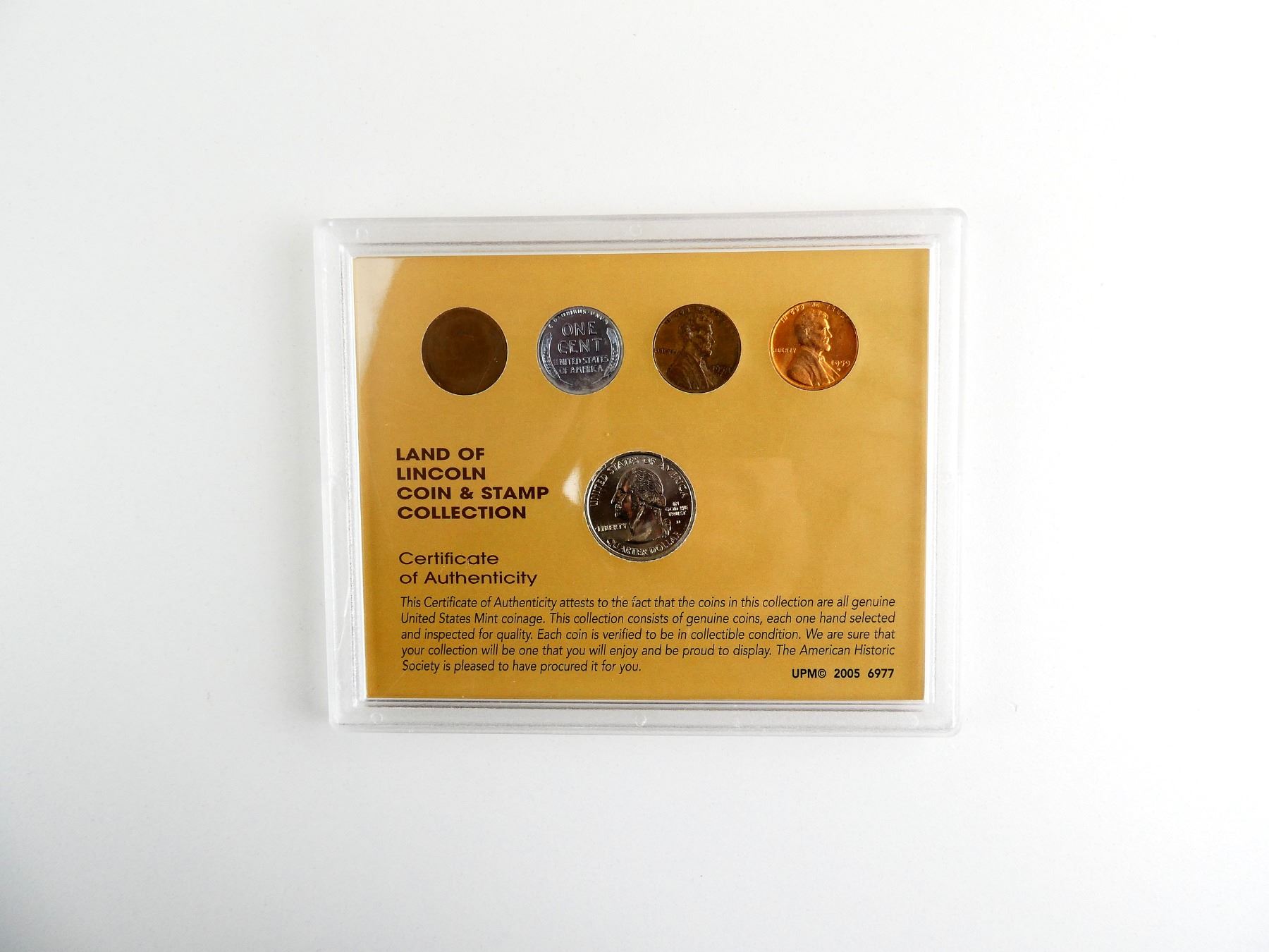 LOT INCLUDES; (1) 1909 DATED FIRST YEAR LINCOLN COIN, (1) 1943 DATED STEEL CENT, (1) 1958 DATED LAST YEAR WHEAT CENT, (1) 1959 DATED LINCOLN MEMORIAL CENT, (1) 2003 DATED ILLINOIS STATE QUARTER & (1) ABRAHAM LINCOLN 4 CENT STAMP, ALL IN PROTECTIVE CASE WITH CERTIFICATE OF AUTHENTICITY. SEE PHOTOS.