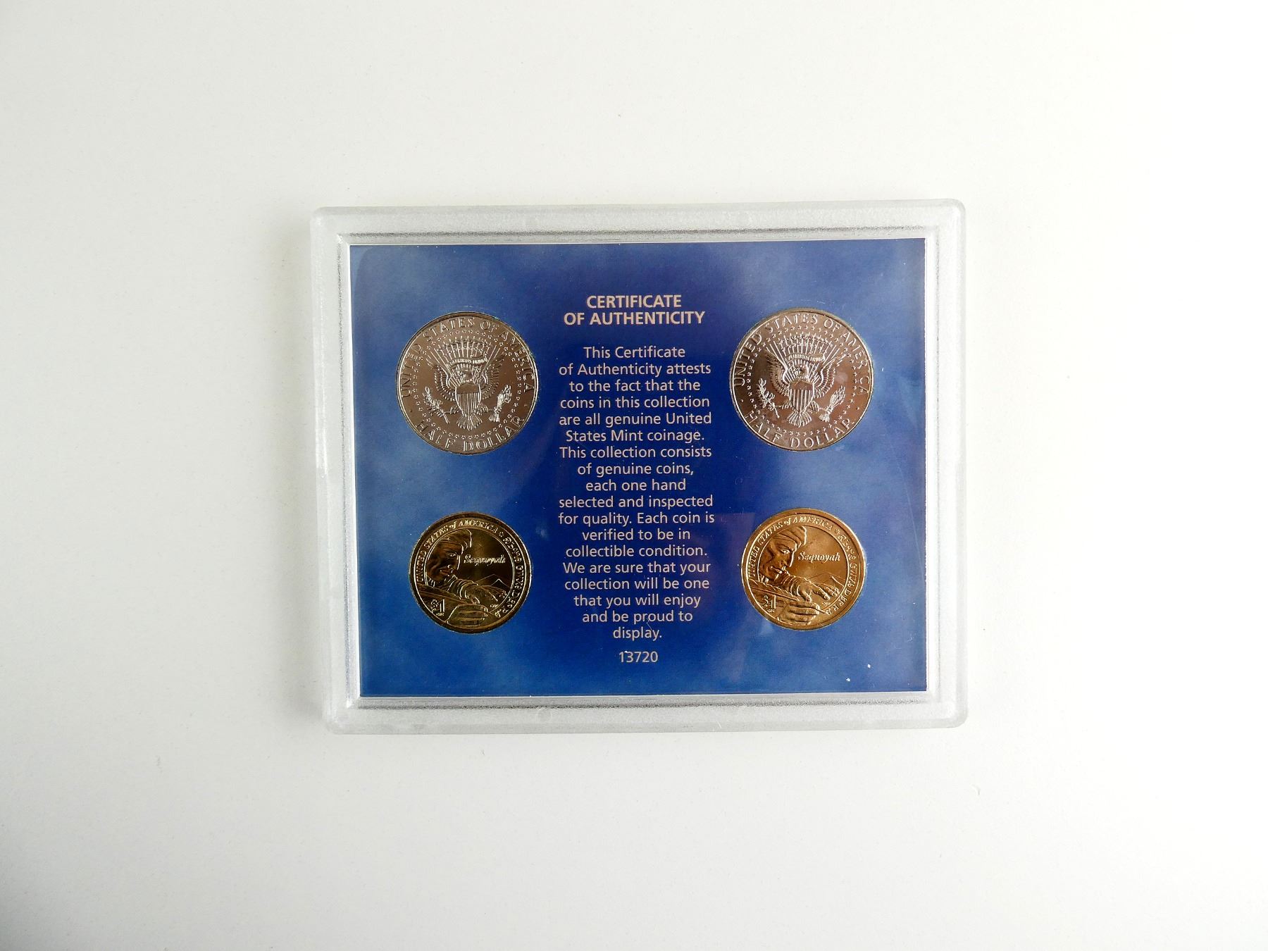 LOT INCLUDES; (2) NATIVE AMERICAN DOLLARS, ONE PHILADELPHIA MINT, ONE DENVER MINT & (2) JFK HALF DOLLARS, ONE PHILADELPHIA MINT, ONE DENVER MINT, ALL IN PROTECTIVE CASE & WITH CERTIFICATE OF AUTHENTICITY. SEE PHOTOS.