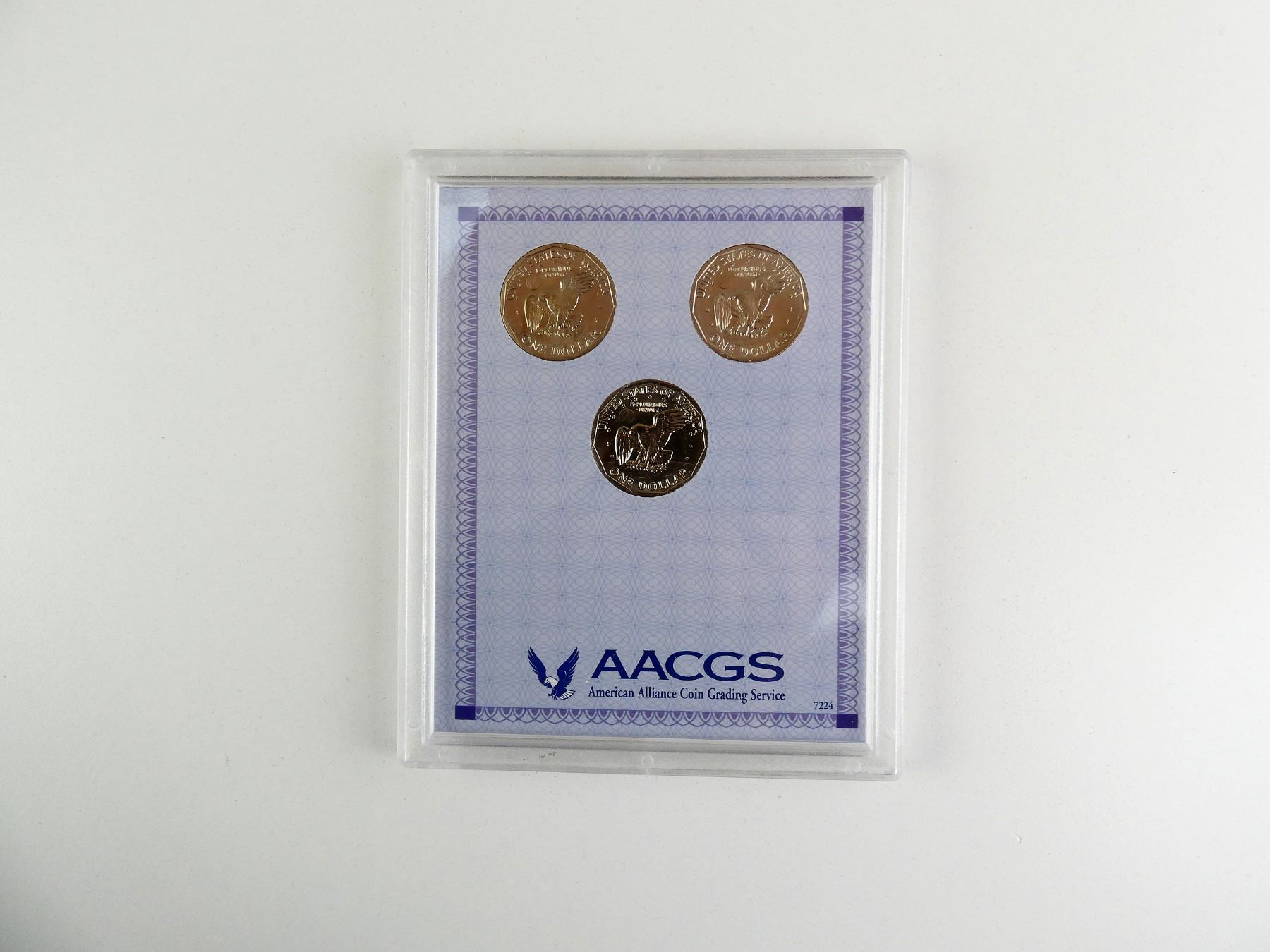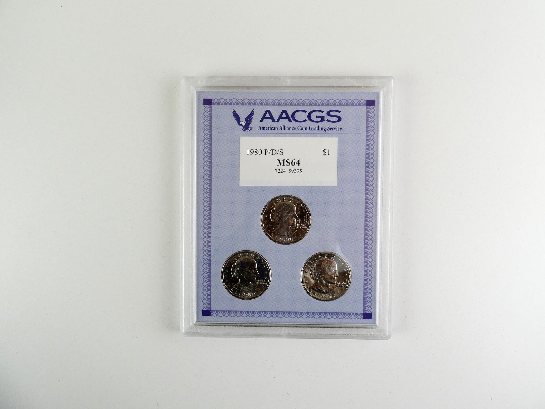 LOT INCLUDES; (3) SUSAN B. ANTHONY ONE DOLLAR COINS, ALL DATED 1980, ONE MINTED BY PHILADELPHIA, ONE MINTED BY DENVER, ONE MINTED BY SAN FRANCISCO, ALL IN PROTECTIVE CASE. SEE PHOTOS.