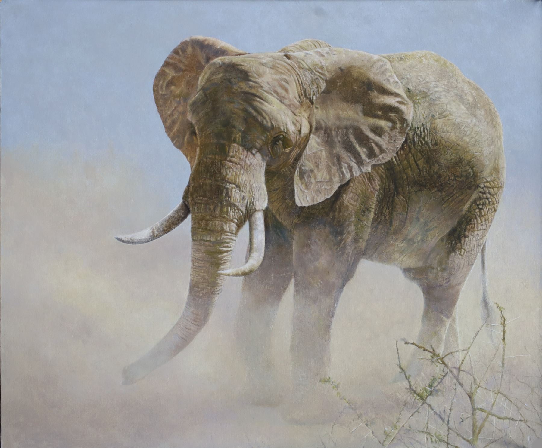 "Tembo" - Original oil on canvas by wildlife artist Eleazar Saenz, measures 34"x30" framed. Saenz is a wildlife artist who captures in his images a piece of wildlife and shares it with the viewer. He is well known for his versatility and wide range of subjects and mediums including, wildlife paintings, murals, dioramas and portraits. eleazarsaenz@yahoo.com.