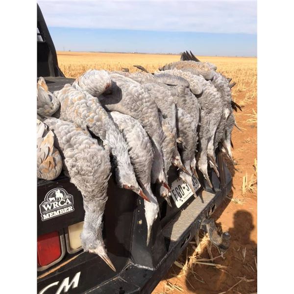 barn or we will take you to taste the cuisine at some of our favorite restaurants. The Diamond Wing Outfitters staff and guides will give you a fun filled trip while you enjoy gorgeous sunrises and good company! Each evening your guide will provide you with the pin location of where the next day's hunt will be after they have scouted the best location to take our chances with this migratory species. Near or Far we can drive upto an hour away to find the biggest group of cranes possible, but the spread will be set and ready for you when you arrive! Typically we hunt out of layout blinds or aframe style brushed blinds along irrigation turrets or ditches. (“There ain’t much to hide behind in West Texas”) Limits are 3 cranes daily and 5 lesser canadians per hunter, with that said if you’re a bird hunter you know how migratory birds can be and sandhill cranes are a notoriously difficult bird to decoy. With our experienced crew we will use our knowledge to the best of our ability for you to enjoy the beautiful sight and sound of these cranes as they pile into the region for their migration farther south. We typically finish hunting around 11am - Noon each day. This gives you ample time to get back to the hotel, grab lunch in town and take a nap before we join you for dinner and the hunting stories can commence. So, grab your shotgun and join us in and around beautiful Canyon, Texas for a trip to remember! We kindly request no repeat buyers & auctioned hunts cannot be combined.