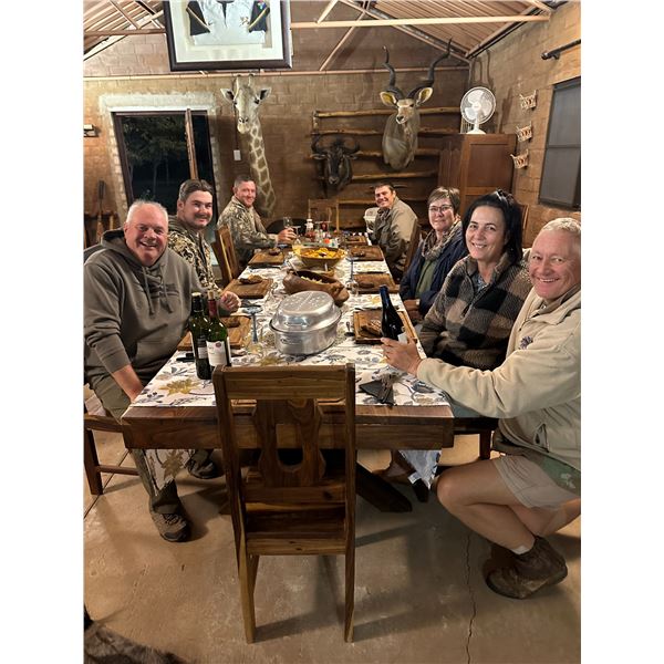 Value: $7495 Package includes: 1 hunter & 1 non hunter. Lodging, meals & beverages, professional hunters, field prep, trackers, skinners, transport during hunt, laundry service, 6 cull animals with choice from Eland Kudu, Giraffe, Blue Wildebeest, Gemsbuck, warthog, and impala. All of these animals are exportable. Not included: Tips to guides & staff, transportation to/from camp ( $500 transfer from windhoek) , airport pickup/dropoff, gun rental ($250/gun), and taxidermy/shipping.