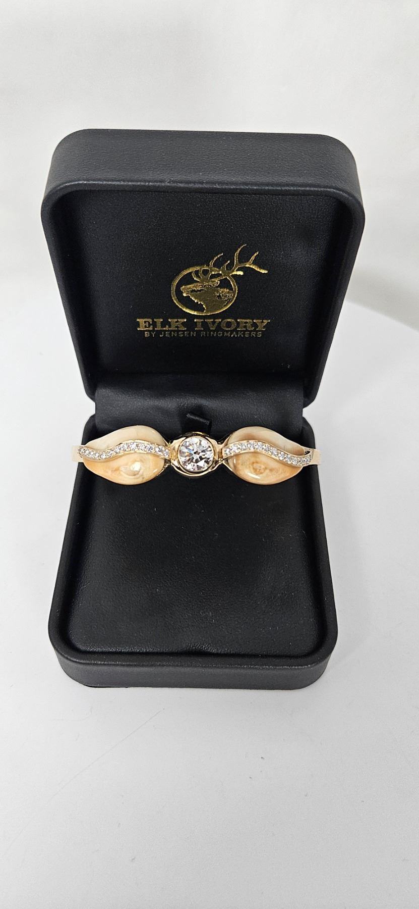 This custom 1 of 1 elk ivory "Luna" bracelet features 2.75 ctw lab grown diamonds set in 14k yellow gold. Bid today and make this timeless, one-of-a-kind beauty yours! Jensen Ringmakers - "The beauty of the great outdoors is unsurpassable, but that doesn't stop us from trying." DALLAS SAFARI CLUB THANKS JENSEN RINGMAKERS FOR THIS 100% DONATION. Erik Armijo, 208-734-7933, erik@jensen-jewelers.com, www.ElkIvory.Com, BOOTH #2541.