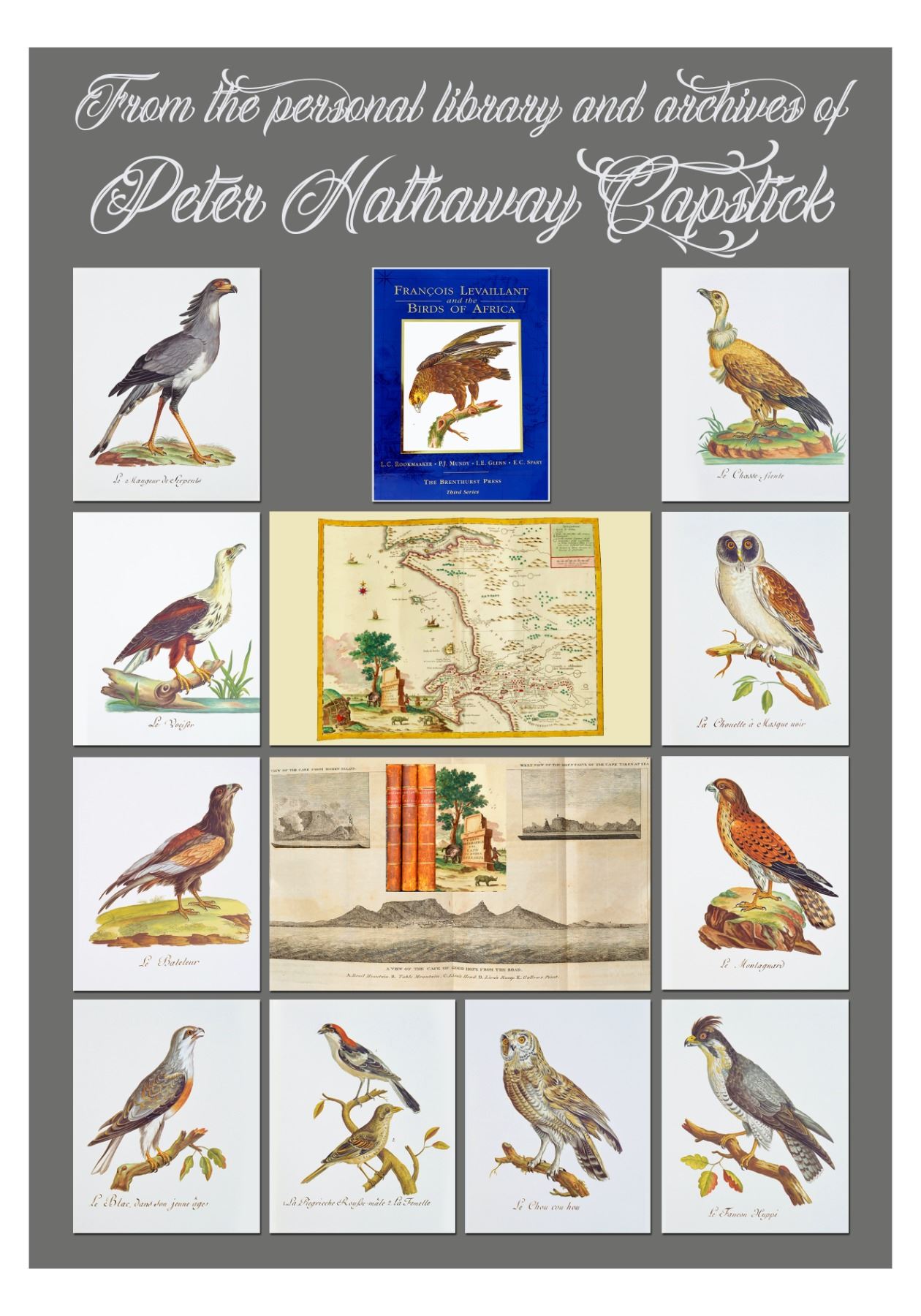 The CAPSTICK donation this year is truly historic as it brings together four very scarce items linking the Dallas Safari Club and DSC Foundation with the most extensive and valuable repository of books, manuscripts, correspondence, maps and artwork, all revolving around a renowned and highly controversial 19th century Frenchman, François Levaillant - pioneering traveler in South Africa, explorer, naturalist, zoological collector, skilled taxidermist and true pioneer of African ornithology. The very scarce 1740 map of the Western Cape of South Africa, entirely in Italian as it was published in Florence, is hand-colored and framed in oak. Levaillant would certainly have consulted this map before arriving in Cape Town in April 1781. The three-volume calf-bound set, printed in 1796, details Levaillant's travels and exploration in the Western Cape from 1783 to 1785; a folding map and twenty-two engraved plates enhance this historic work. An impressive, sumptiously illustrated biography of African travel and adventure entitled FRANCOIS LEVAILLANT AND THE BIRDS OF AFRICA was produced by The Brenthurst Press in 2004 in a strictly limited edition of 1070 books and is one of only 850 standard copies bound in cloth. The accompanying fifty-seven, full-color African bird paintings in five folders, produced together with the biography, are based on Levaillant's orignial water color paintings, which are one of the jewels in the Brenthurst Library. The paintings, all copyrighted to the Oppenheimer family of gold and diamond fame, were never published before this exquisite, limited edition. These treasures, from Peter CAPSTICK's personal archives, epitomize the African safari...fish eagle as they ignite the African skies, vultures squabbling over a carcass, turtle doves and their rippling calls at dawn, and the distant whoops of owls at night as safari fires crackle against the stars. DSC FOUNDATION THANKS FIONA CAPSTICK FOR THIS 100% DONATION. REFERENCE THE CHARITABLE DEDUCTION QUALIFICATIONS IN THE OFFICAL RULES SECTION OF THE AUCTION CATALOG.