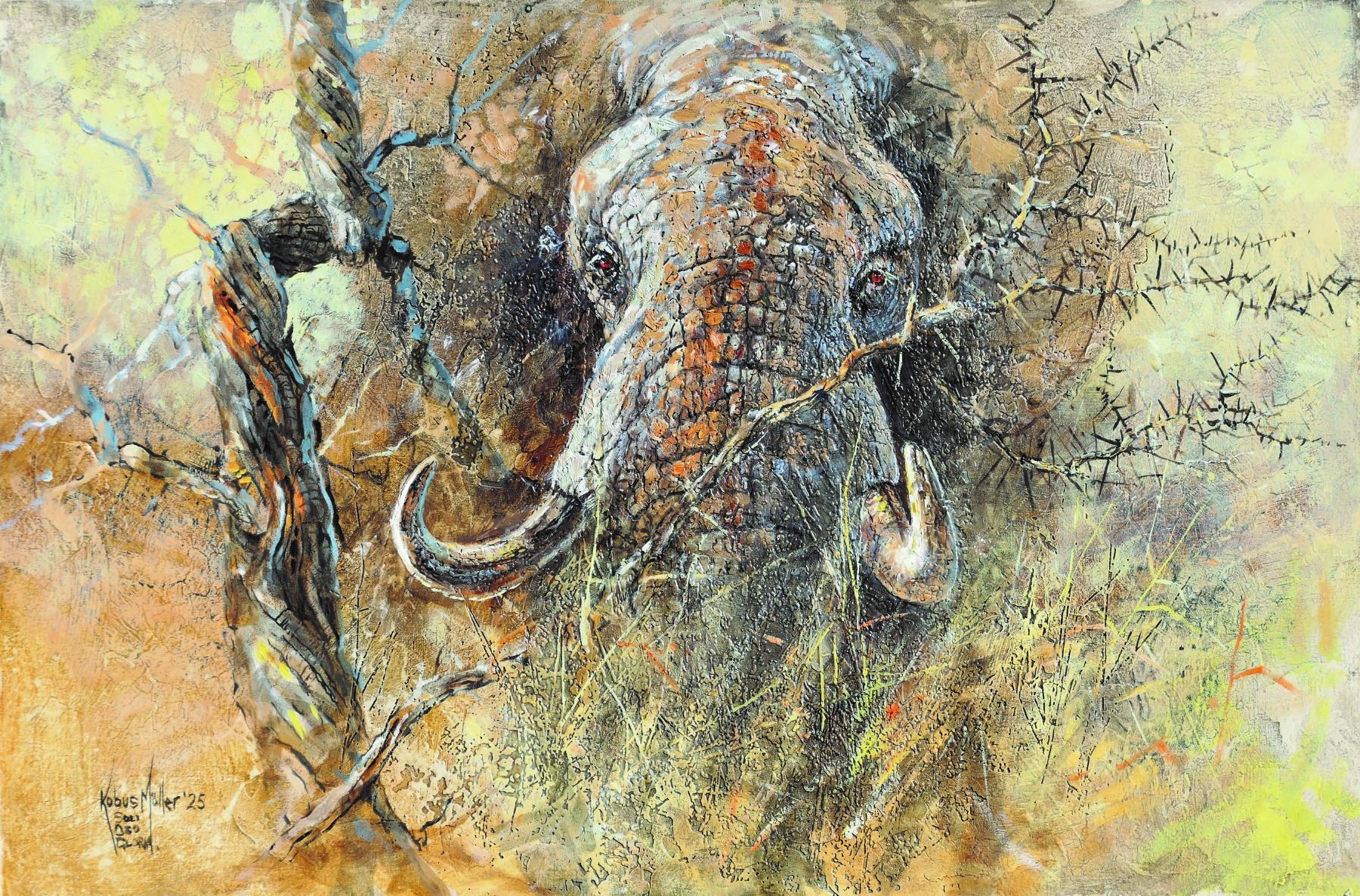 "Challenge Accepted" - Original painting by internationally acclaimed artist Kobus Moller, measures 36"x24". This stunning piece depicts a close, heart-stopping encounter with a charging elephant in the far northern Kruger. An experience that became one of the cornerstone stories in the artist's new large-format book, "Risk & Reward", a handcrafted, limited-edition collection of Moller's encounters with Africa's most iconic wildlife. Each story drawn from real experience, each painting inspired by moments where risk and grace met in the wild. Every copy is truly unique with each cover being an original oil painting, individually created and signed by hand so no two are alike. A signed & numbered limited edition copy is included which the artist/author will be happy to personalize for the winner at auction close. Kobus Moller, www.kobus@kobusmoller.com, BOOTH #1119.
