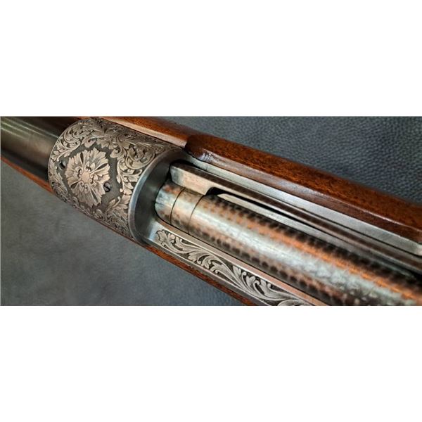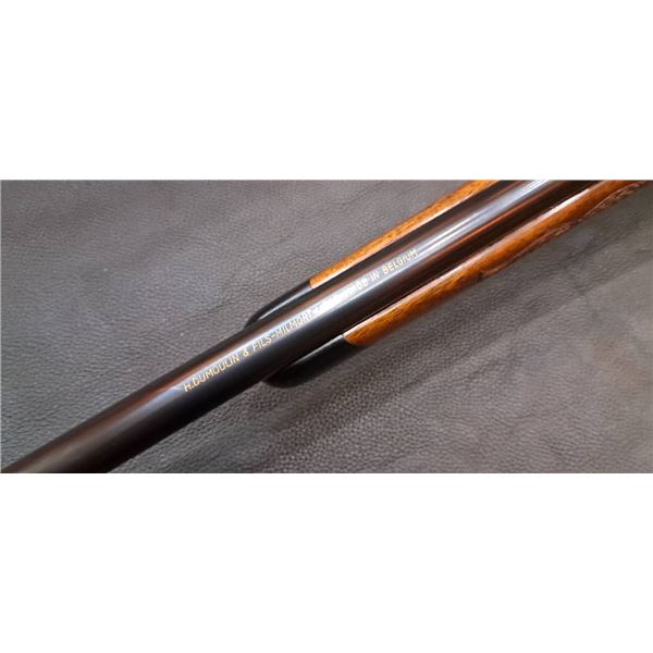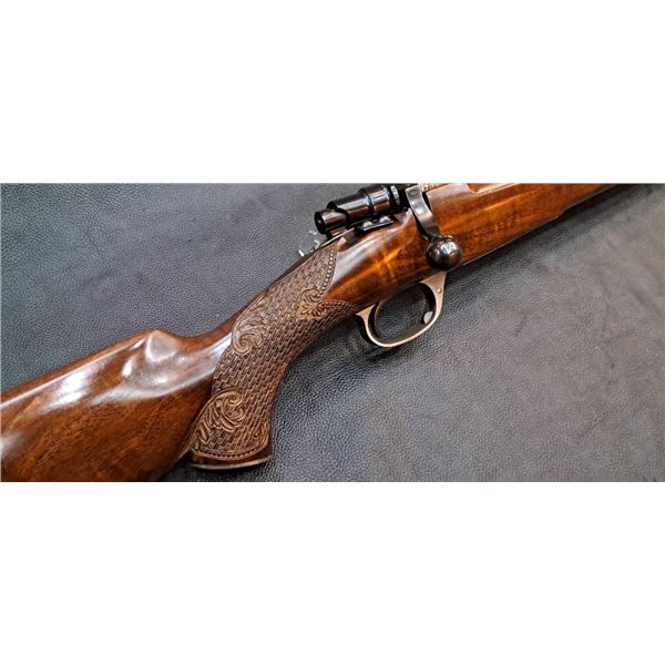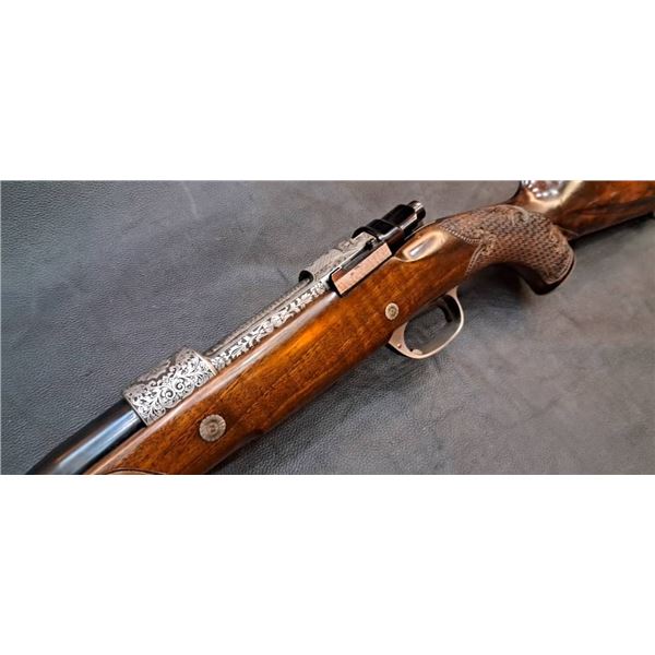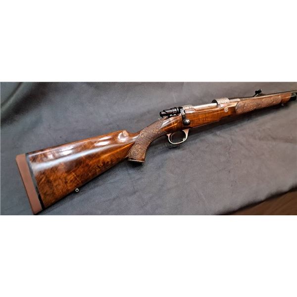 Exquisite rifle built by Dumoulin, Milmort, Liège, Belgium. This incredibly rare rifle is chambered in 7mm Remington Magnum and constructed on the legendary Santa-Barbara Action. It has been hand engraved by M. Dumoulin himself belonging to the 1980s Forest Series. The engraving mixes animal vignettes with traditional acanthus scrolls. The 26" barrel bears open metal sights and retains its original deep black gloss bluing. The CRF Mauser system used on that rifle retains indeed the classic long blade extractor while the bolt is fitted with a gracefully forged swept handle and a side safety secures the finely tuned single-stage trigger. Exquisite full-coverage hand engraving decorates the receiver and bottom metal, finished in classic French gray. The stock is carved from stunning golden French exhibition walnut with rich contrast and figure, styled in the unique quilted pattern with woven wicker style checkering. Note the well-done rollover cheekpiece, the wild board engraved grip cap and the trapezoidal black forend tip. A period-correct 1" ventilated recoil provides a 15" LOP. This rifle remains in near-new condition, showing no significant signs of use. Total weight: 8 lbs. A unique character of exceptional craftsmanship continental vintage rifle, superbly preserved that can offer a fine addition to any advanced firearms or commemorative collection. DALLAS SAFARI CLUB THANKS ARMURERIE ELYSEES FOR THIS 100% DONATION. Lyndze Daly, 719-373-8371, lyndze@armurerie-elysees.com, www.Armurerie-Elysees.Com, BOOTH #1573.